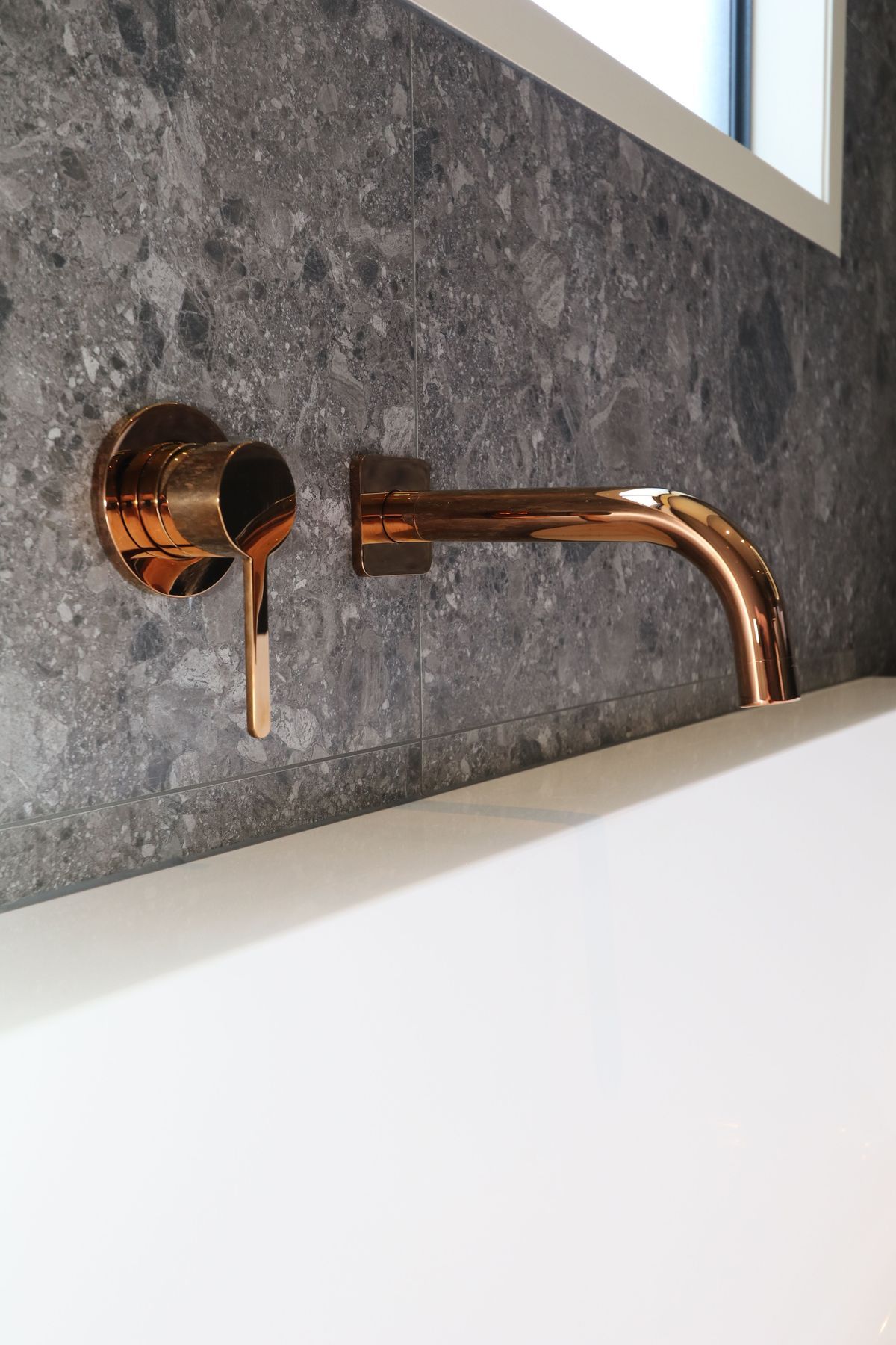 ArchiPro Project Summary - A striking bathroom design featuring Elite Bathroomware’s polished copper tapware, complemented by warm LED lighting and dark moody tiles, creating an atmospheric space that highlights unique design elements with a bold, sophisticated aesthetic.