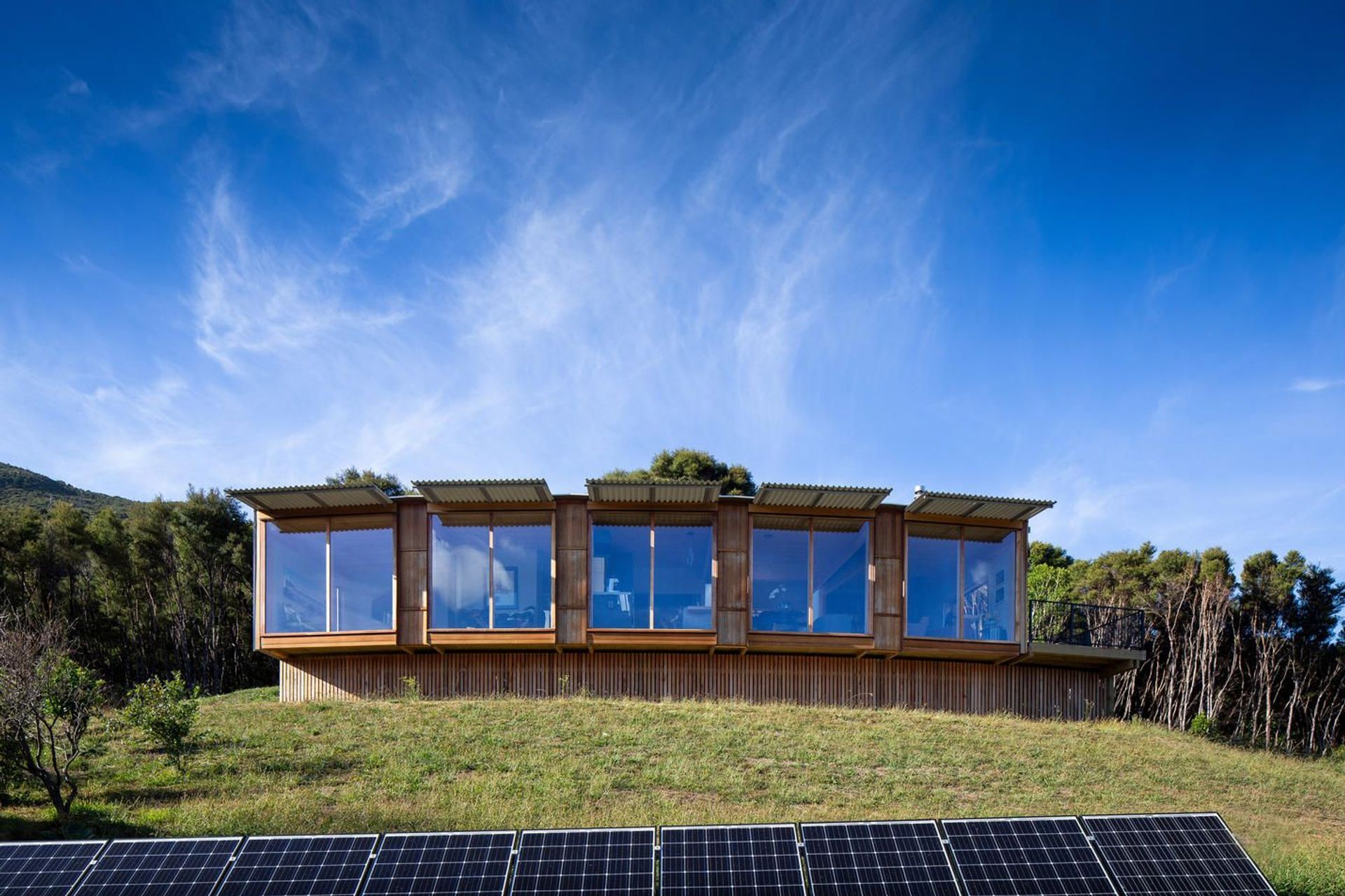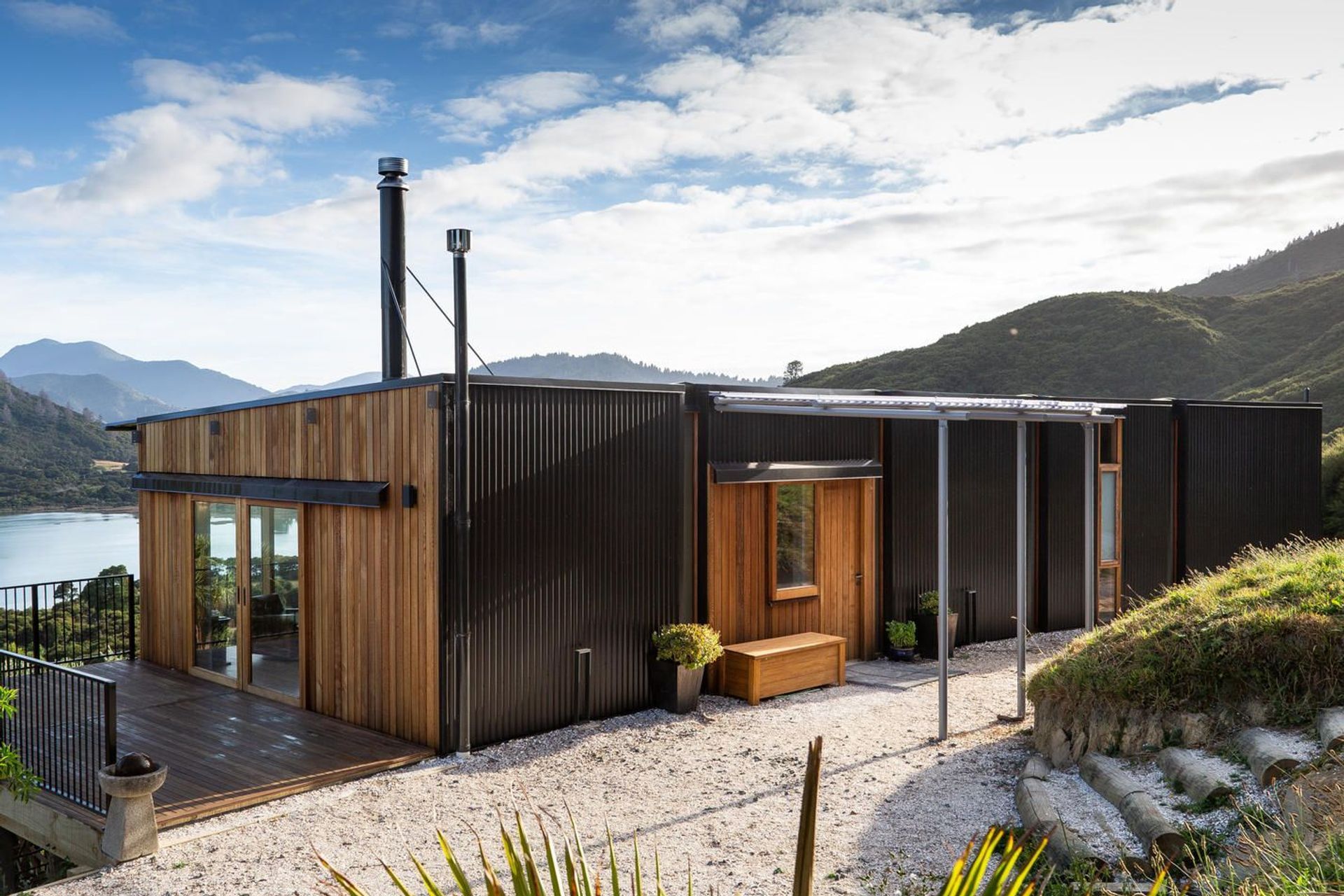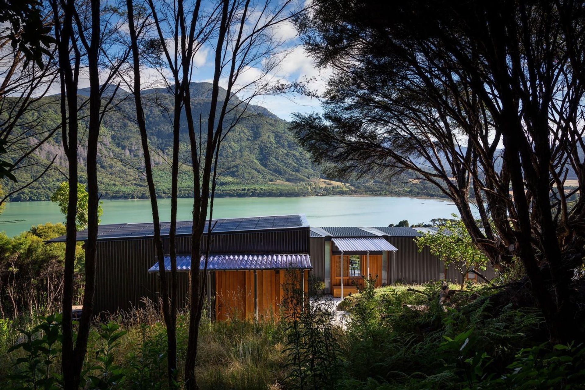 ArchiPro Project Summary - Ngāhere Hou: A sustainable off-grid retreat featuring a two-bedroom house and separate guest room, designed to embrace stunning views of Kenepuru Sounds while addressing the logistical challenges of remote construction.