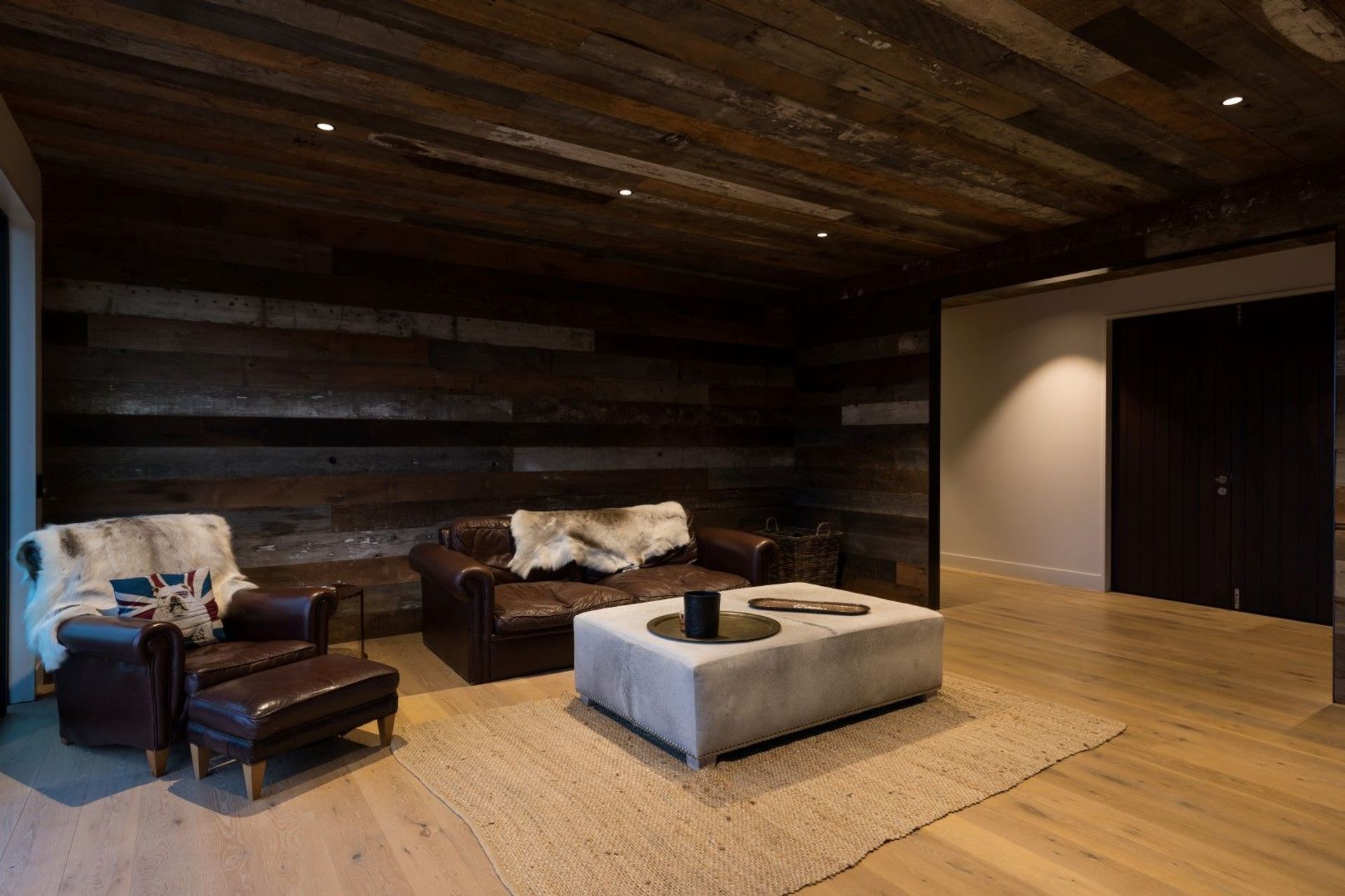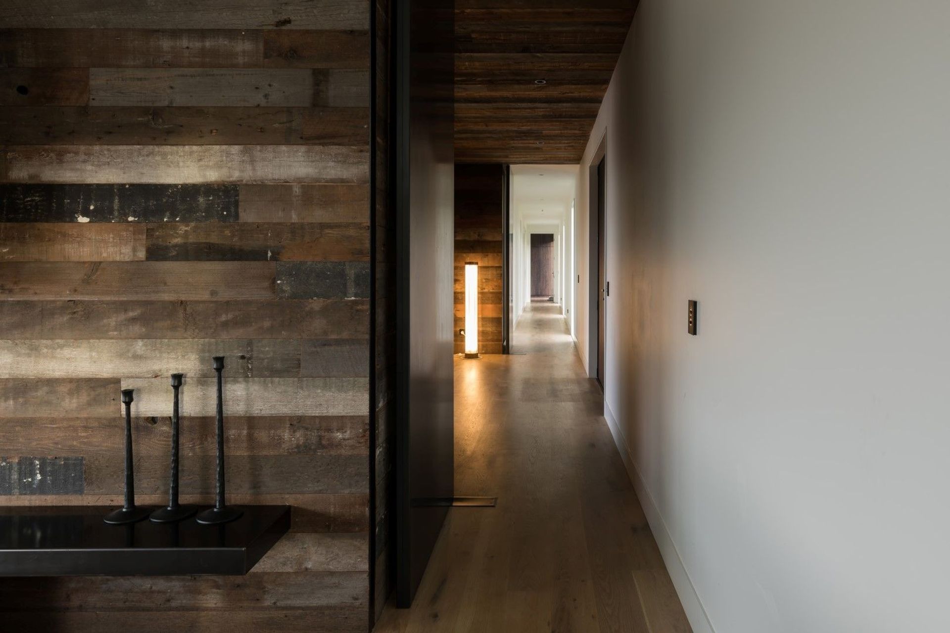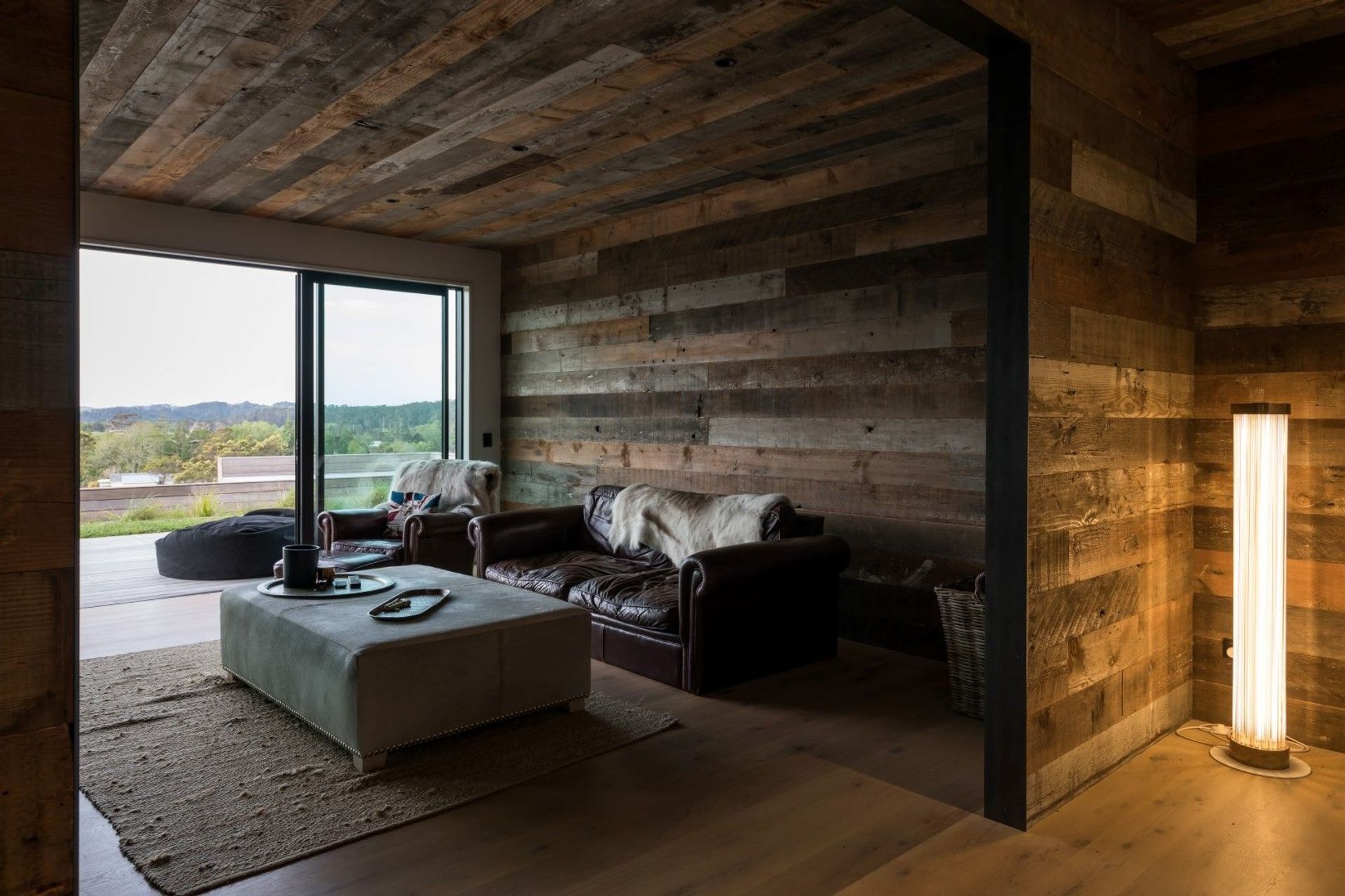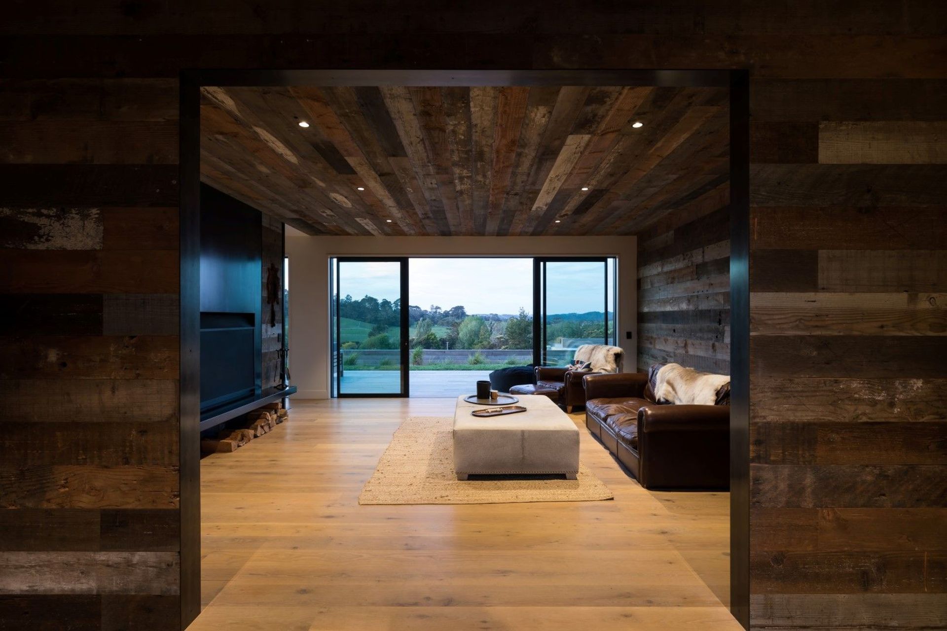 ArchiPro Project Summary - Stunning modular home in Kumeu featuring E-span roofing, vertical shiplap cedar cladding, reclaimed wood paneling, and natural timber flooring.