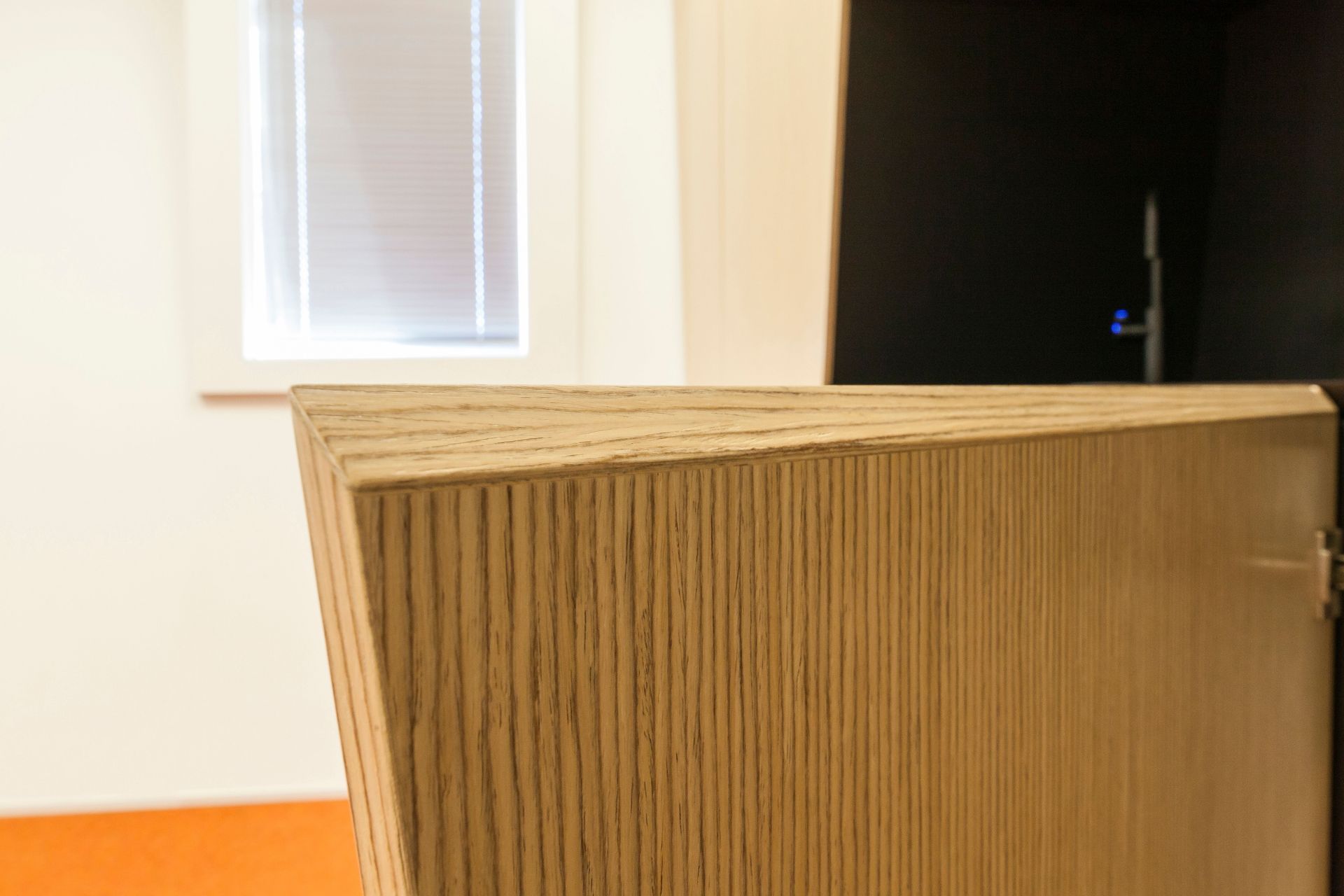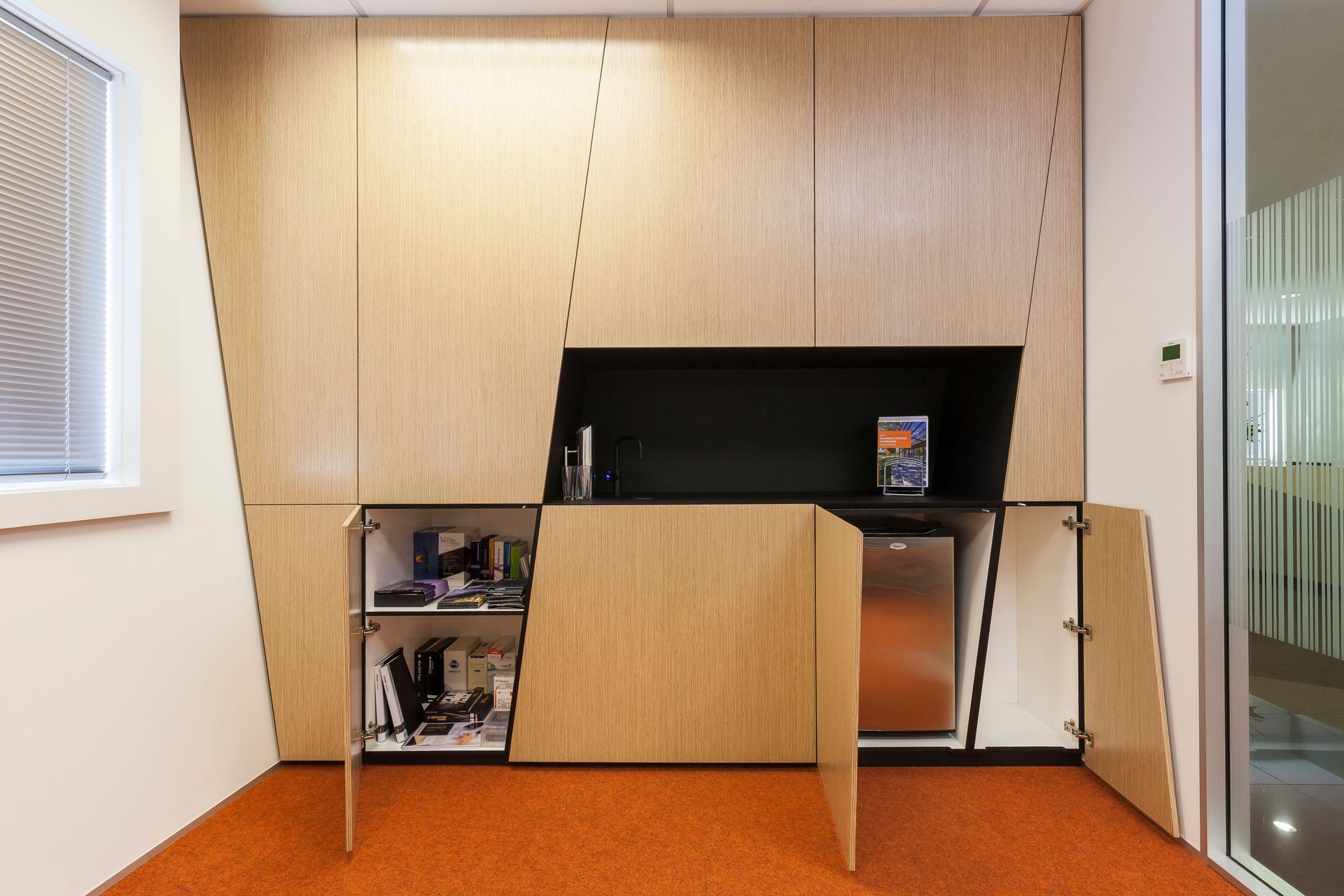ArchiPro Project Summary - Noordanus Architects in Christchurch features a reception area and boardroom with Prime Recon Veneer in Sand Dune, complemented by Black Velvet Soft-Matt laminate in the kitchen bench, showcasing a harmonious blend of materials and design.