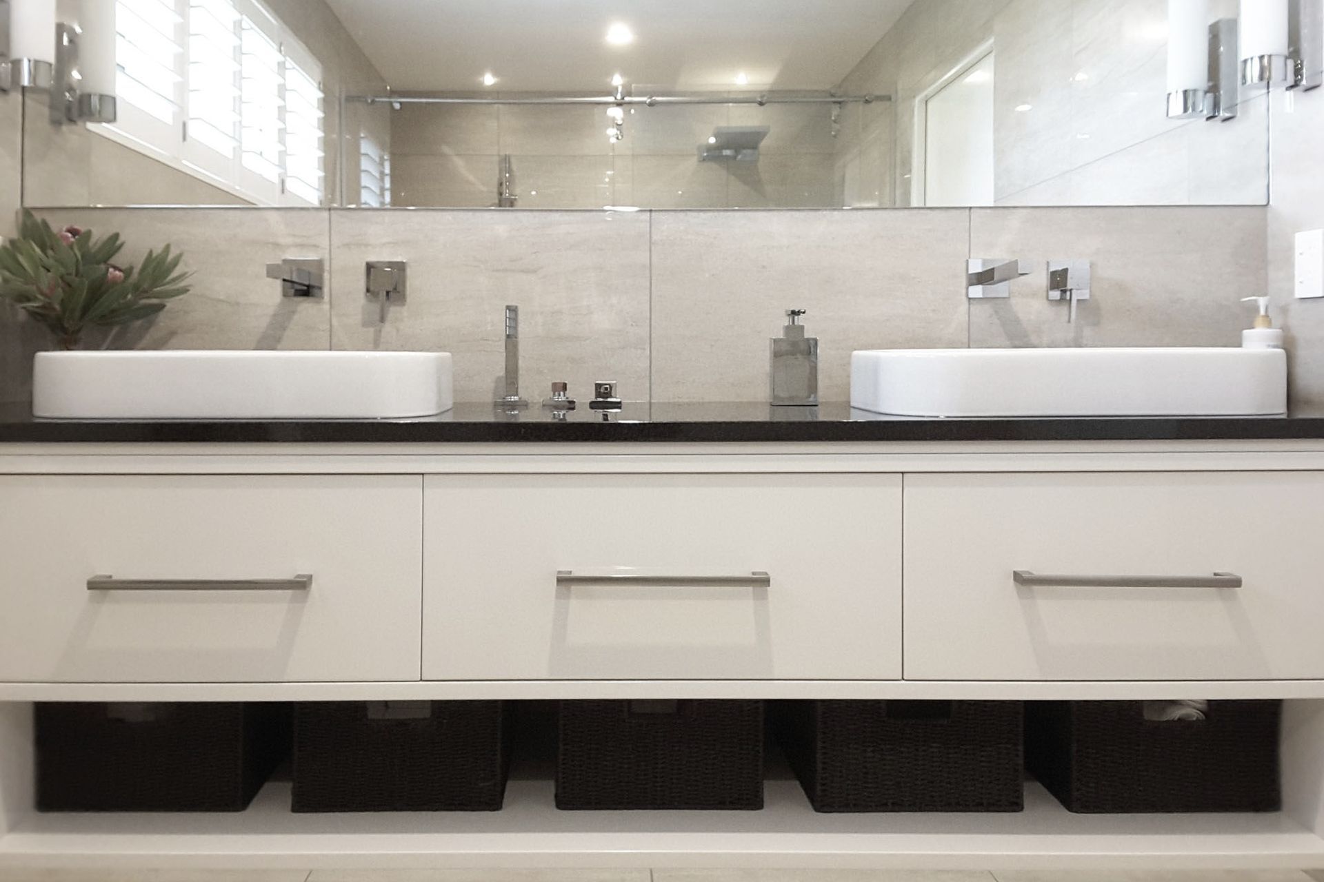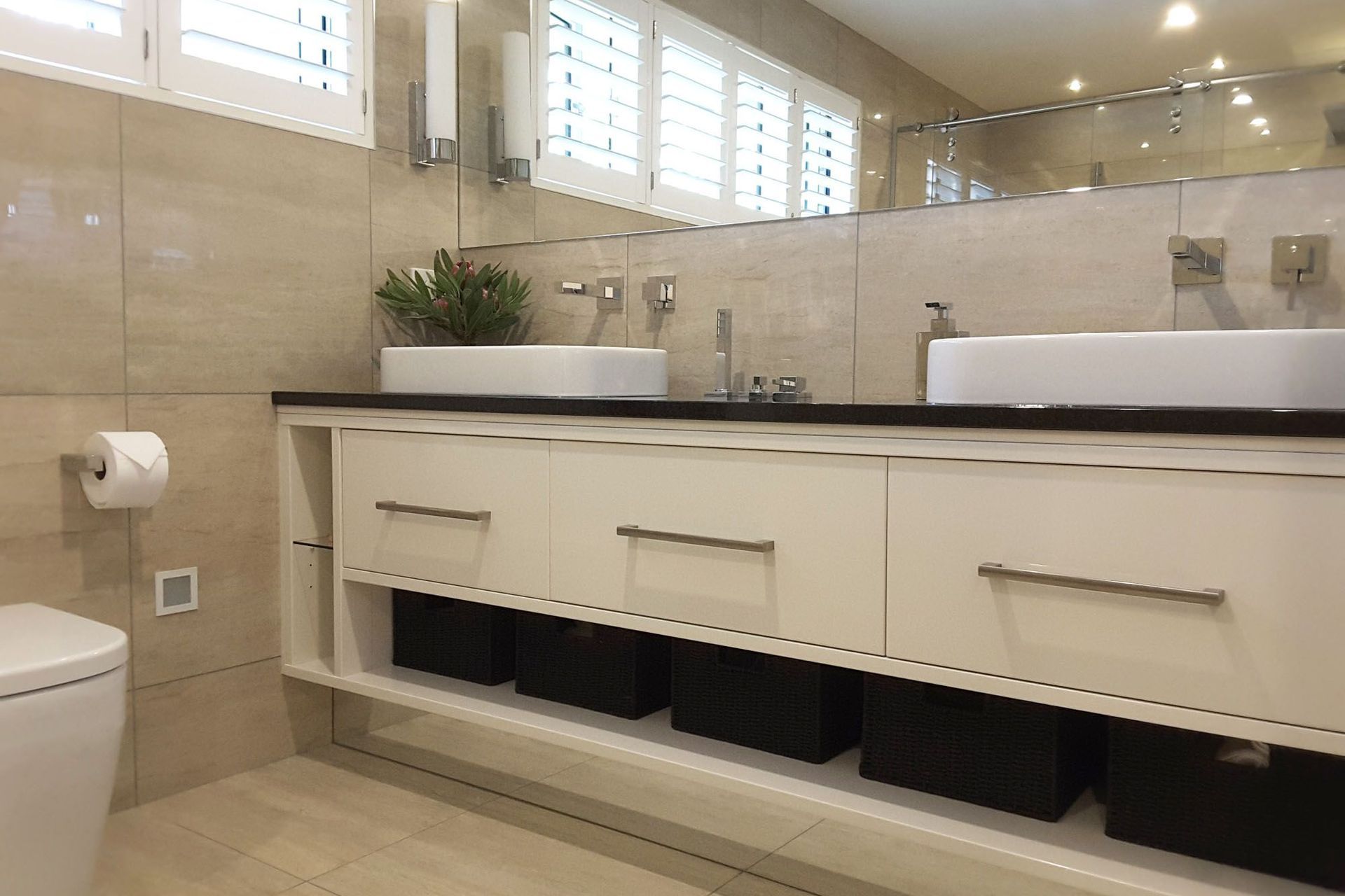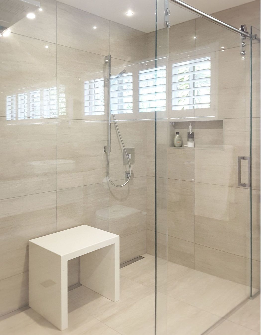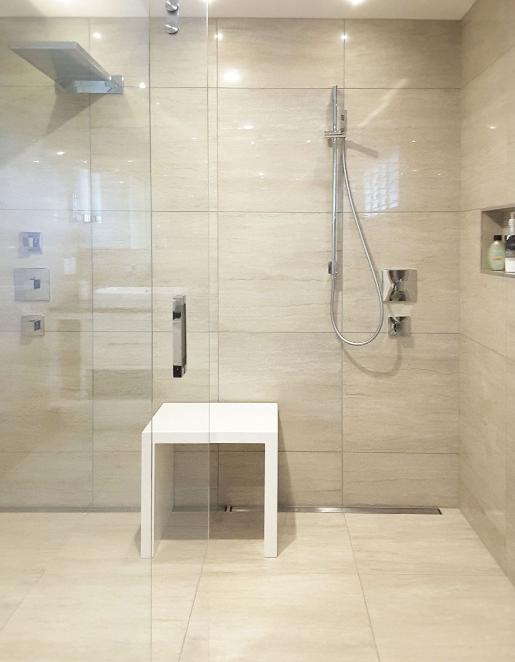 ArchiPro Project Summary - Luxurious North Canterbury bathroom designed for accessibility, featuring a custom Corian shower seat, dual basins, imported tapware, and atmospheric lighting, all while maintaining a sophisticated aesthetic.
