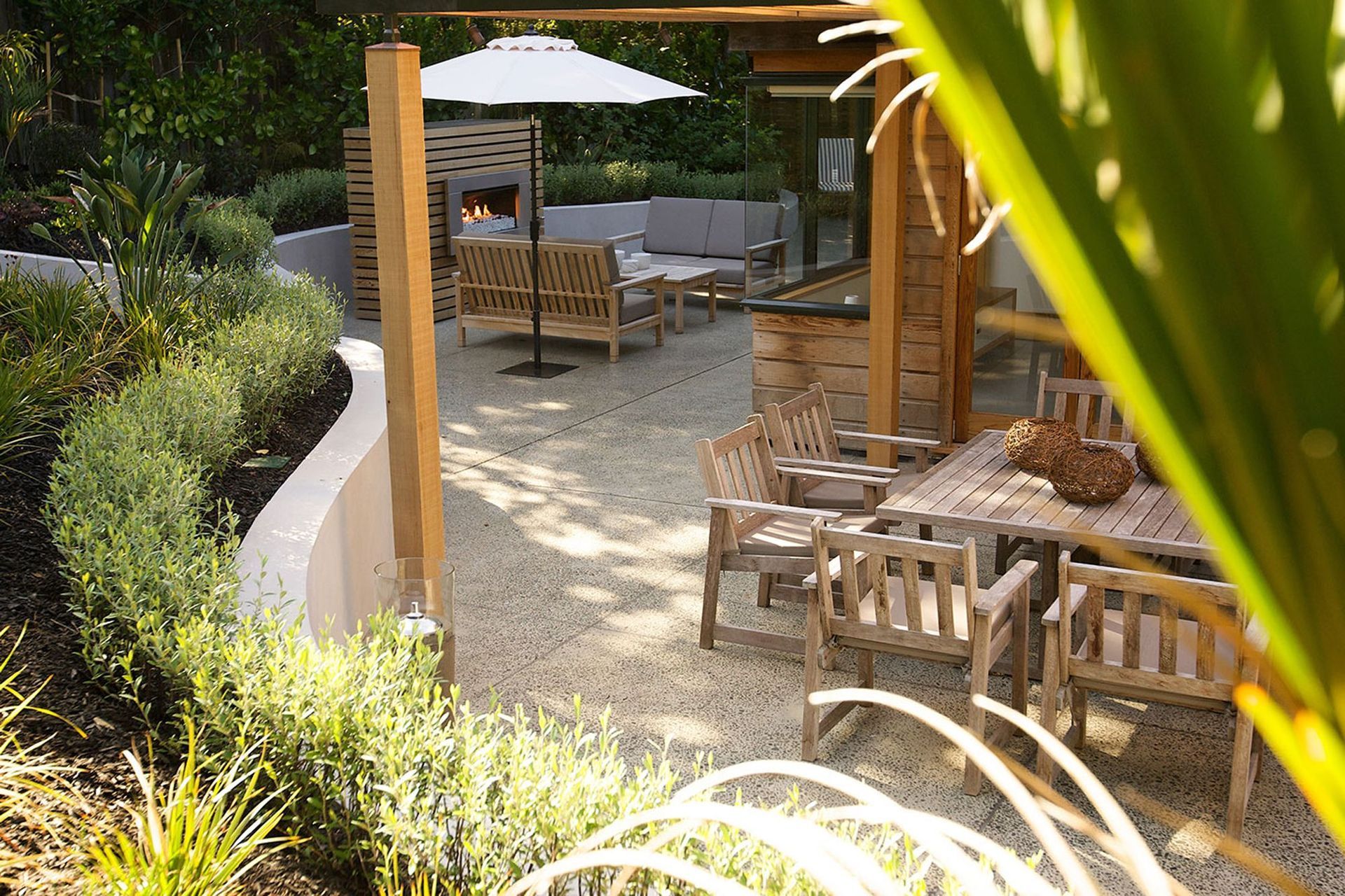A subdued material palette of cedar, honed concrete, plaster, stone and steel combine to create a clean and functional range of spaces which enhance and honour the cedar-clad house. The organic shapes of the masonry and paving, contrast with the architectural rectilinear forms of timber elements and the predominantly native planting palette includes exotic accents of flower and colour, which accentuate the garden’s smart-casual feel.