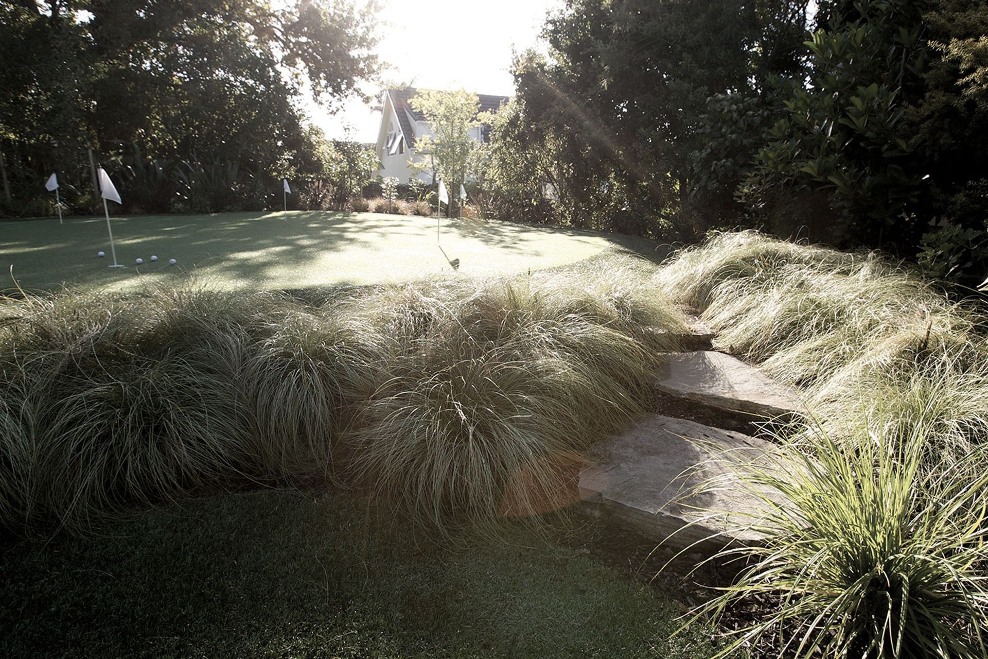 The grandeur of the completed garden is much appreciated, by both client and award judges. This new garden celebrates the rustic nature of the wooded site and cedar, as well as the reflecting the clients’ personalities, and their love of golf. A putting green and chipping surface integrated into the garden is put to good use.