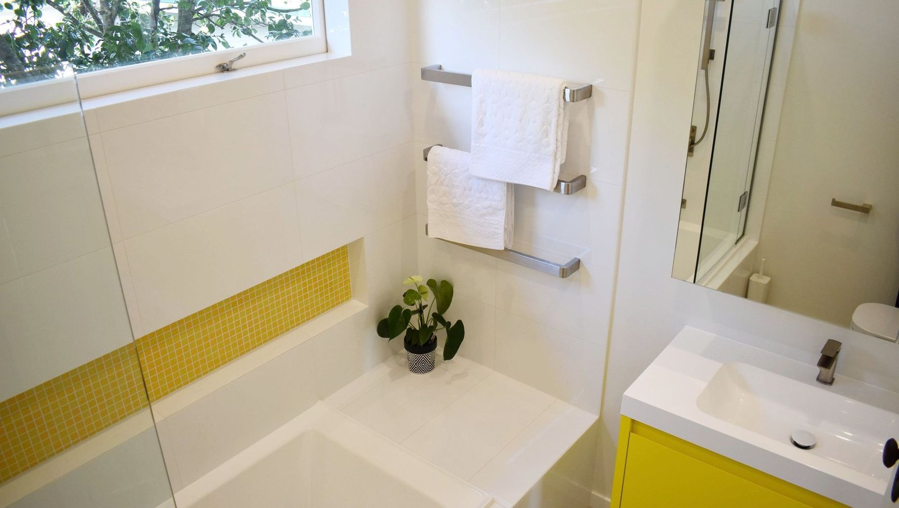 ArchiPro Project Summary - Elegant Northcote bathroom renovation featuring white ceramic wall tiles, yellow mosaic accents, and light brown porcelain flooring, expertly designed by Pocket Space Interiors and managed by Bathroom and Tiling Ltd.