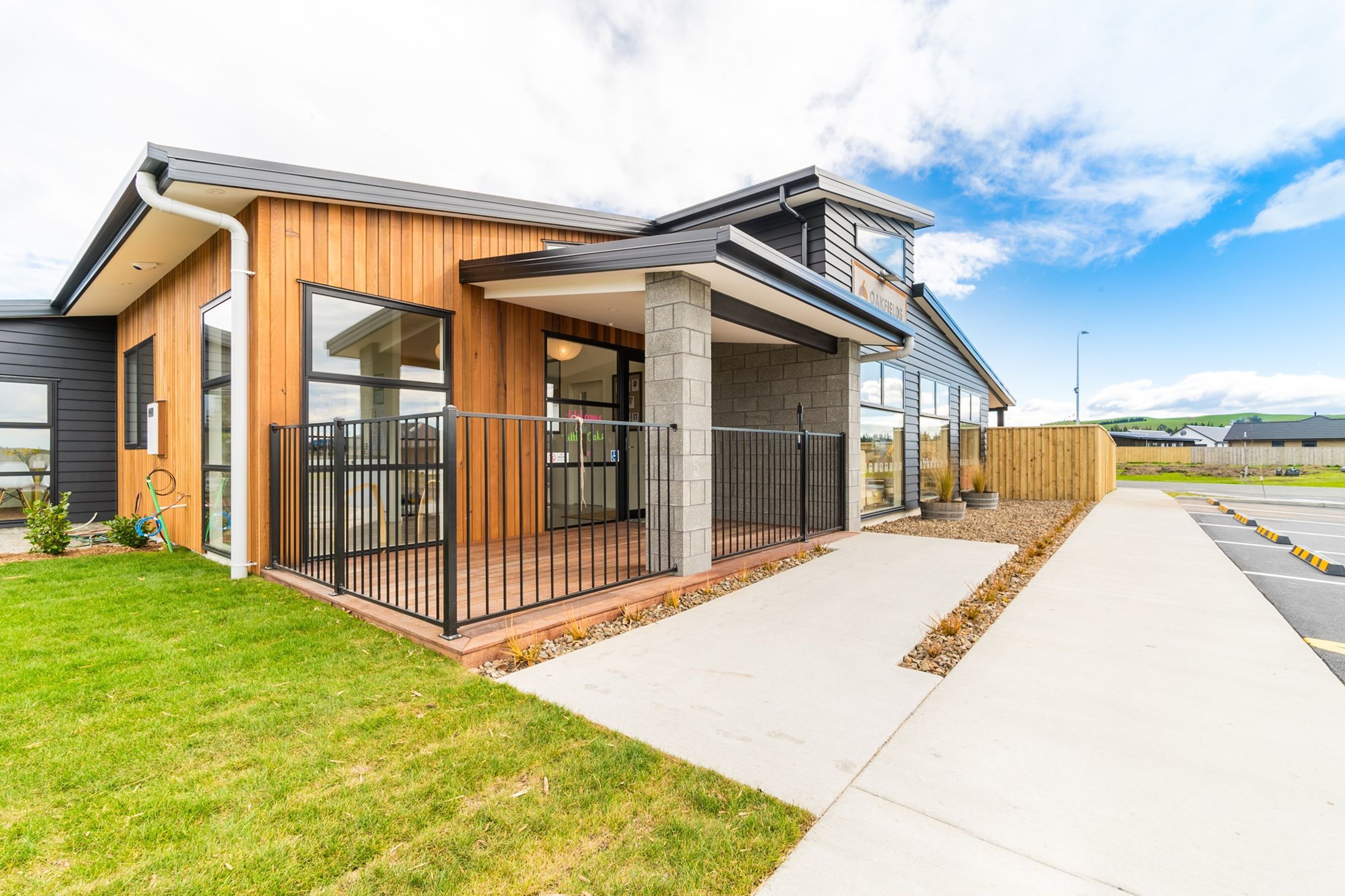 ArchiPro Project Summary - Oakfields Preschool in Amberley features a striking architectural design that harmonizes with its residential surroundings, utilizing earthy materials and high ceilings to create a bright, spacious learning environment tailored for children's development.