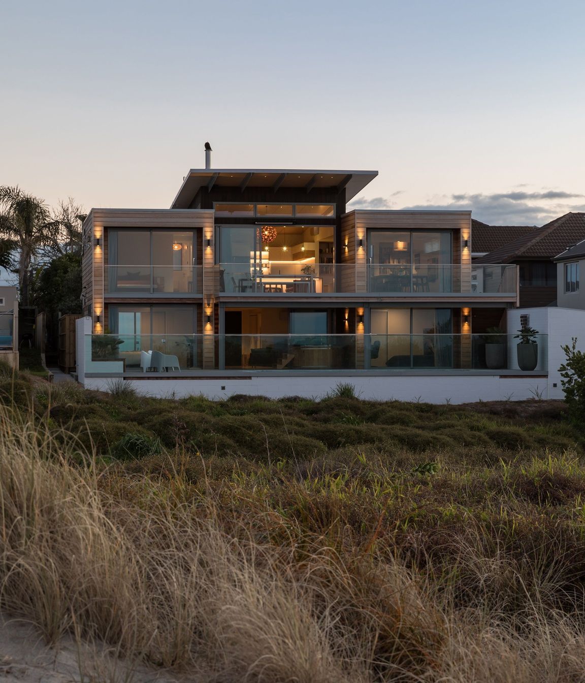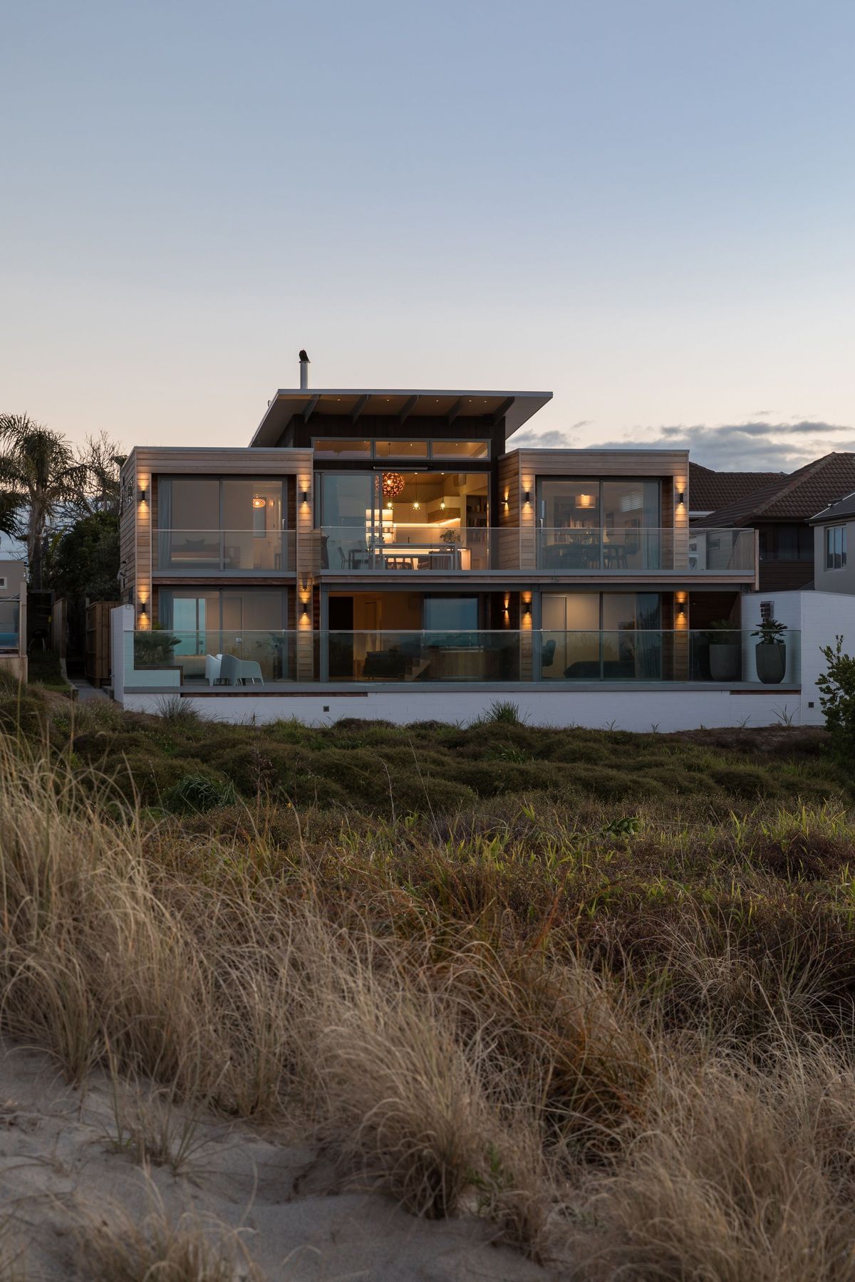 ArchiPro Project Summary - A harmonious beachfront residence that blends natural aesthetics with functional design, featuring elevated living spaces, expansive ocean views, and a unique combination of cedar weatherboard cladding and diverse wood elements.