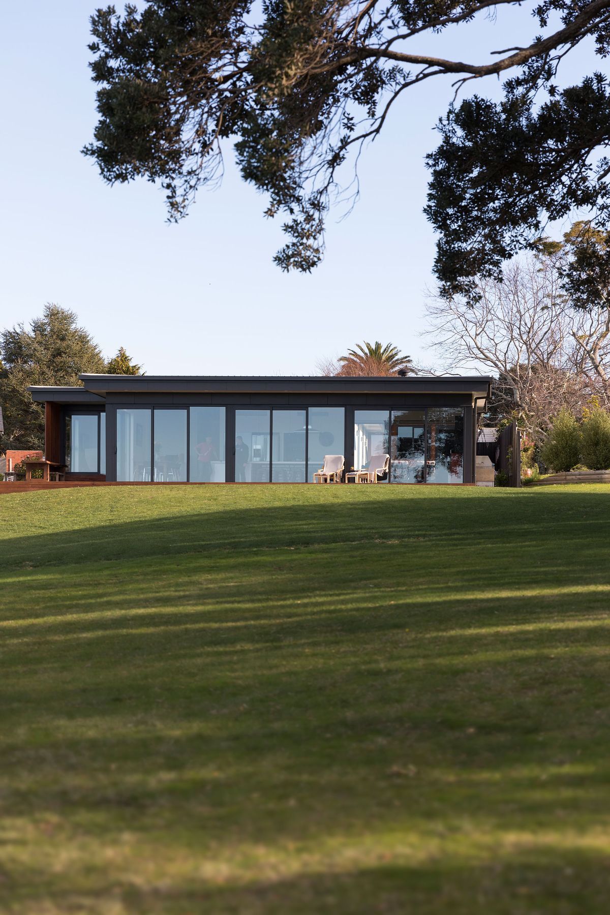 ArchiPro Project Summary - Ohope Headland House: A contemporary residence featuring a low-slung profile and split-level design, strategically positioned to maximize stunning views while ensuring privacy, completed in 2016 for a budget of $650k.