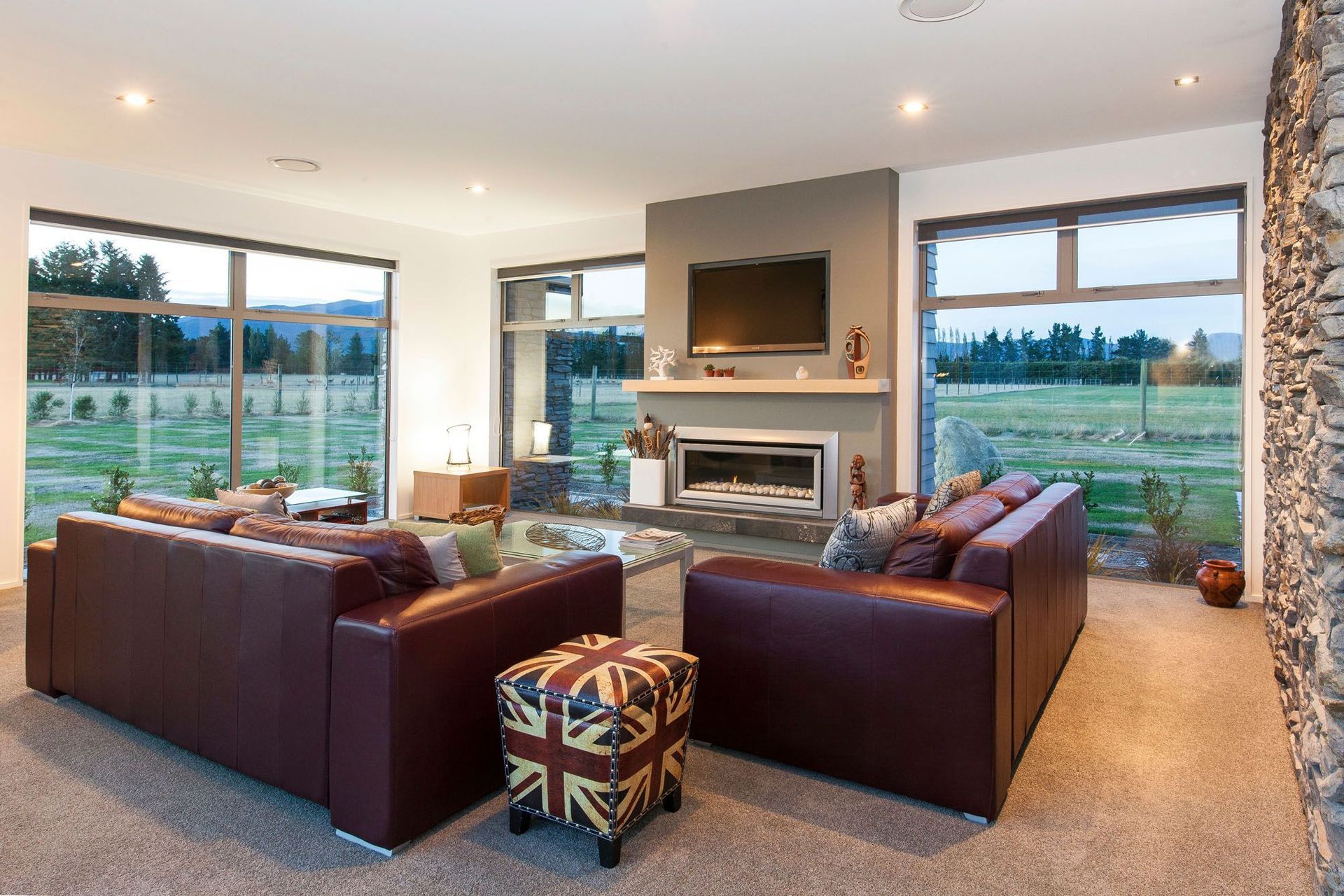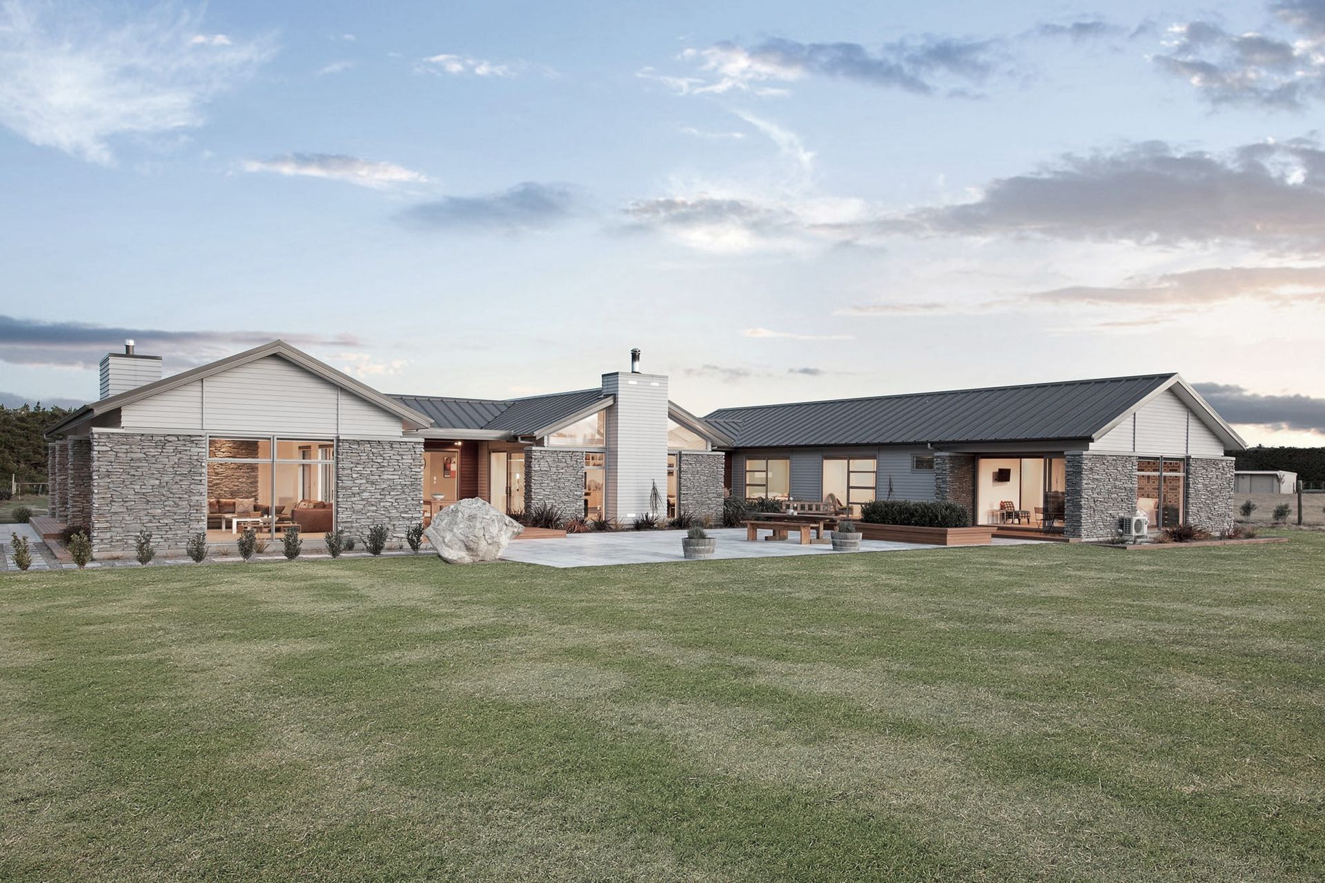 ArchiPro Project Summary - A stunning ranch-style stone house designed by Jason Higham, featuring seamless indoor-outdoor living, expansive rural views, large windows, exposed trusses, and thoughtfully designed outdoor areas for comfort and protection from prevailing winds.