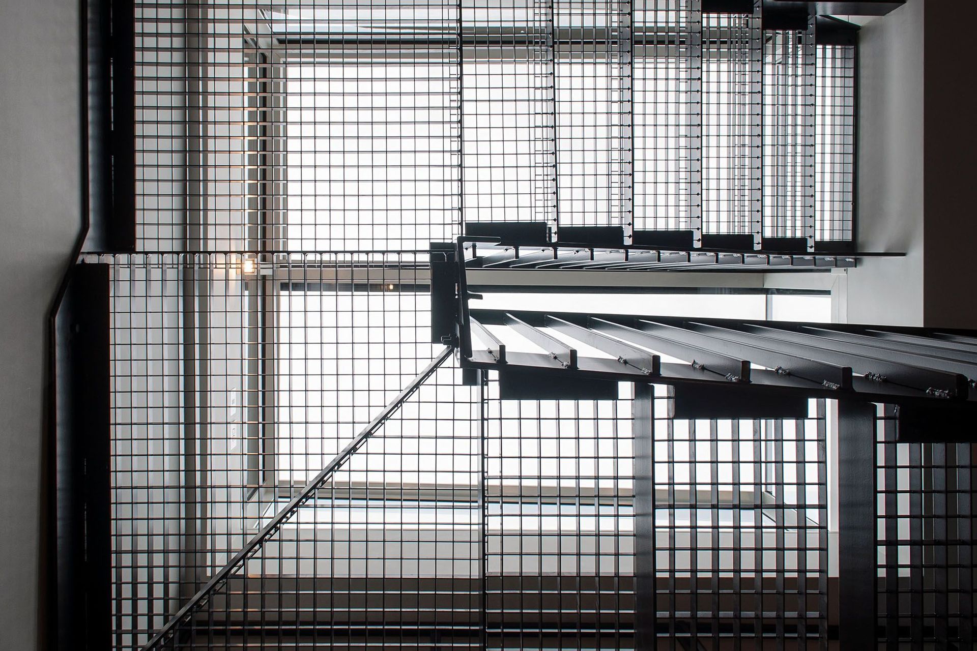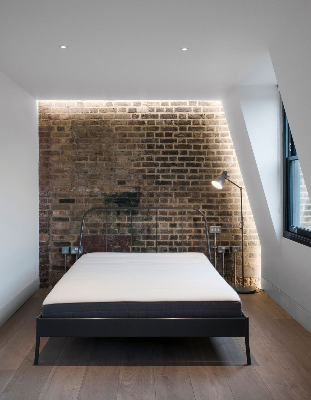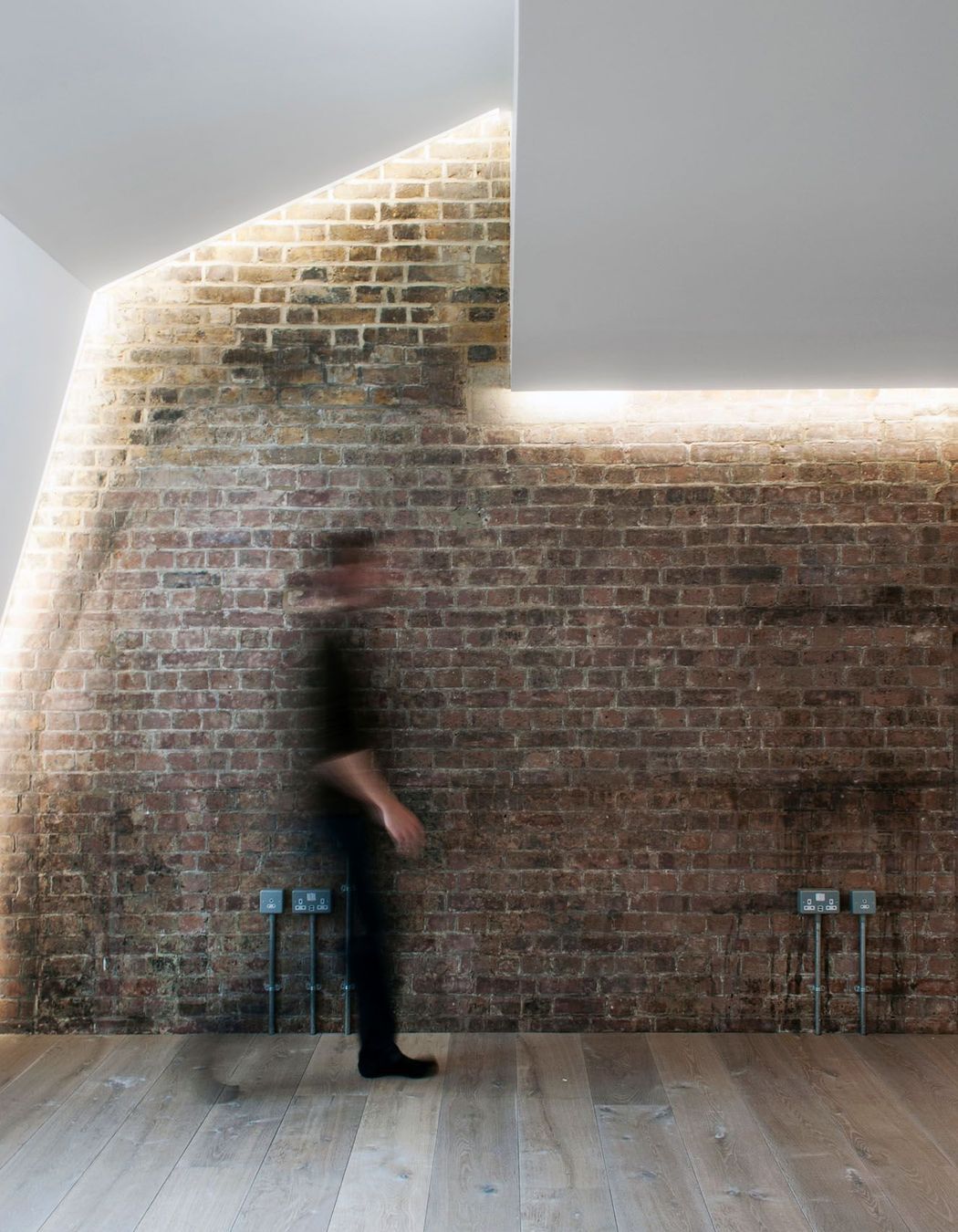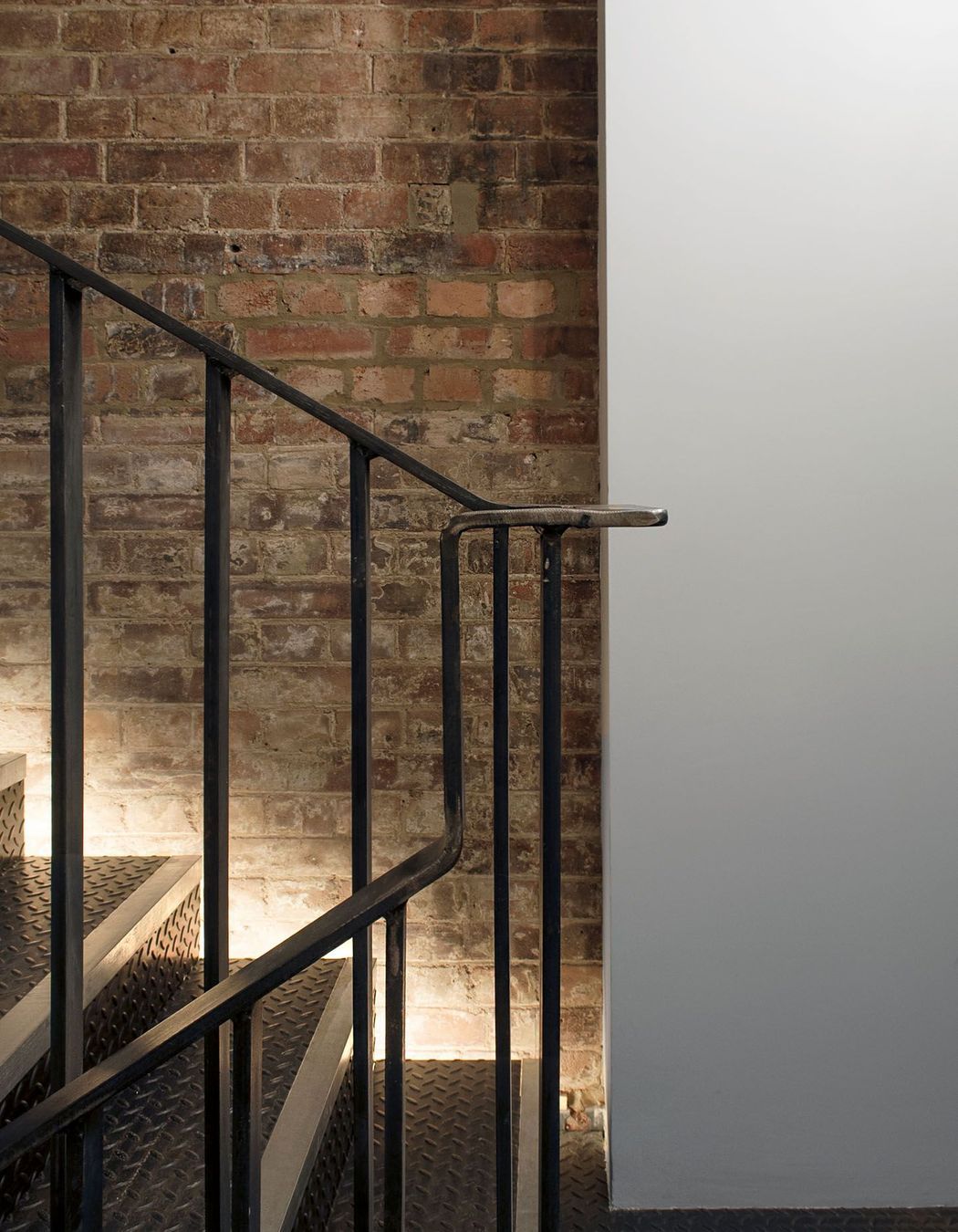ArchiPro Project Summary - Industrial refurbishment of Old Printworks House featuring contrasting rough brick finishes and metal surfaces, enhanced by strategic lighting to highlight the blend of old and new architecture.