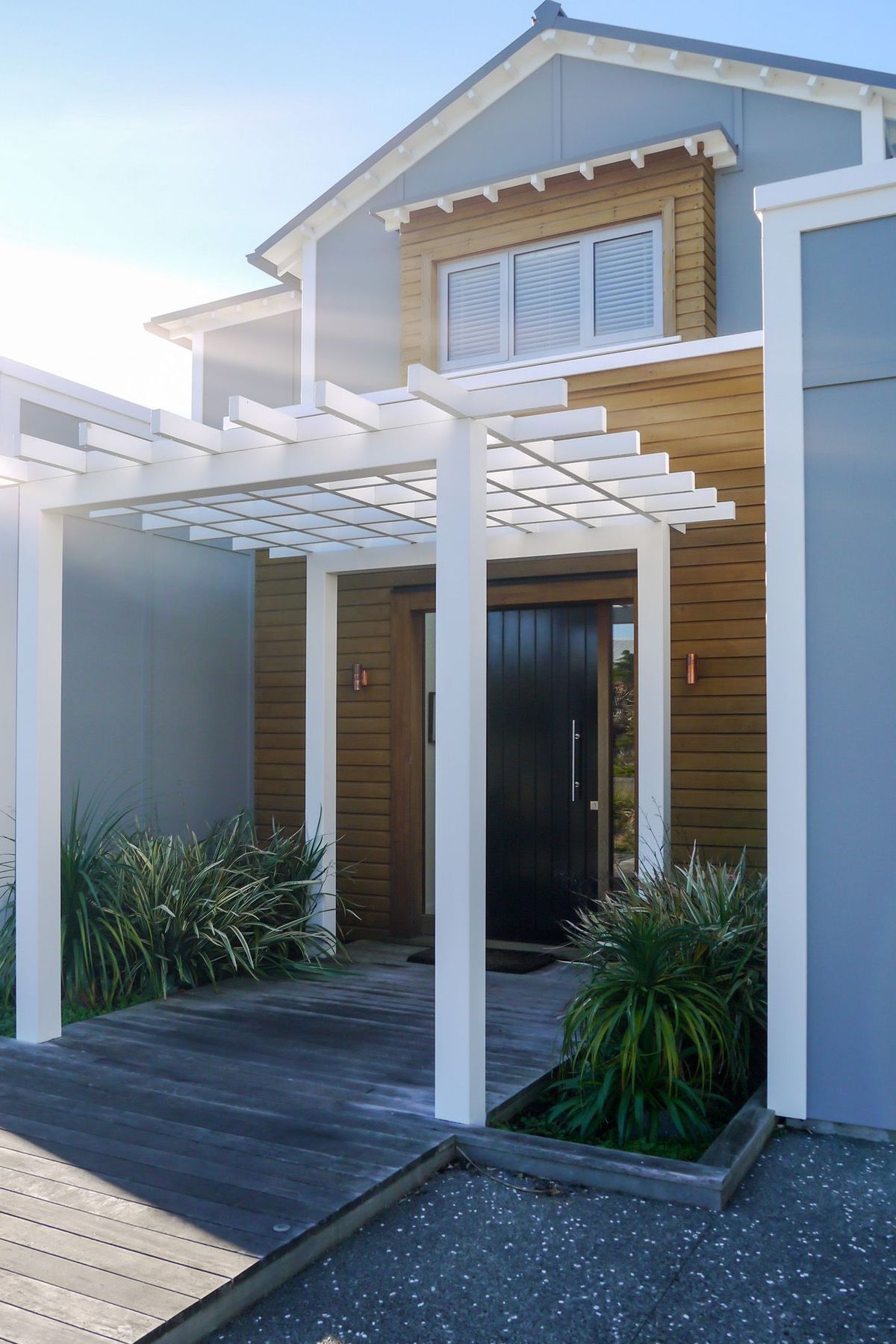 ArchiPro Project Summary - A contemporary home at Olde Beach, blending modern design with nostalgic elements, featuring bespoke timber vanities and board and batten cladding that pays homage to the area's original baches.