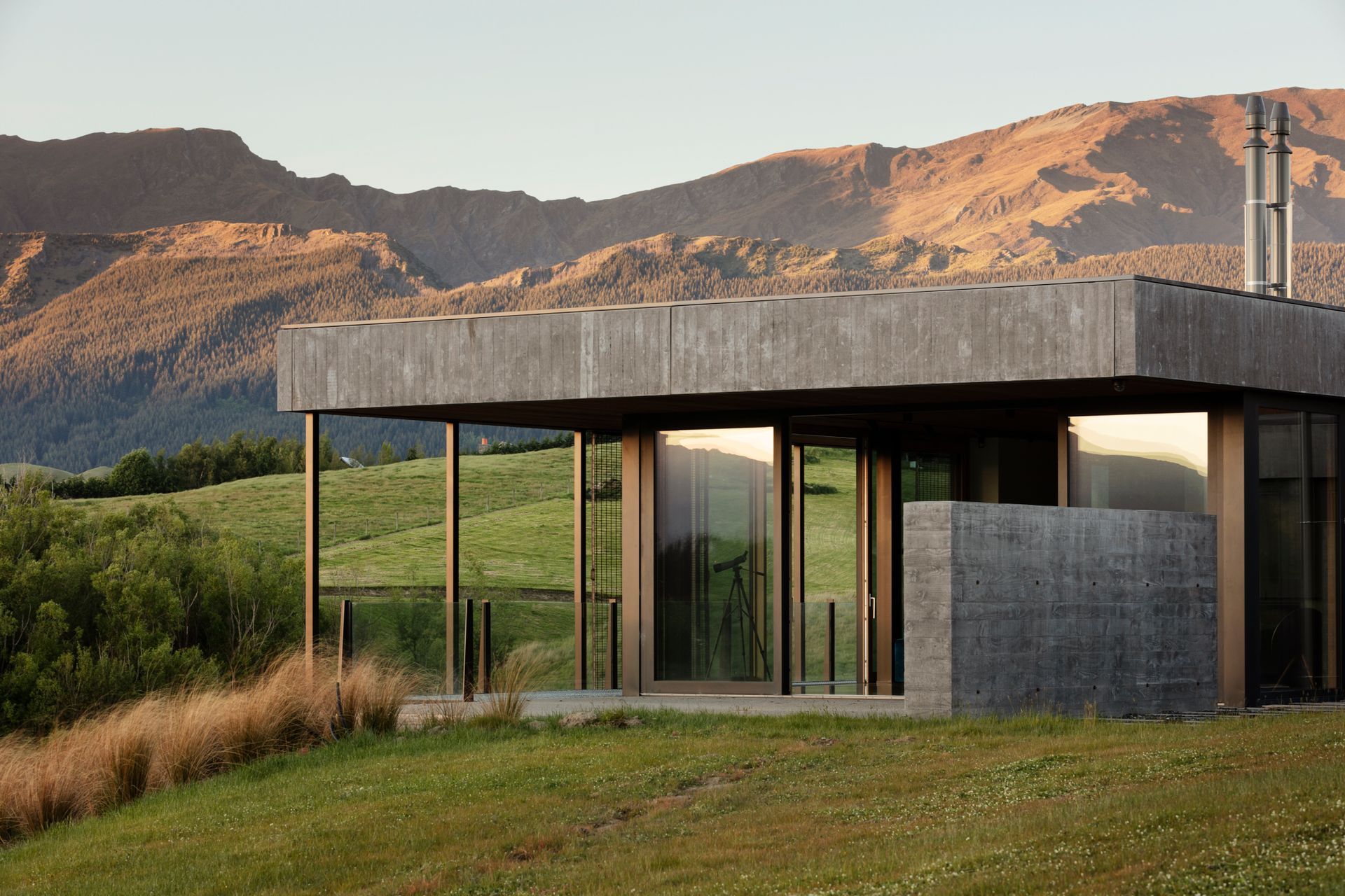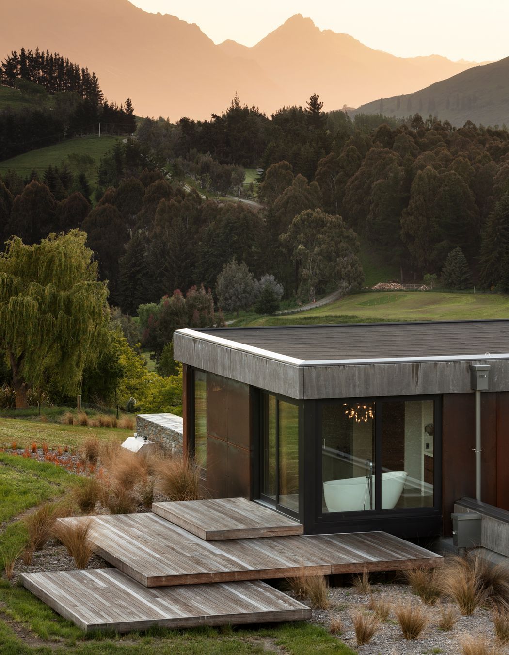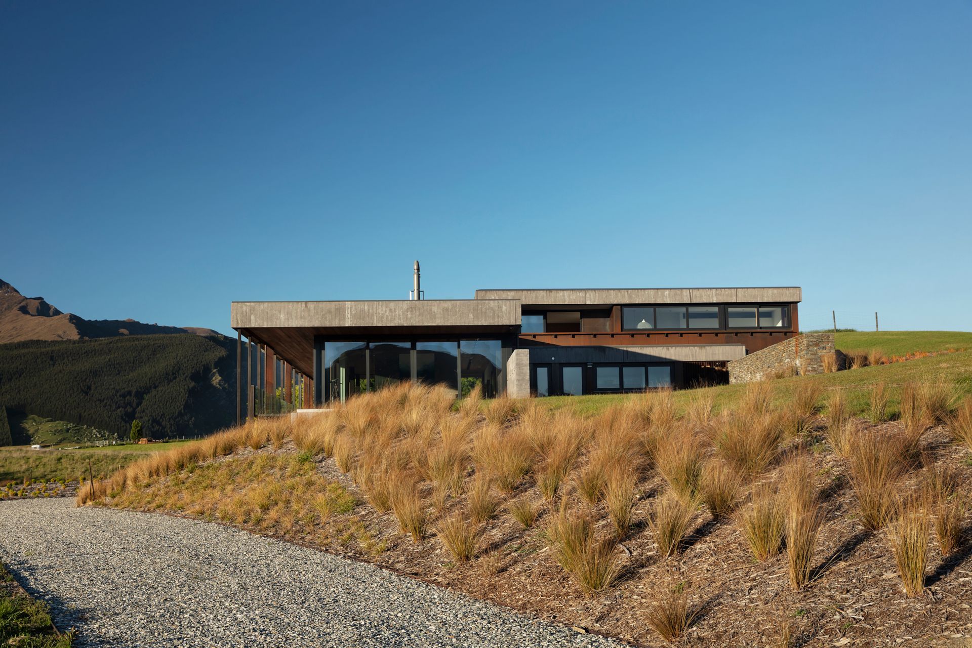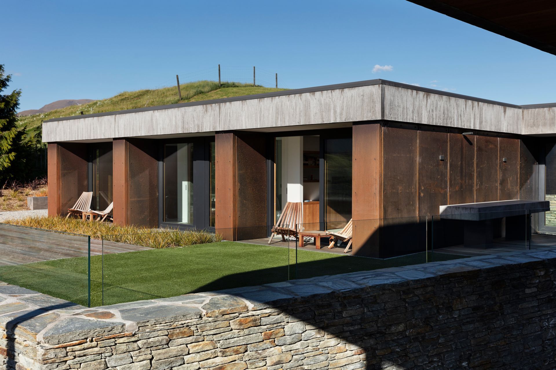 Oliver’s Ridge hunkers into the contours of this land, blending into the grassy landscape with its striking exterior of rusty Corten steel and local schist stone. “It sits on the crest of a little hill,” explains Sian. “We positioned it to capture the views from the house all around and each storey sits into the landscape as it goes up, with spine walls running through the house that are literally holding back the land.”