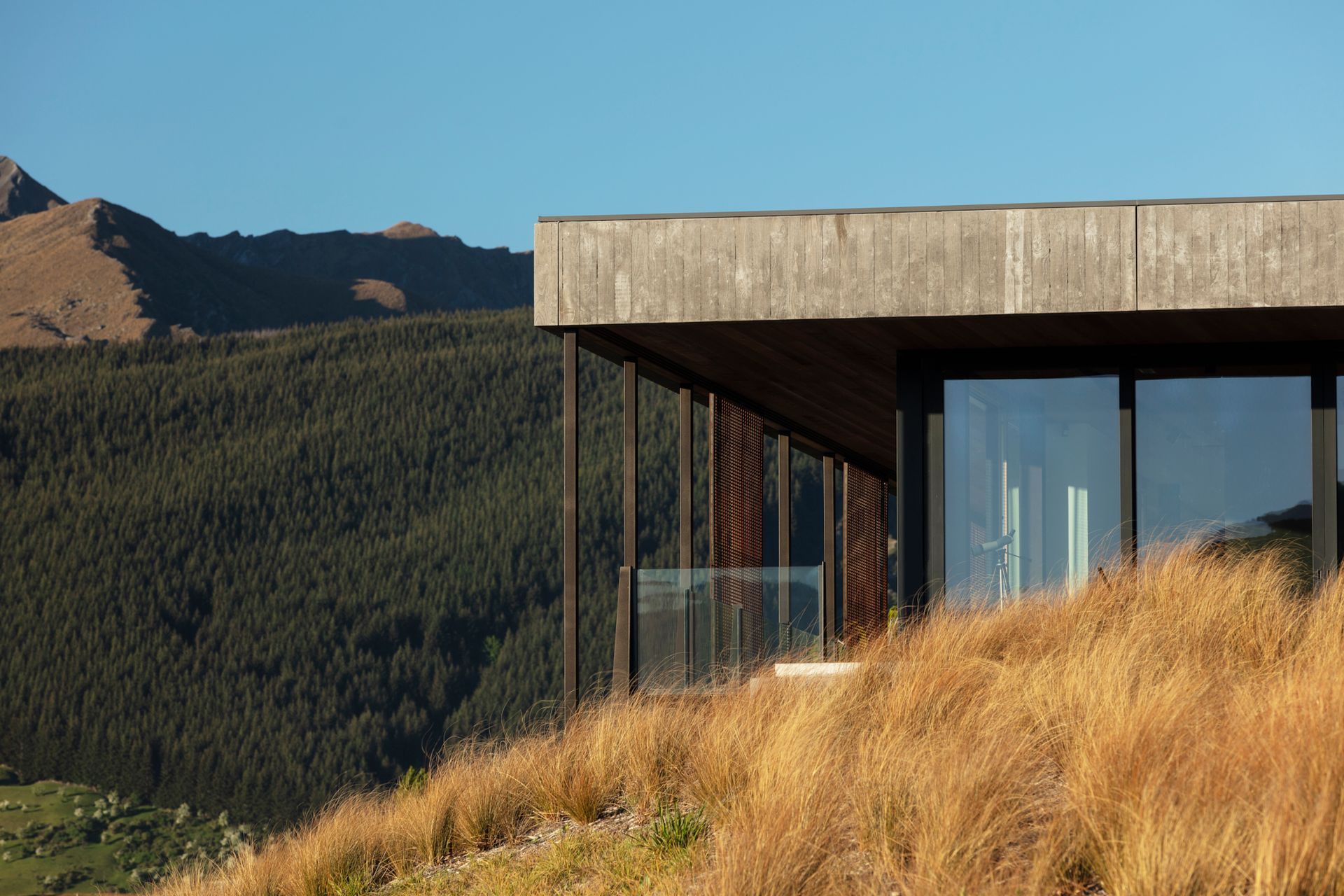 Imagine having a bedroom with a 360-degree view of snowy mountains and crystal clear lakes, where you feel like you’re living within a set of Lord of the Rings. Situated in Speargrass Flat, just outside of Arrowtown, overlooking a landscape that includes The Remarkables mountain ranges and the vineyards of Gibbston Valley, Oliver’s Ridge House was designed to be energy-efficient, sustainable and healthy in response to its extreme climate.