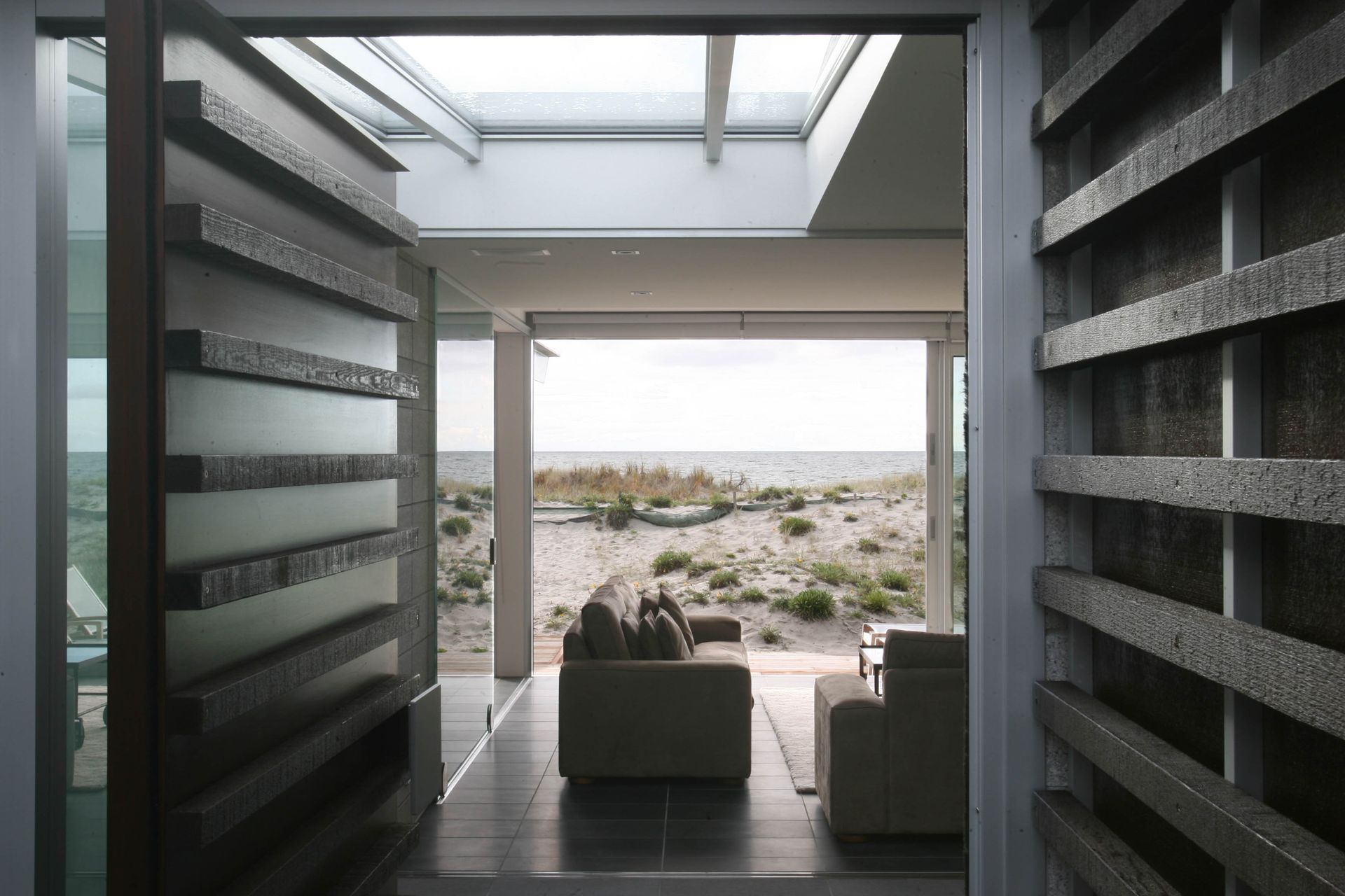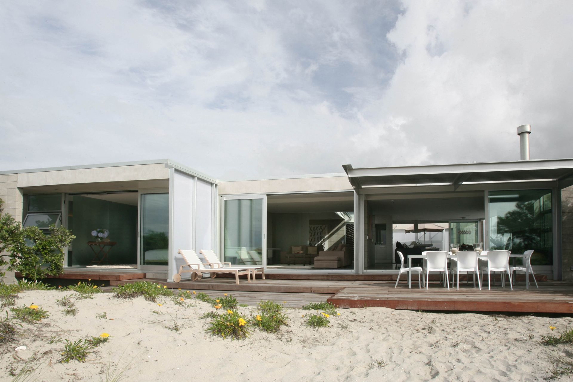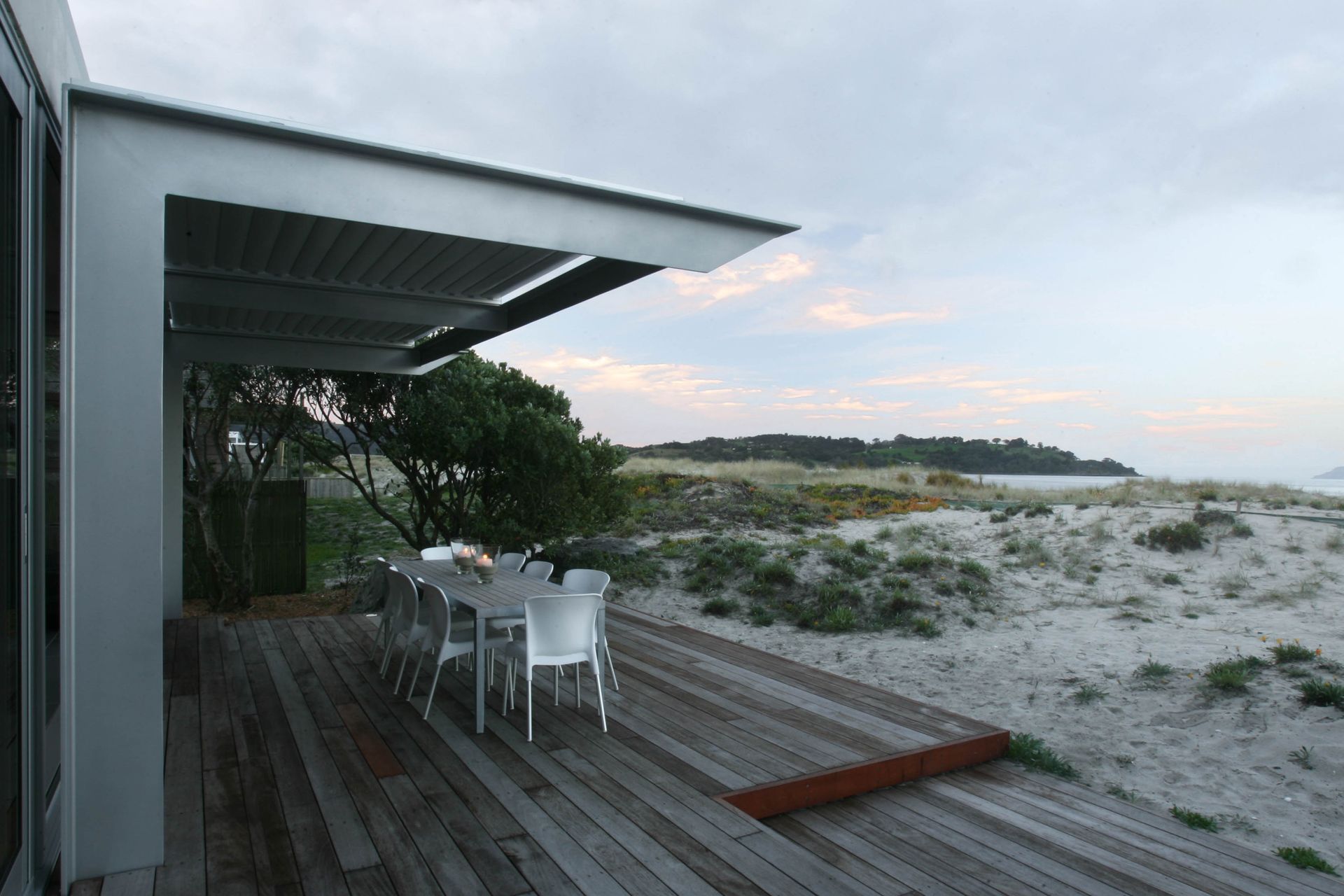 ArchiPro Project Summary - Elegant Omaha Beachfront House harmoniously integrates with its dune front location, featuring seamless flow between living spaces, the beach, and an internal courtyard, all while adhering to strict height restrictions. Winner of the NZIA Resene Local Award for Architecture 2006.