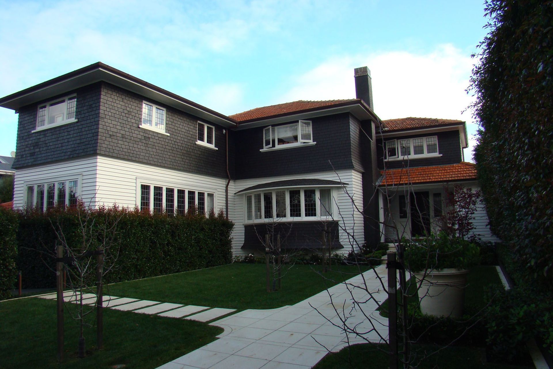 ArchiPro Project Summary - Two-level timber frame construction featuring cedar shingle and weatherboard cladding, designed by Cashmore and Colleagues, with a project duration of 7 months.