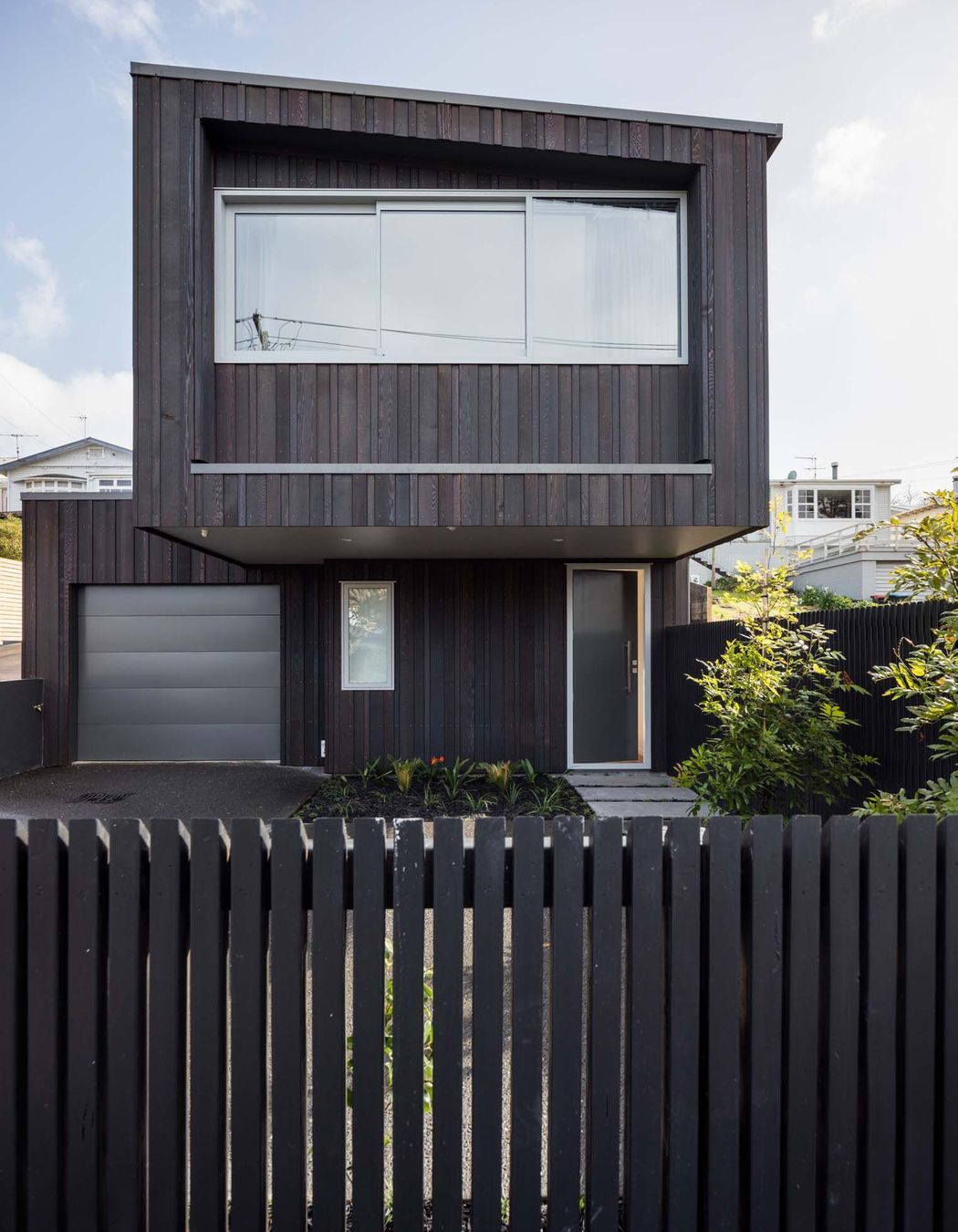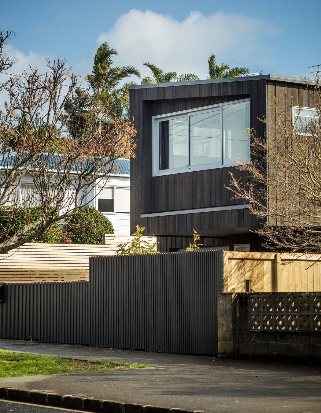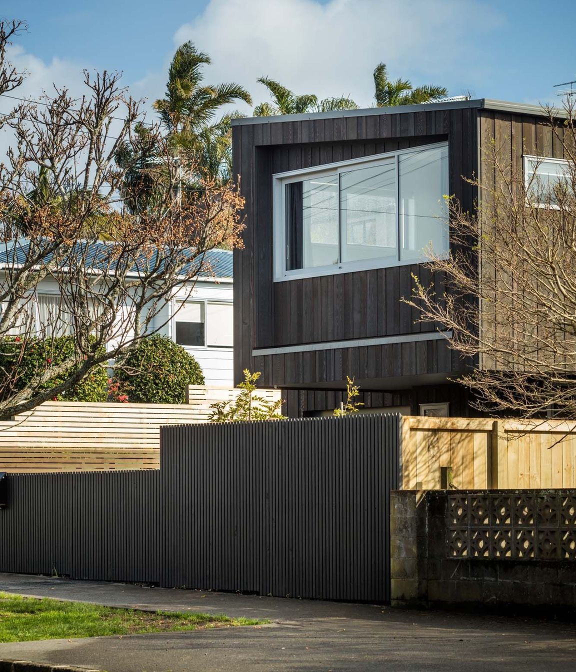 ArchiPro Project Summary - A stylish, modern cantilevered cedar-clad dwelling designed for a busy Auckland couple, maximizing a compact sloping site while addressing council requirements and ensuring privacy and views.