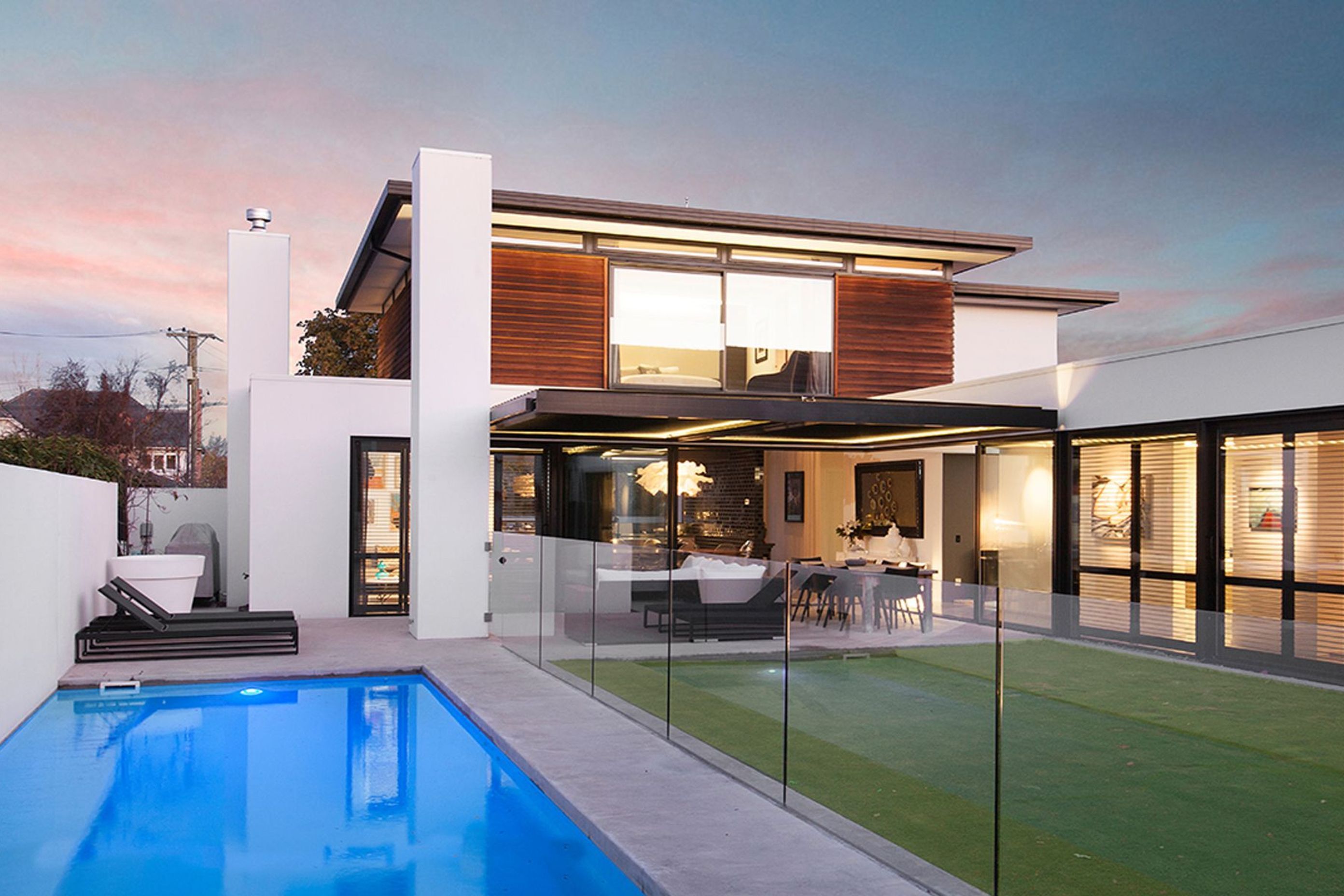 ArchiPro Project Summary - A striking residence in Merivale, Christchurch, featuring a unique blend of INTEGRA Lightweight Concrete façade and natural weathered cedar, offering exceptional durability, aesthetic appeal, and acoustic benefits for urban living.