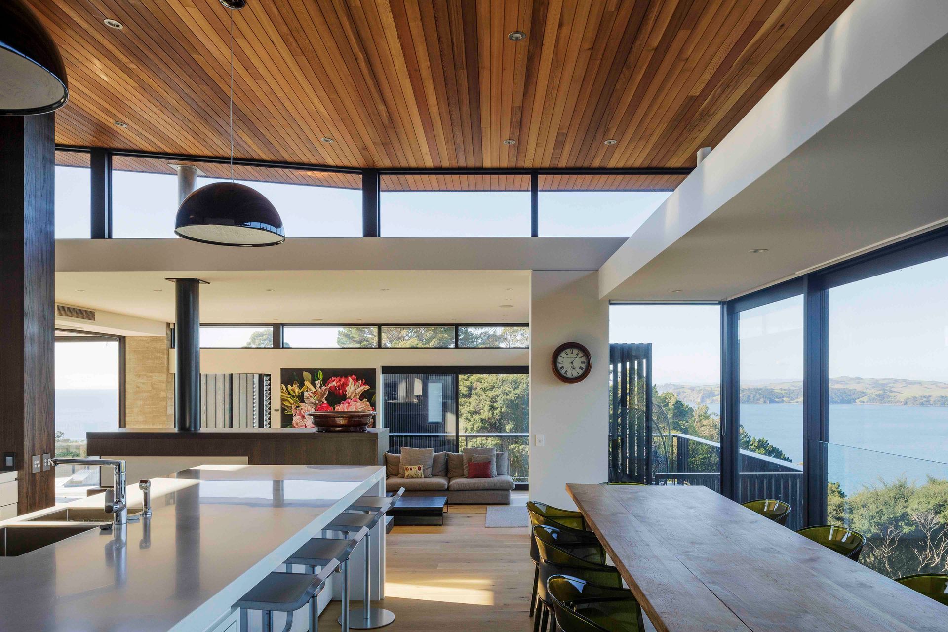 ArchiPro Project Summary - A serene family retreat on Waiheke Island, designed with expansive views, a recessive profile, and multiple accommodation areas, transitioning from a holiday home to a permanent residence, surrounded by native bush and offering a harmonious living experience.