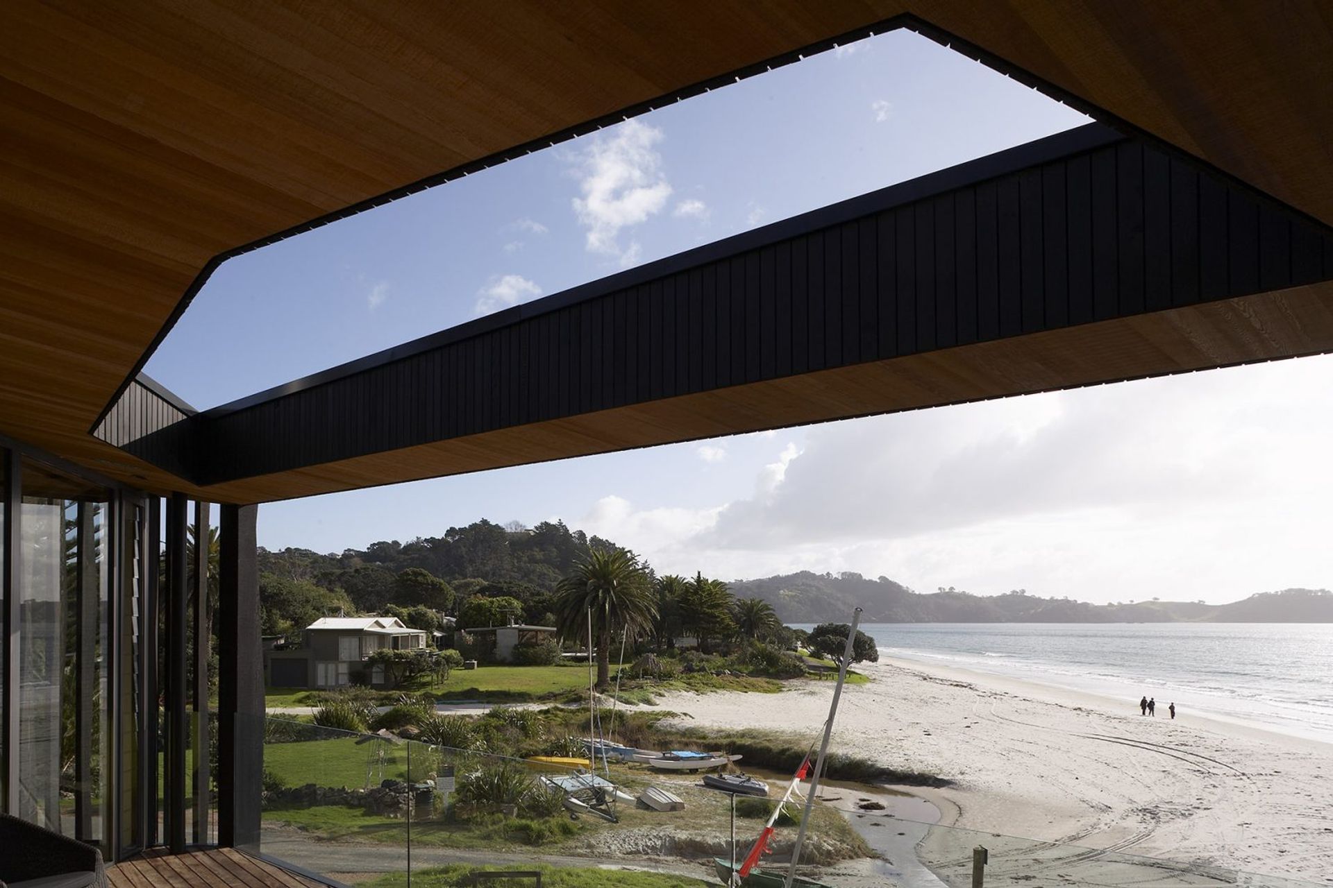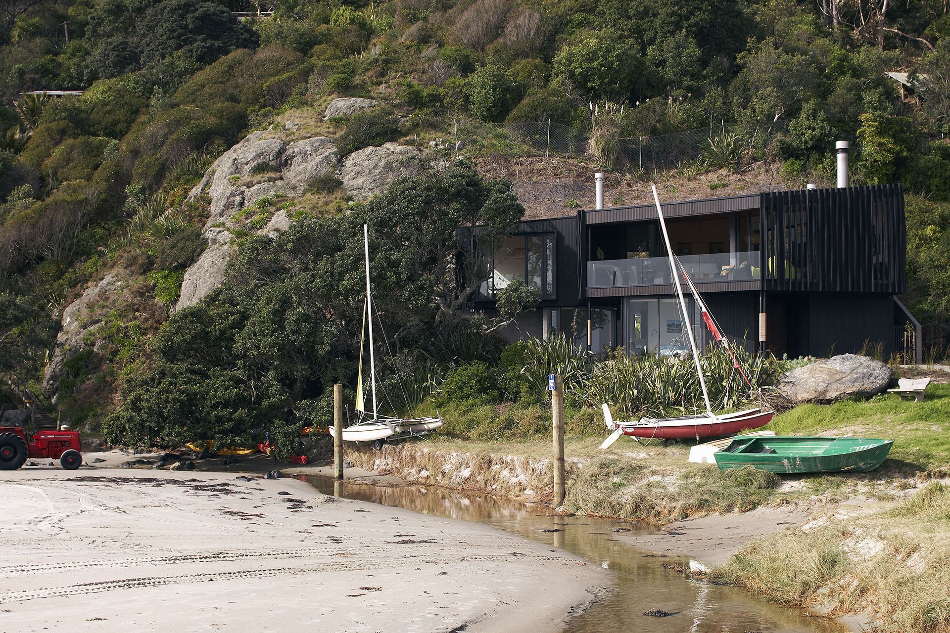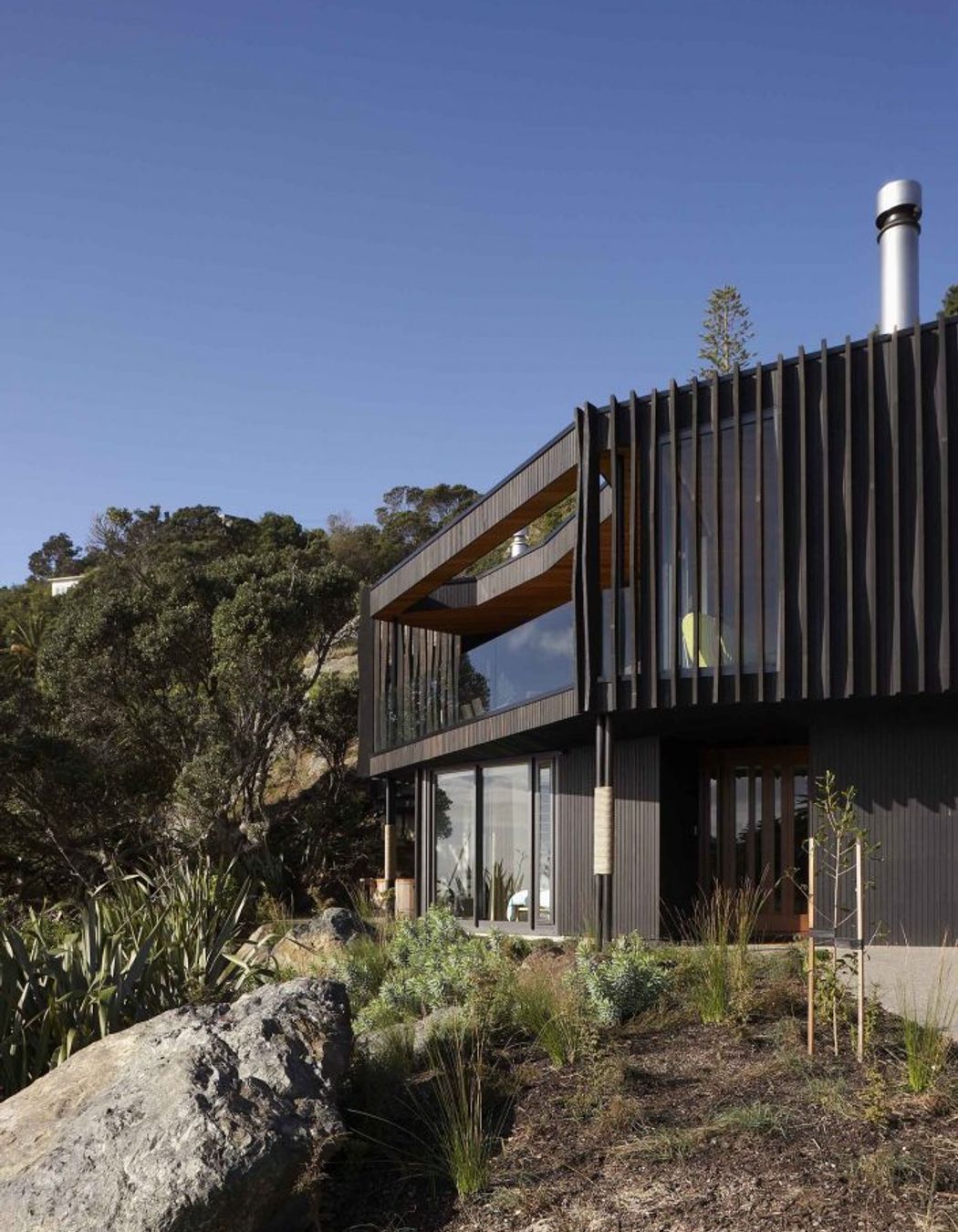 ArchiPro Project Summary - A contemporary holiday home on Waiheke Island, featuring an angular black timber design that harmonizes with its natural surroundings and offers stunning beach views, while embracing the local landscape and craftsmanship.