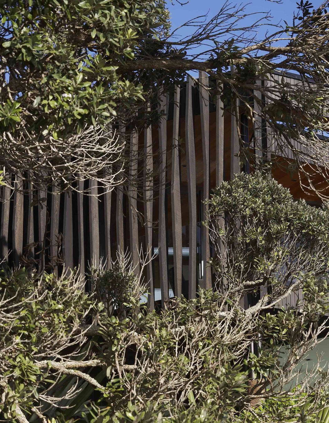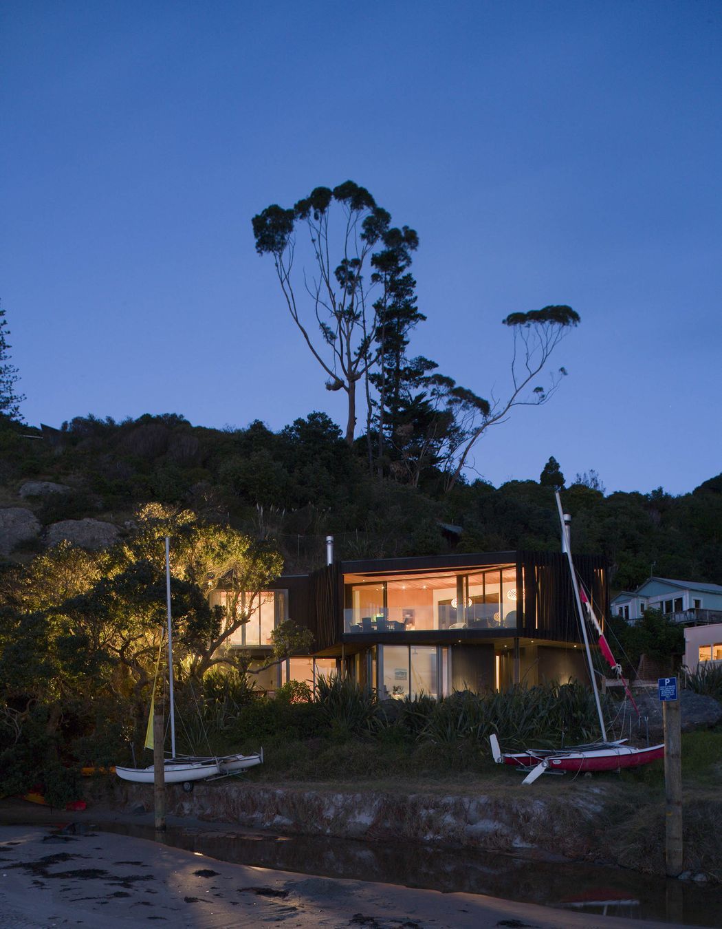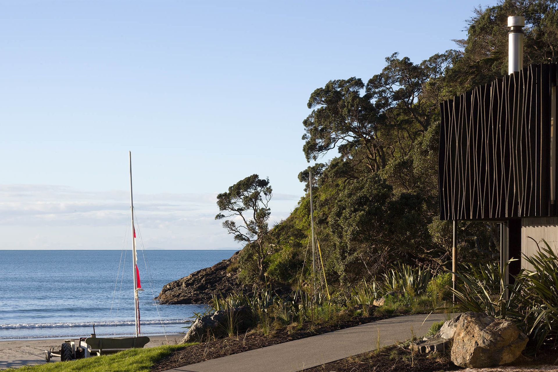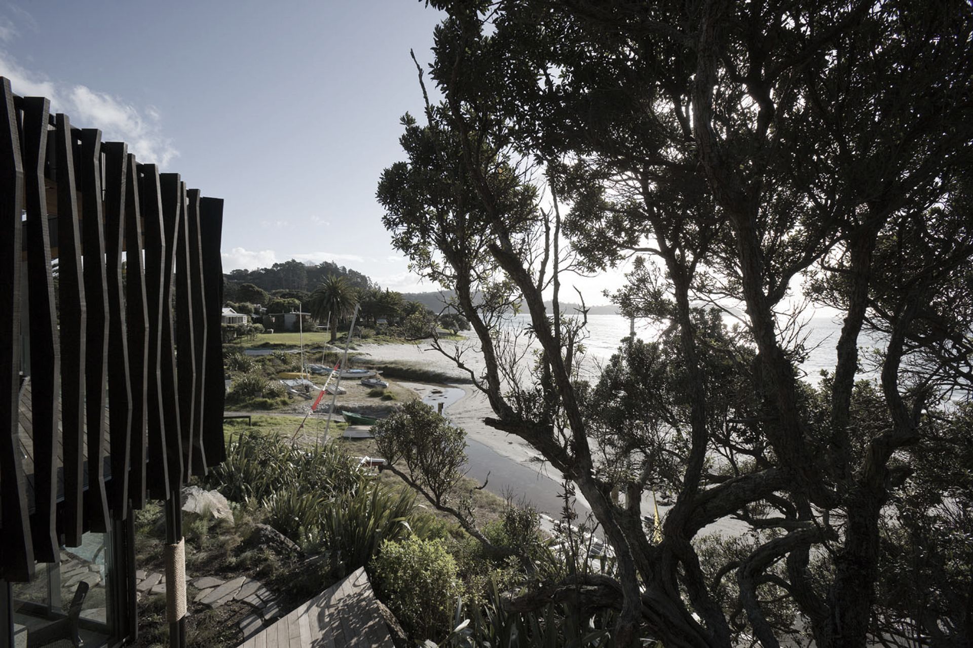 ArchiPro Project Summary - A contemporary holiday home on Waiheke Island, featuring an angular black timber design that harmonizes with its natural surroundings and offers stunning beach views, while embracing the local landscape and craftsmanship.