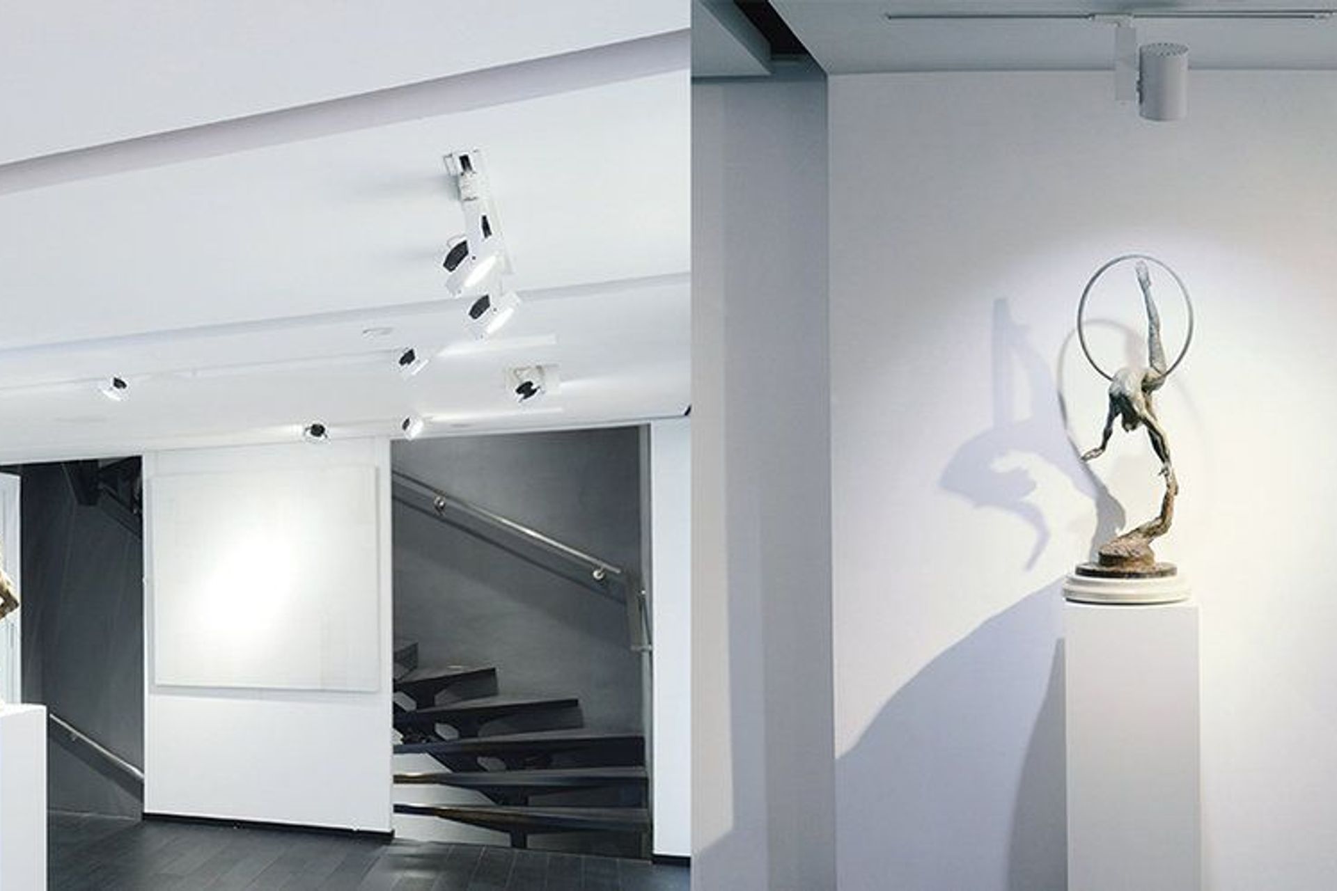 ArchiPro Project Summary - The Opera Gallery features the innovative Moto-Zero track mounted spotlight, offering advanced lighting technology with customizable movements, beam shaping, intensity, and color tuning controlled via the CASAMBI™ application.