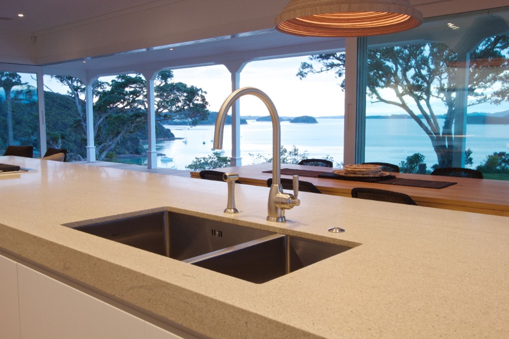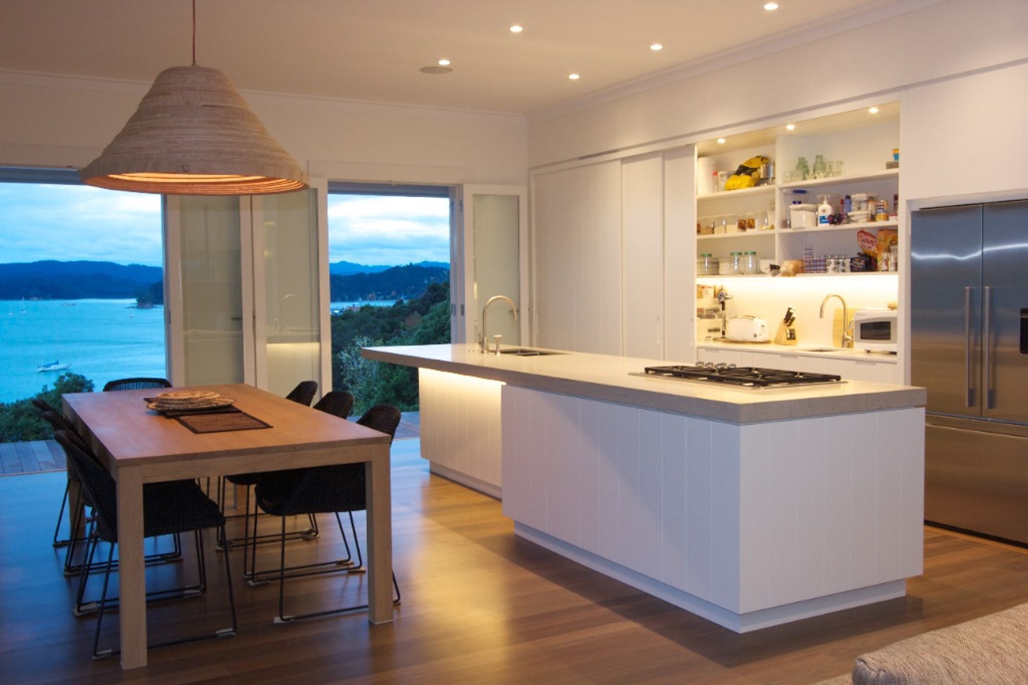ArchiPro Project Summary - Opua House features stunning 180-degree views of the Bay of Islands, a contemporary interior within colonial architecture, and a seamlessly integrated kitchen that enhances the open-plan living space.