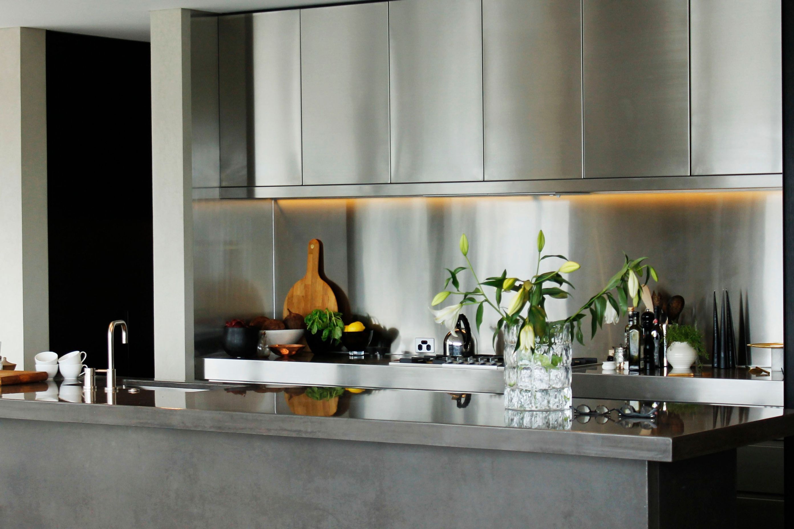 ArchiPro Project Summary - A stunning modern kitchen design at Orakei Basin, featuring a sophisticated galley layout with stainless steel and polished concrete elements, expertly coordinated for installation on a challenging sloping site.