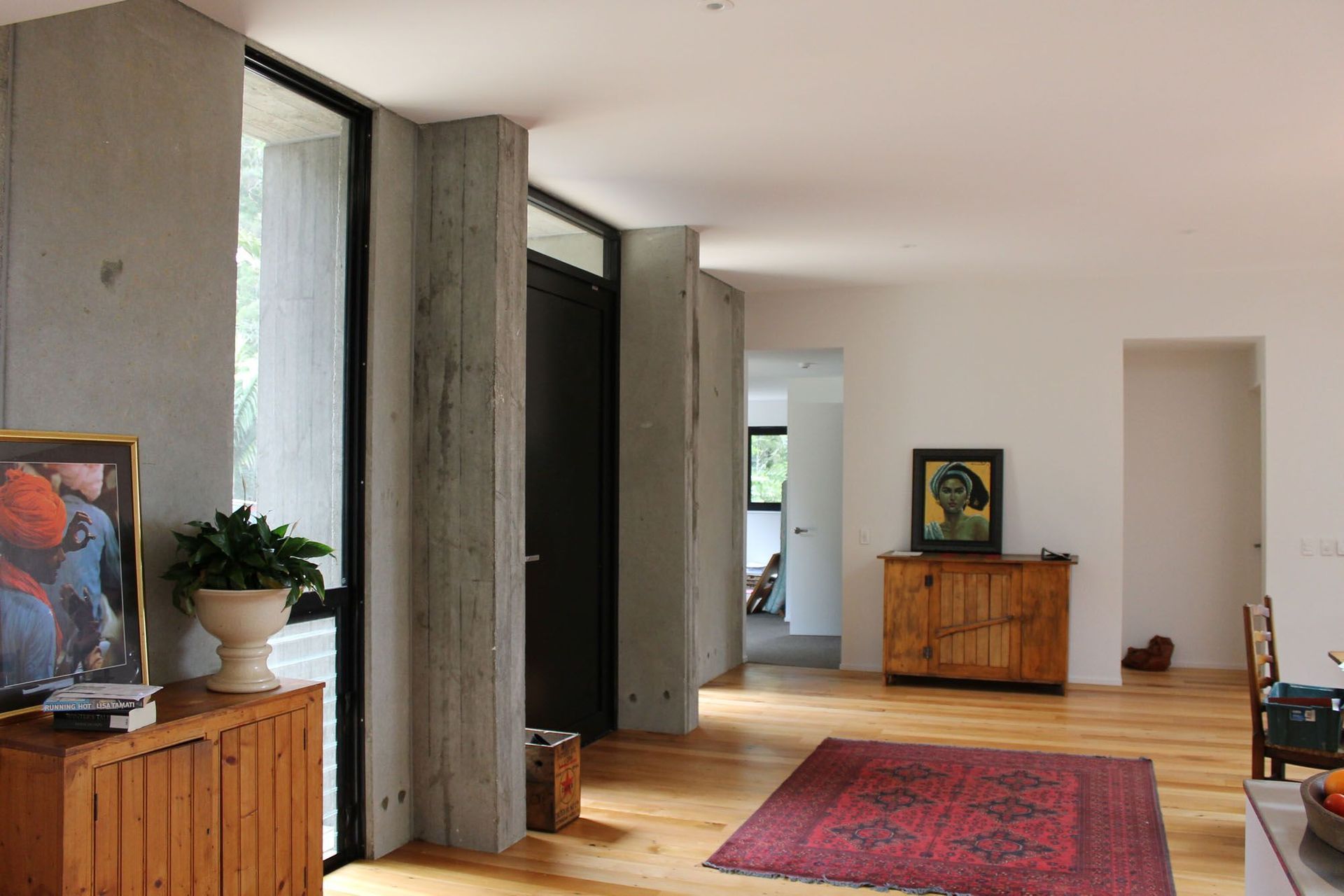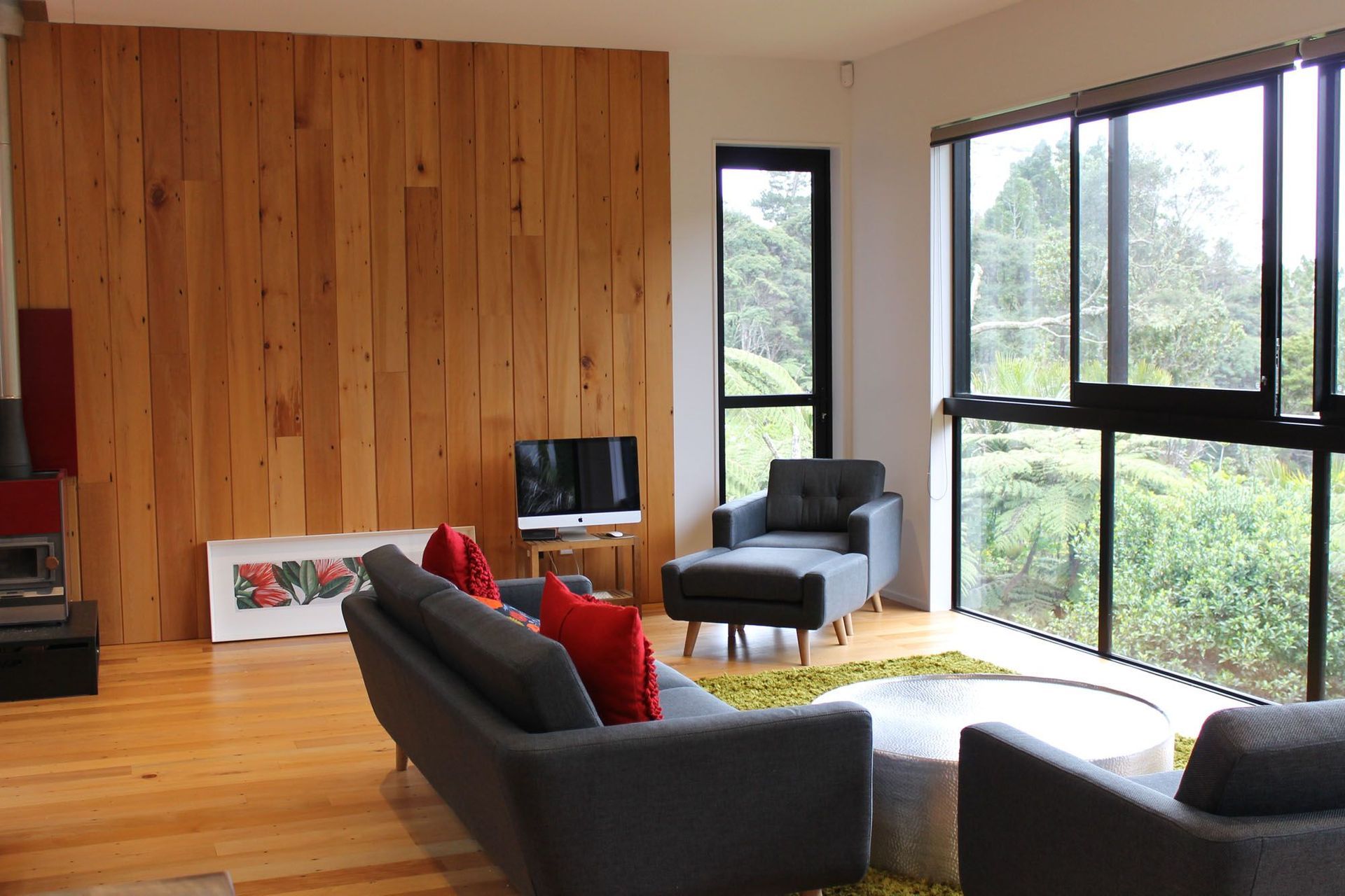 ArchiPro Project Summary - A stunning architecturally designed home in Oratia, West Auckland, featuring a blend of modern aesthetics and recycled materials from the original house, creating a stylish and sustainable living space for Tania and Aiden.