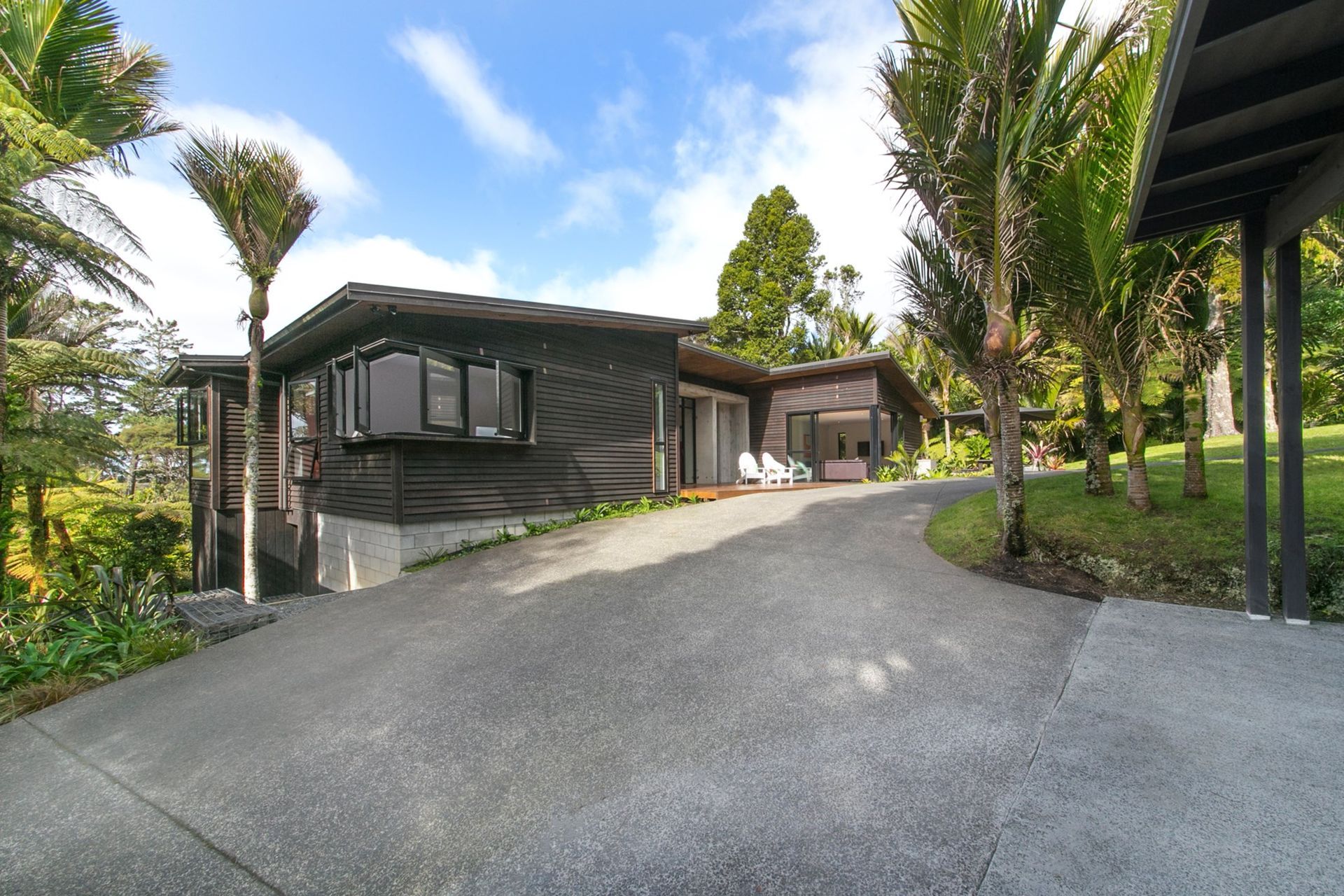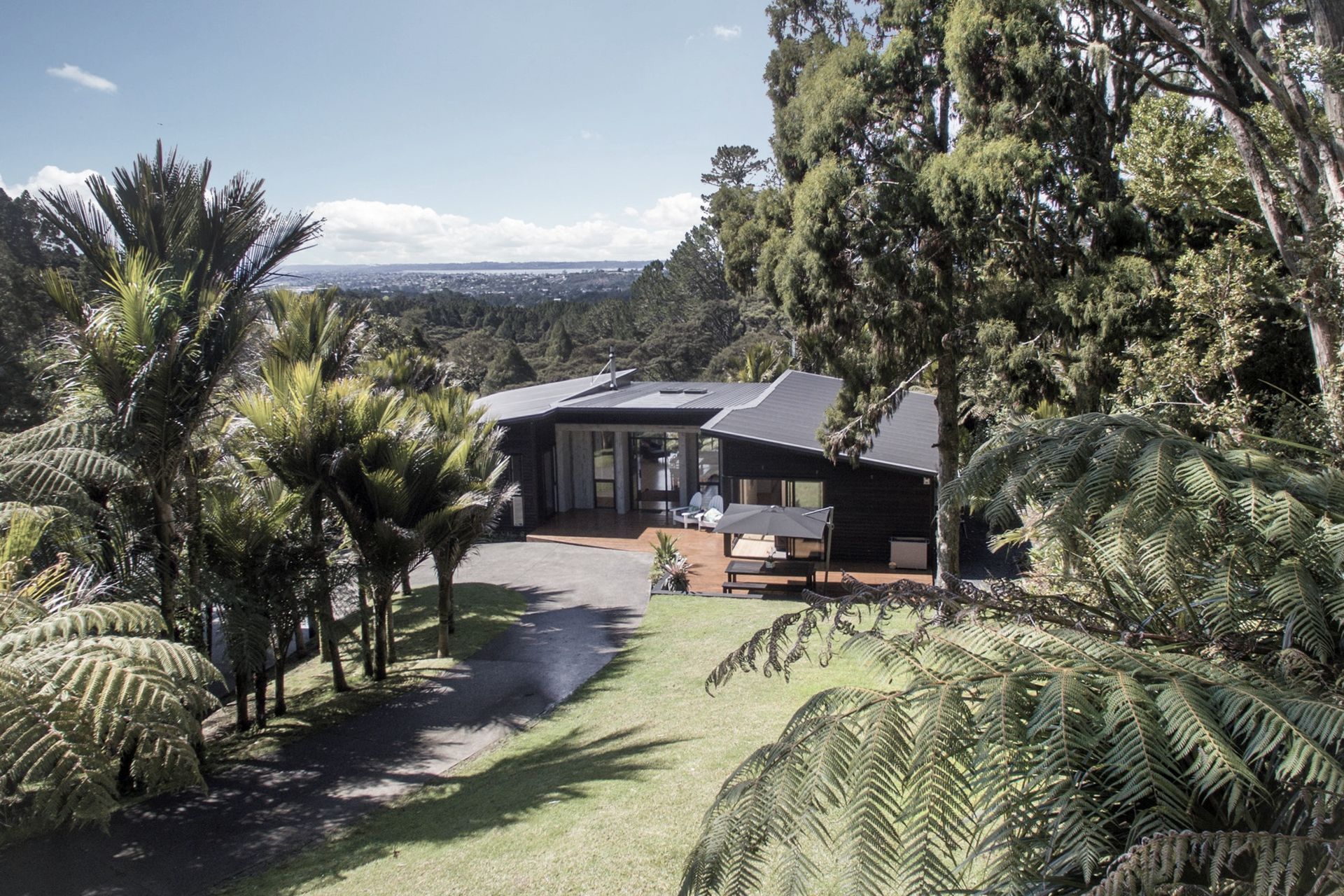 ArchiPro Project Summary - Serene new home nestled in the Waitakere Ranges, featuring Cedar cladding and Litecrete Precast concrete panels that enhance its striking entry.