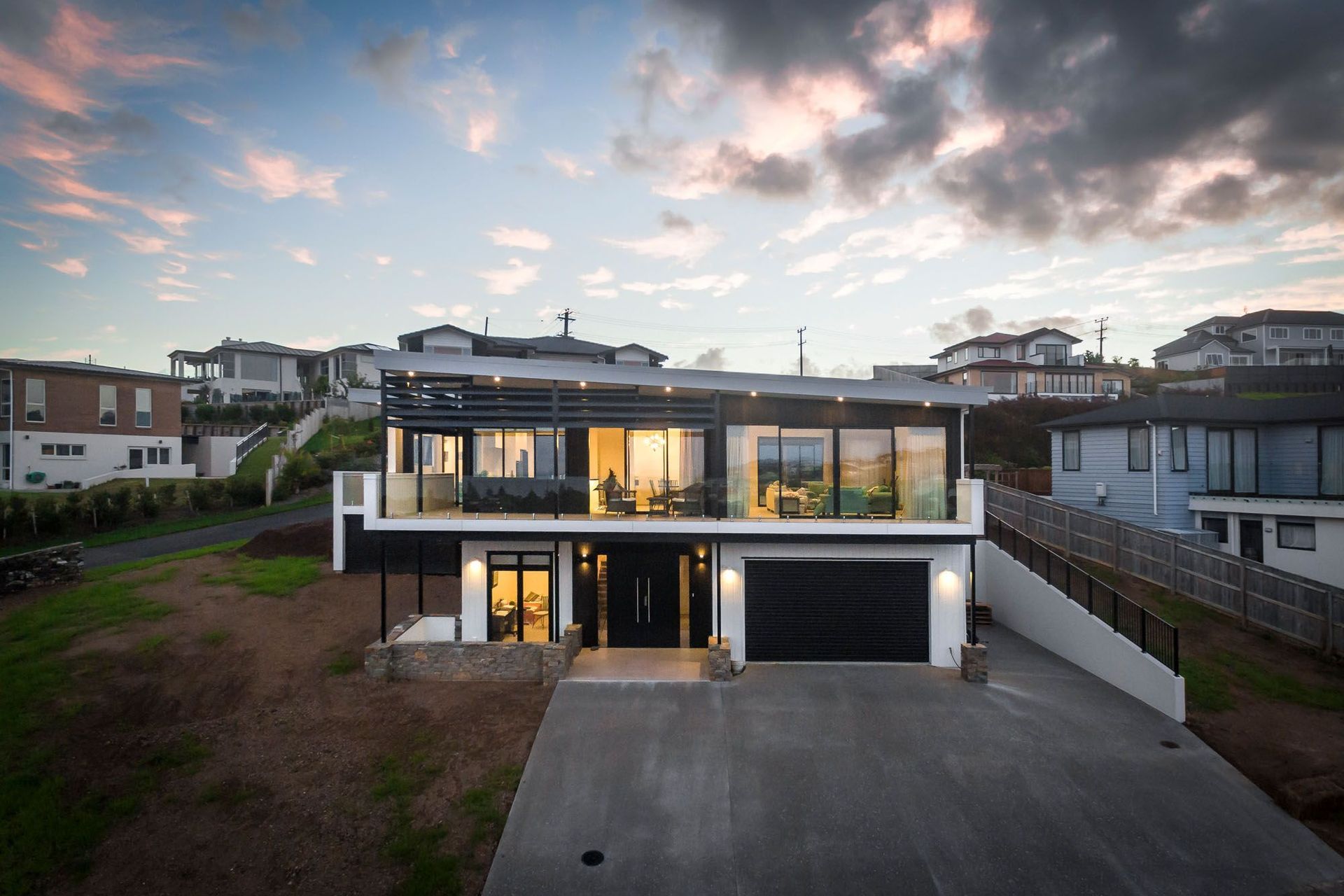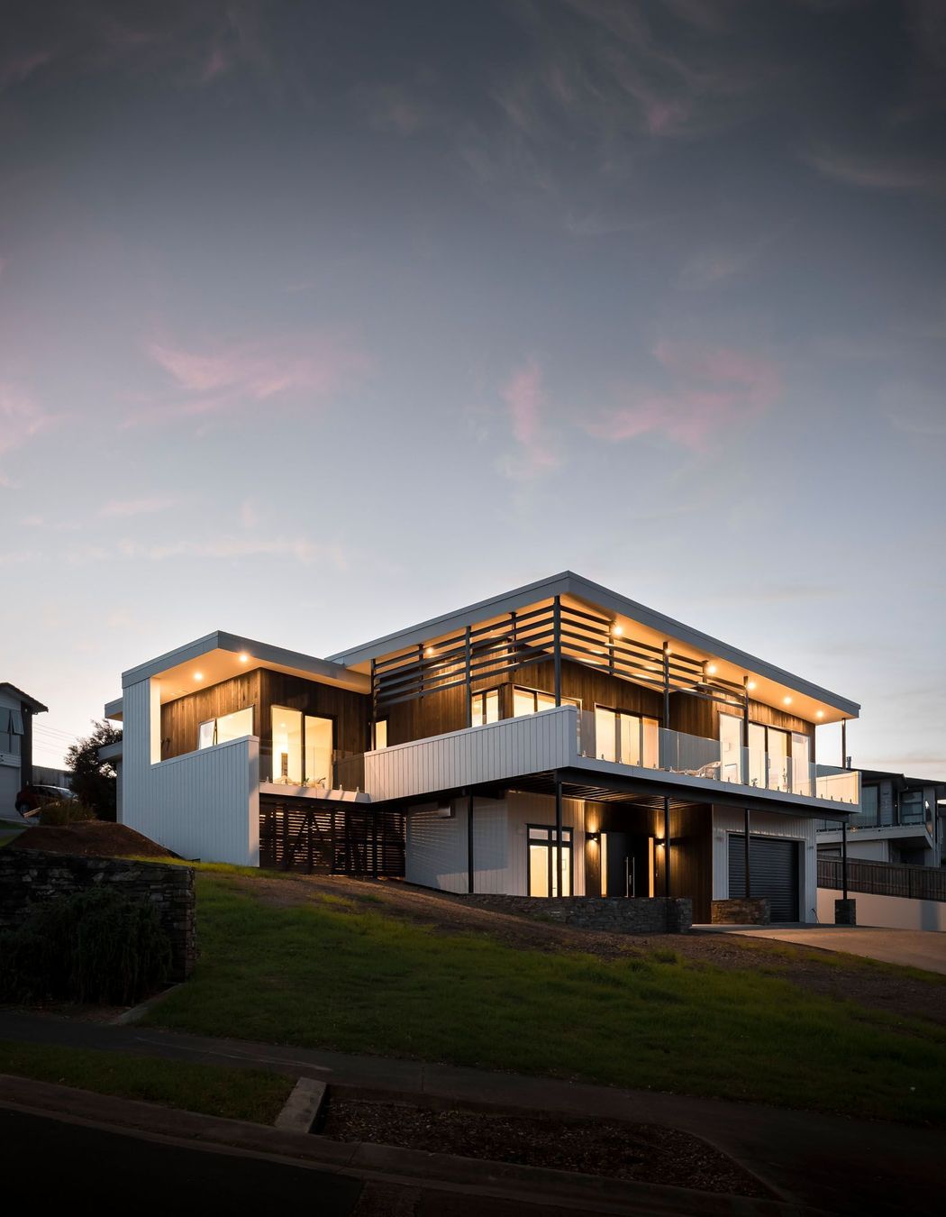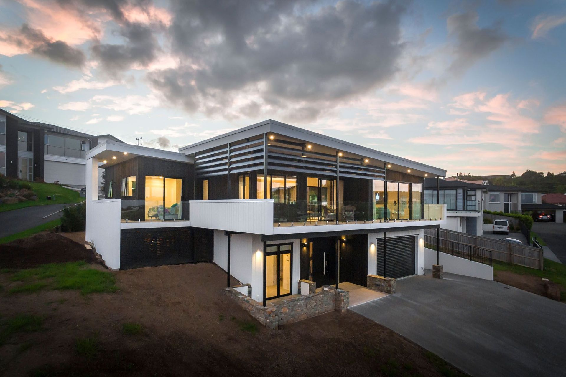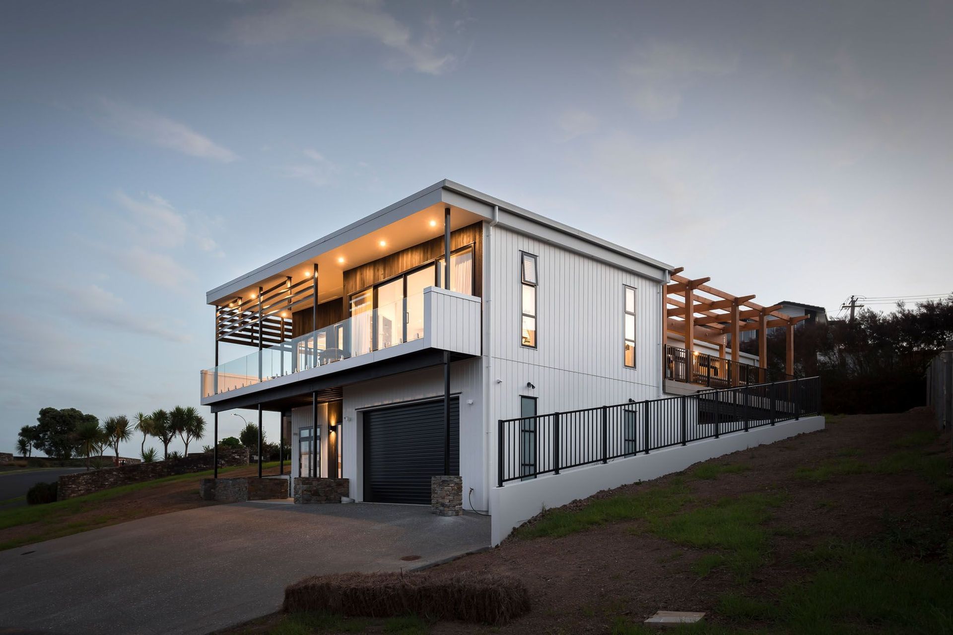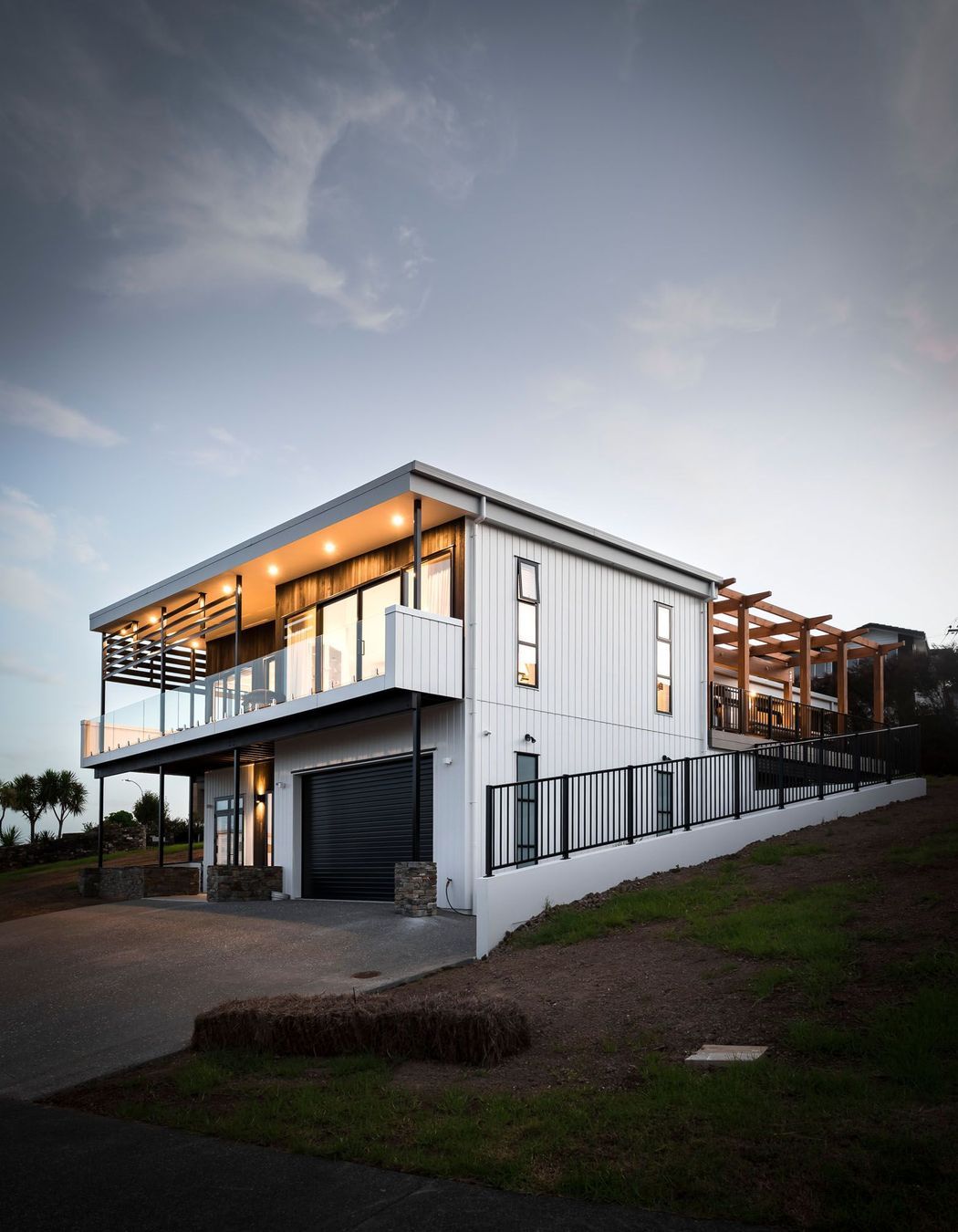 ArchiPro Project Summary - The Orewa New Build features a striking facade of composite materials, embodying Brutalist architecture and enhancing the surrounding estate.