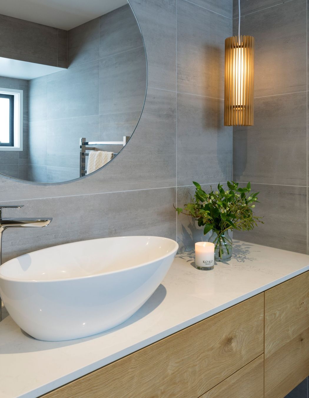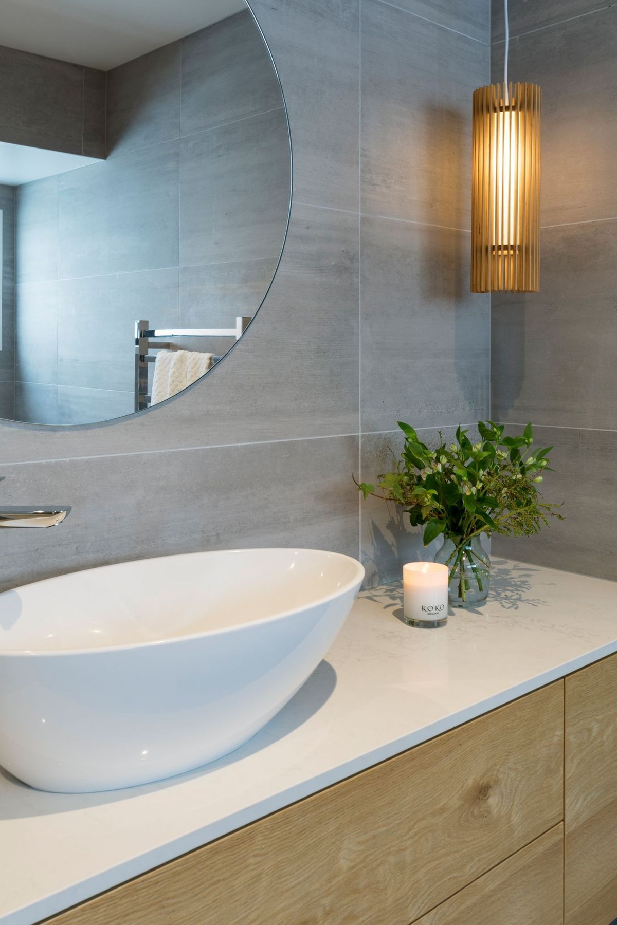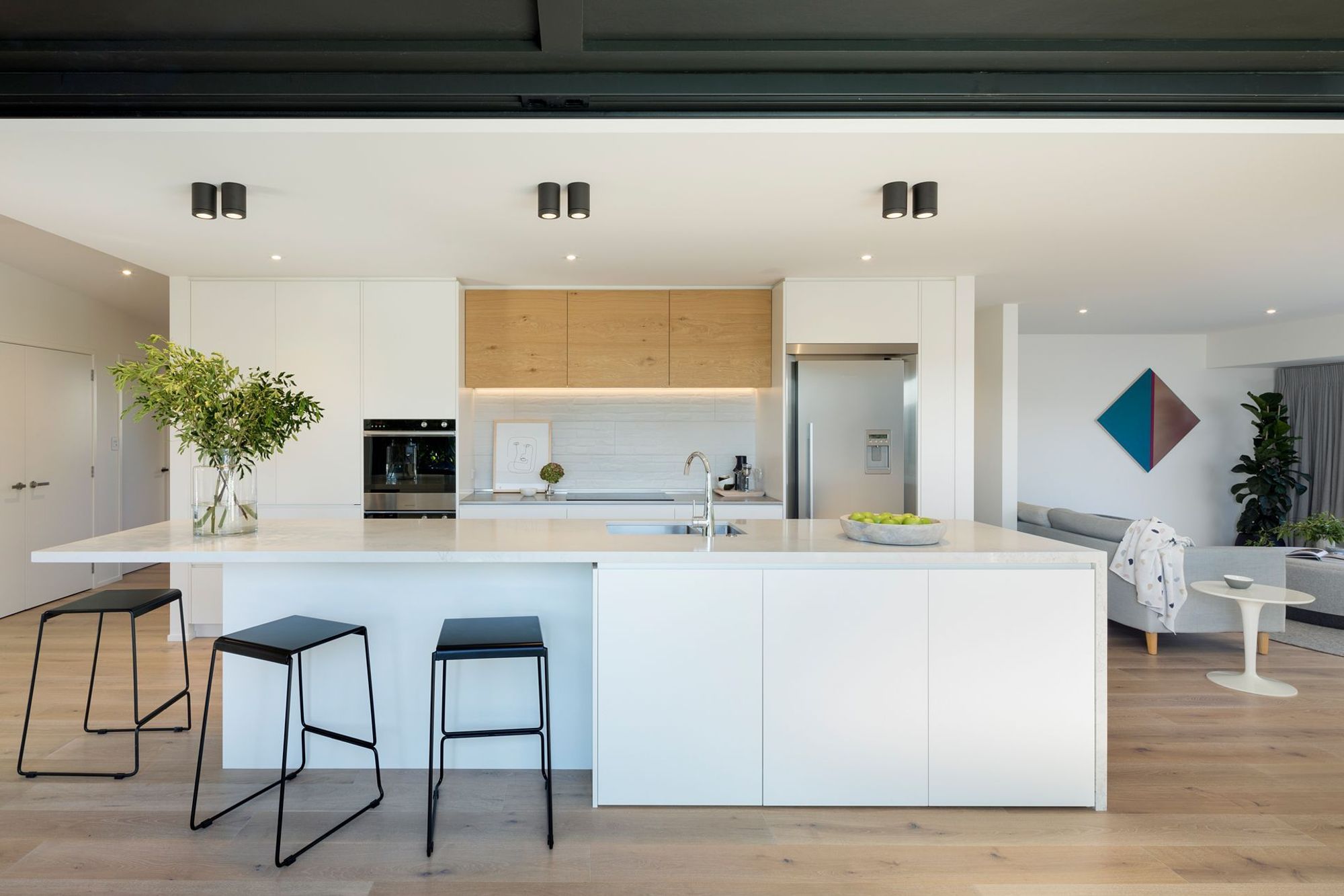 ArchiPro Project Summary - A transformative renovation of a 1965 home, featuring a sleek design, neutral palette, and functional spaces, enhanced by designer lighting, Ceaserstone benchtops, and custom oak cabinetry for a modern family-friendly atmosphere.