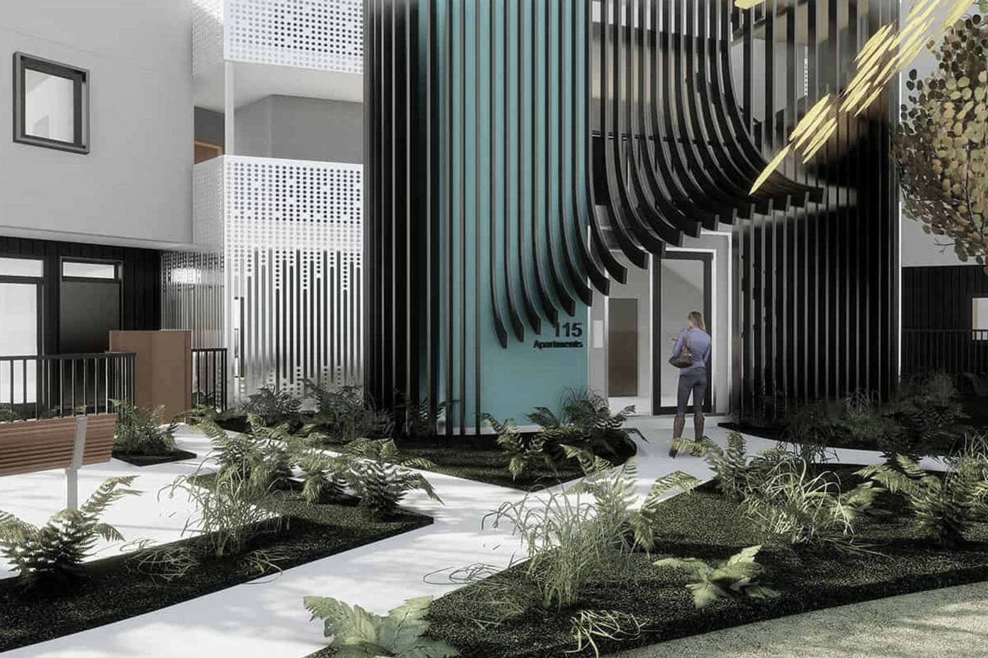 ArchiPro Project Summary - Oxford Terrace features 28 one-bedroom accessible apartments across five levels, complemented by two standalone 4-bed dwellings and two 2-bed accessible units, all designed for optimal solar gain and community engagement.