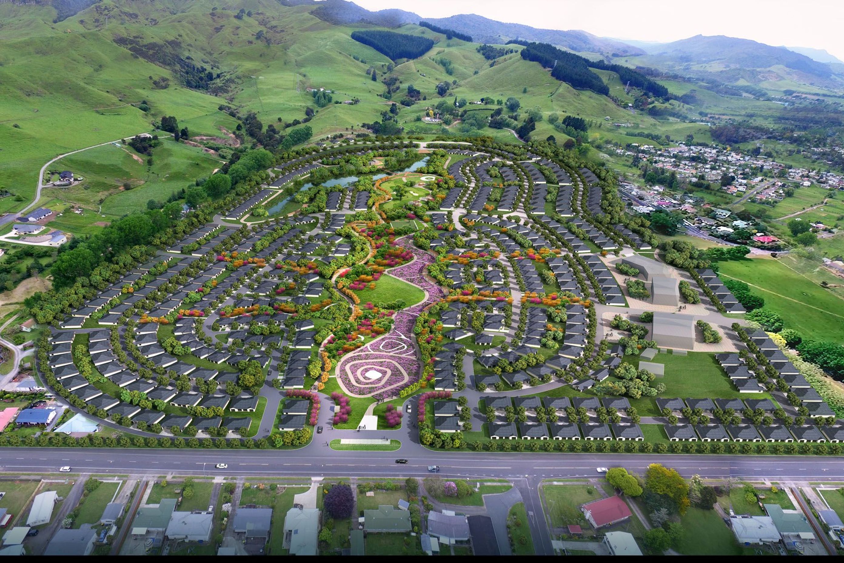 ArchiPro Project Summary - Paeroa Retirement Village featuring 602 units, comprehensive urban and landscape design, and a gross floor area of 64,500 sqm, located on a 332,000 sqm site in Paeroa, New Zealand, currently in the concept design phase.