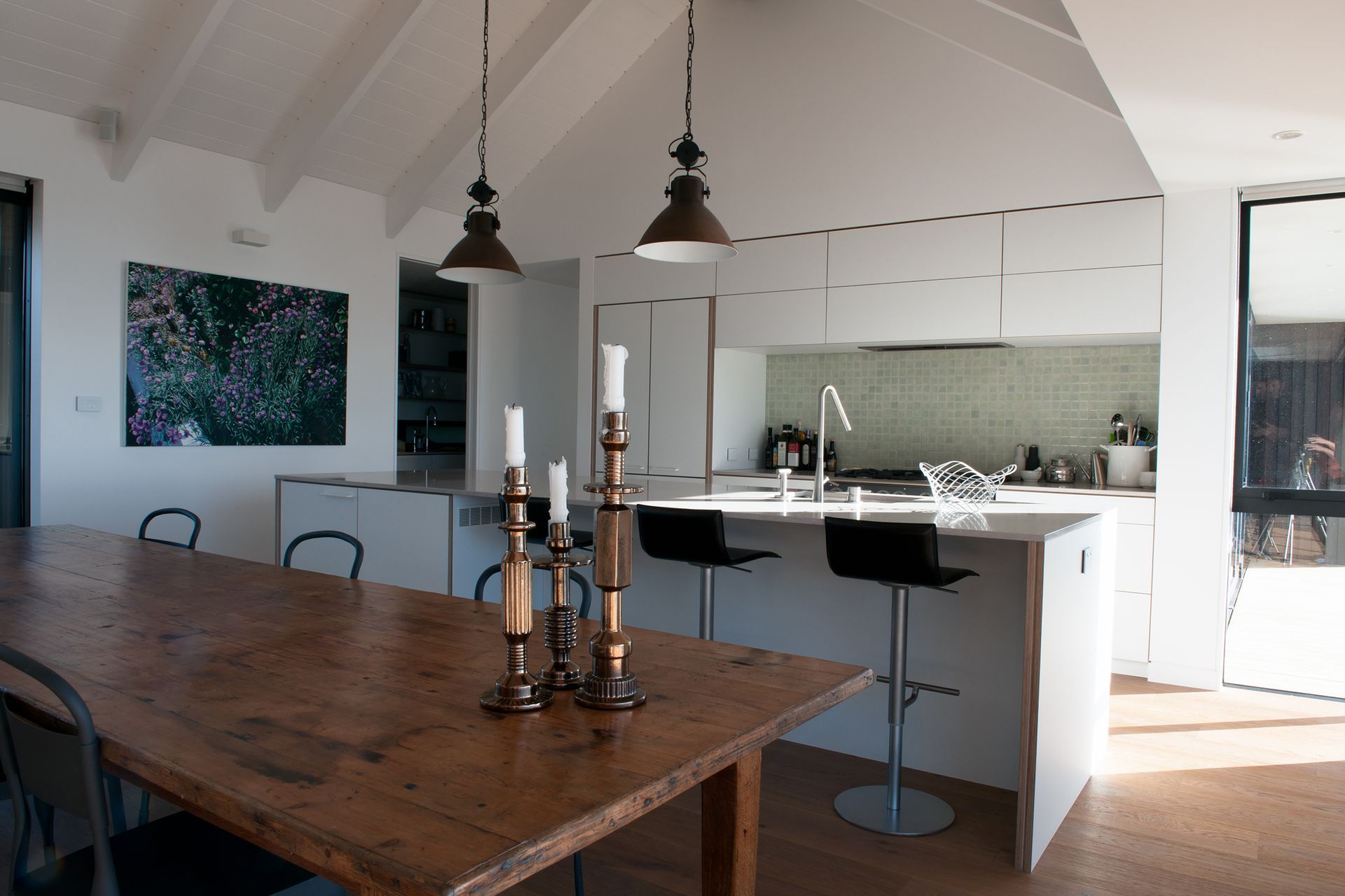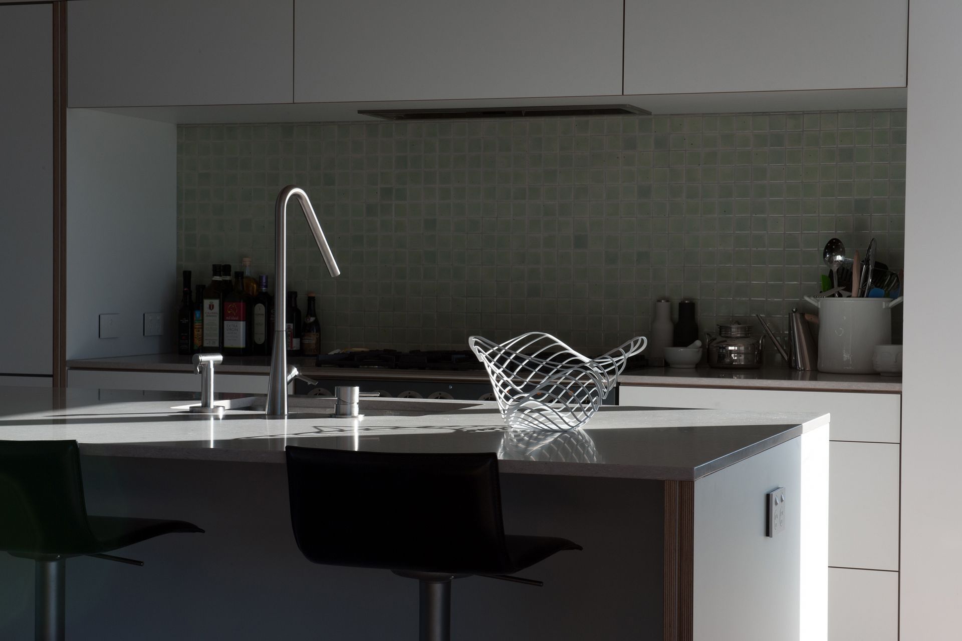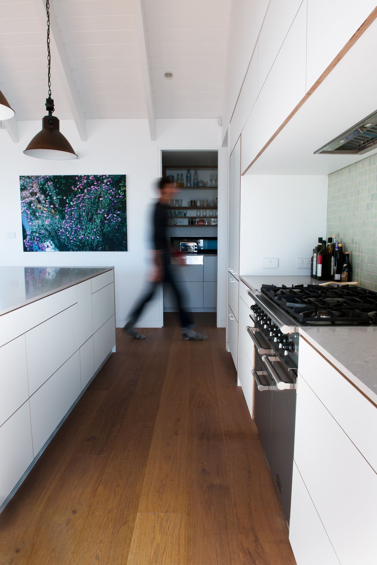 ArchiPro Project Summary - Bright plywood kitchen crafted by Shoreditch for the award-winning Pah Road home, built by Pitch Construction on a stunning Waiheke clifftop, showcasing exceptional design and sustainable materials.