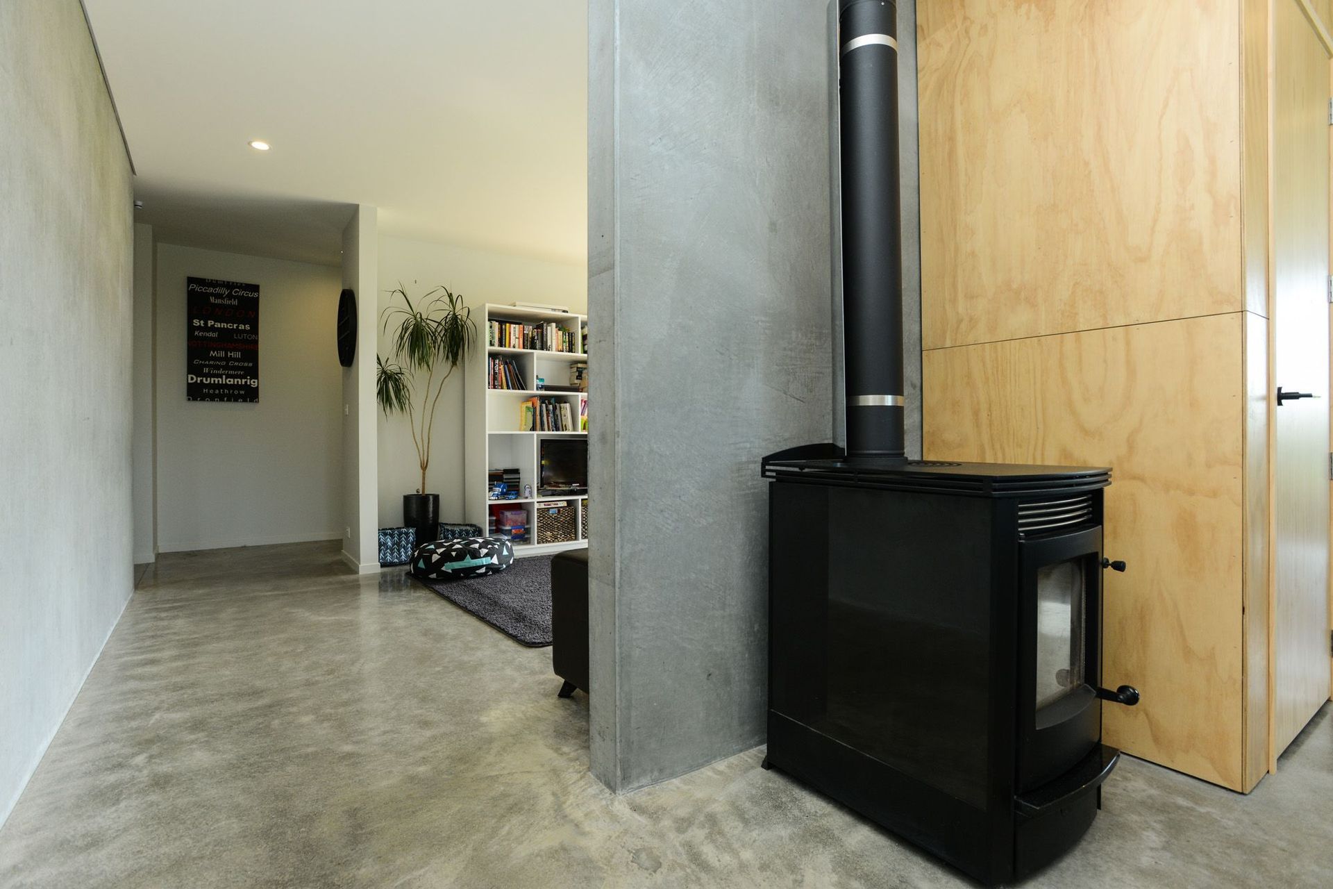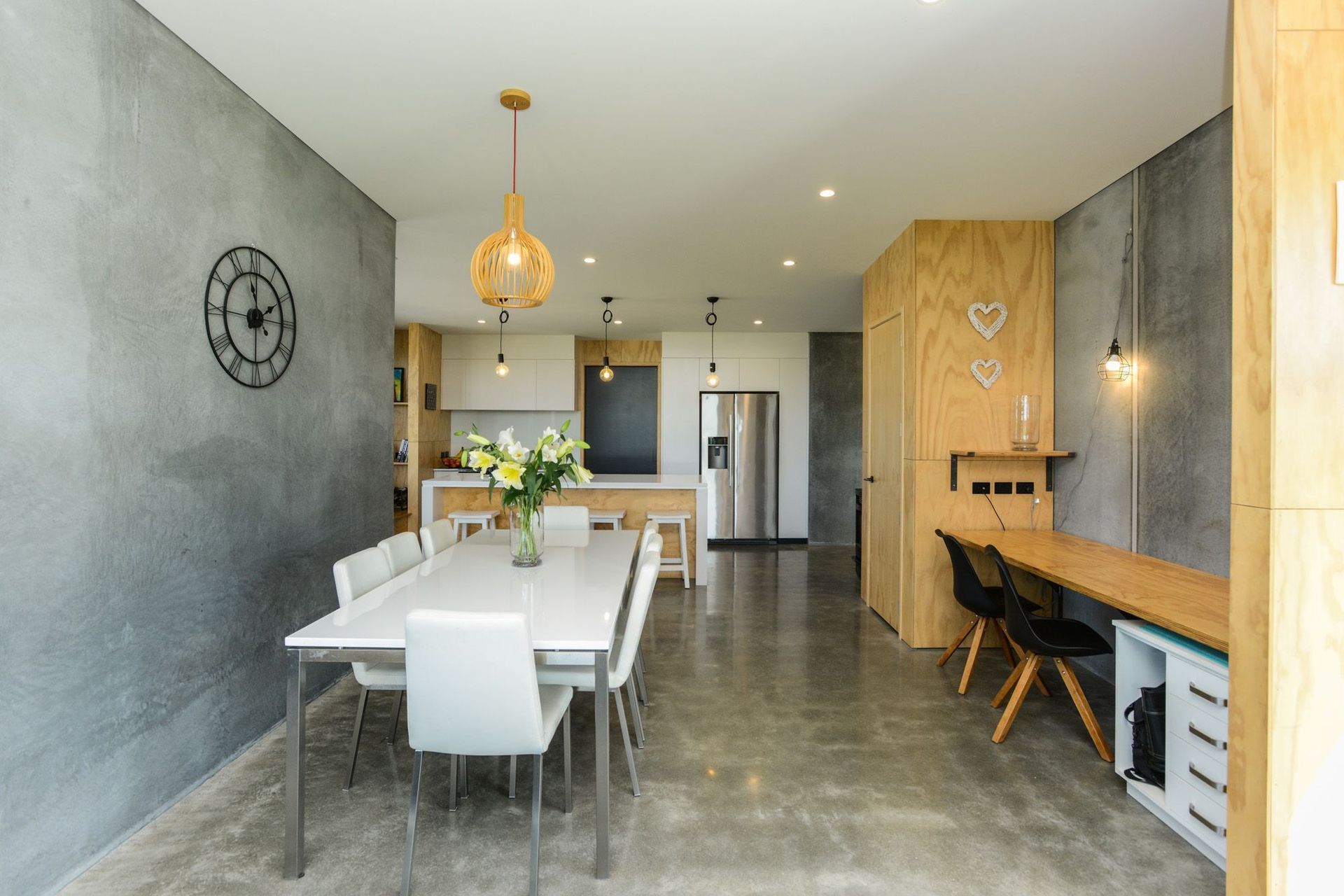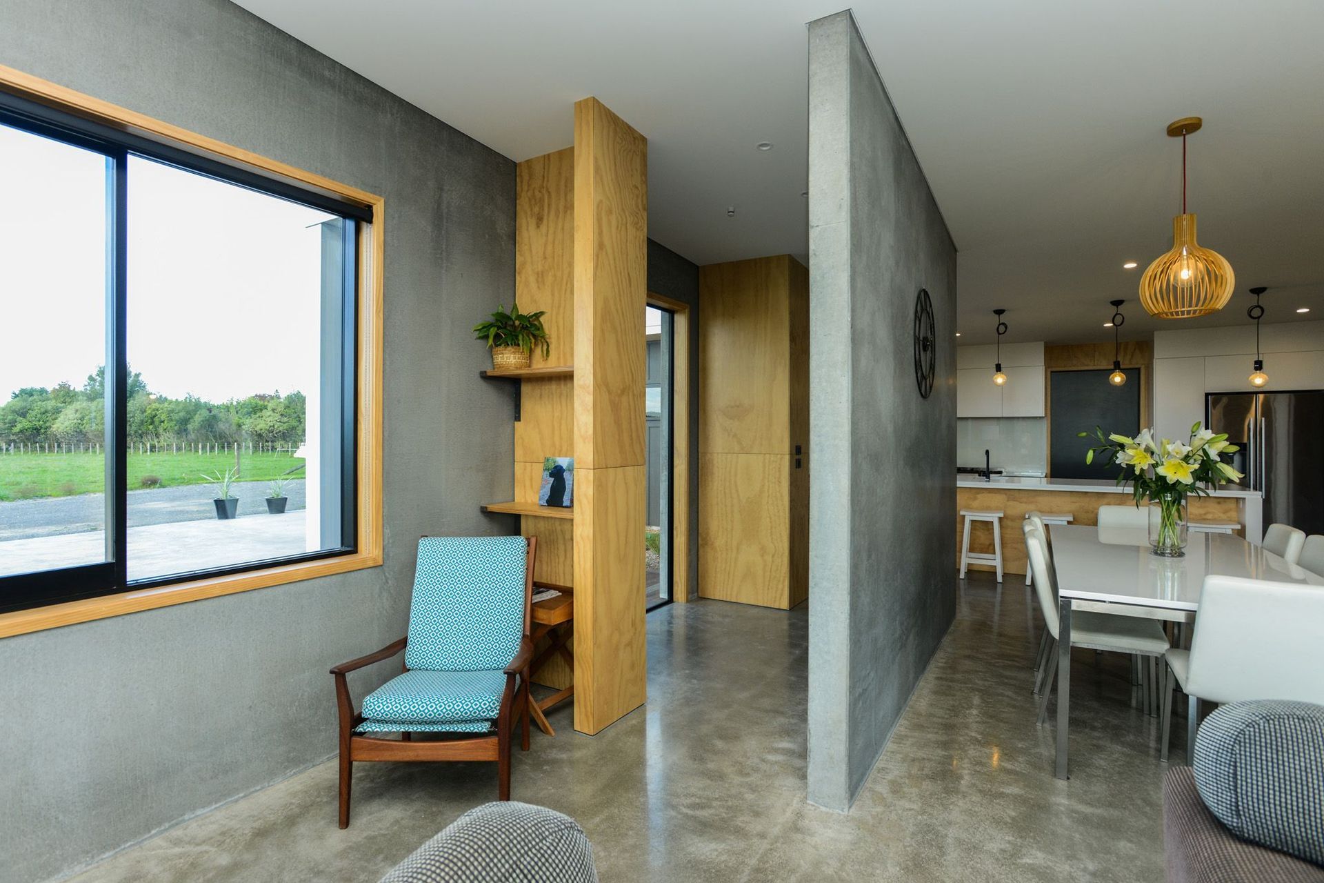 ArchiPro Project Summary - Contemporary home and office new build featuring durable concrete precast panels and a warm ply interior.