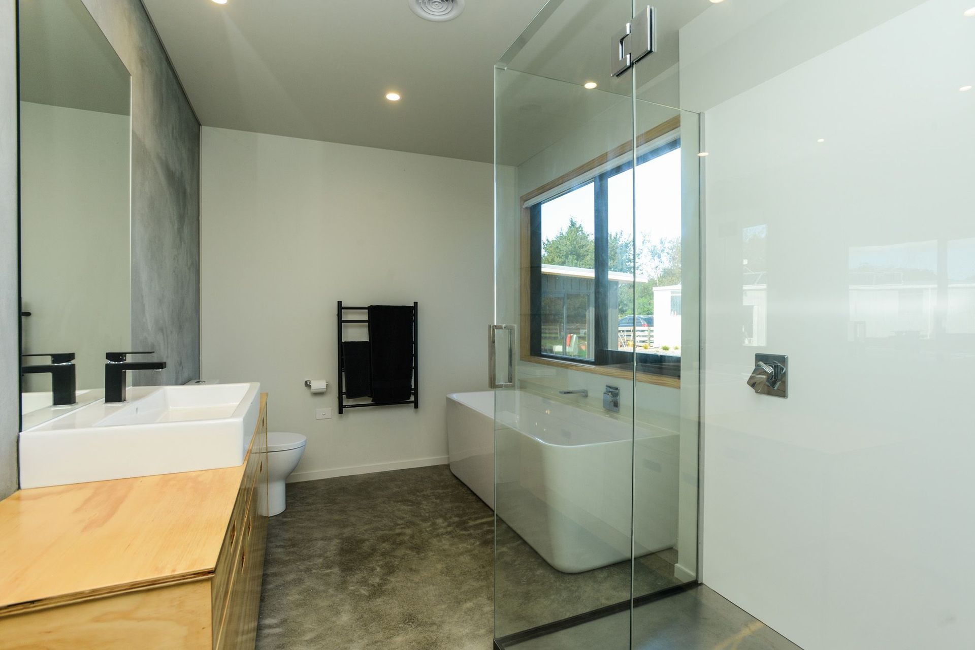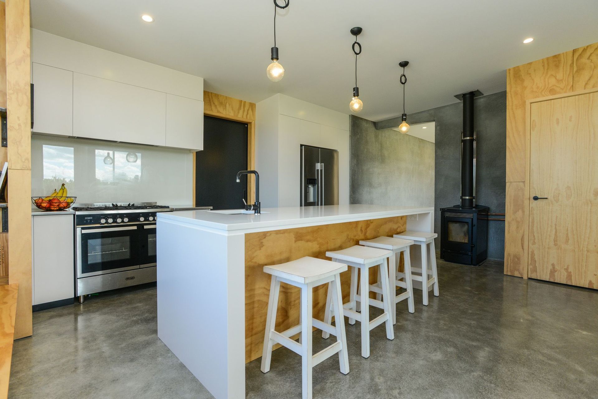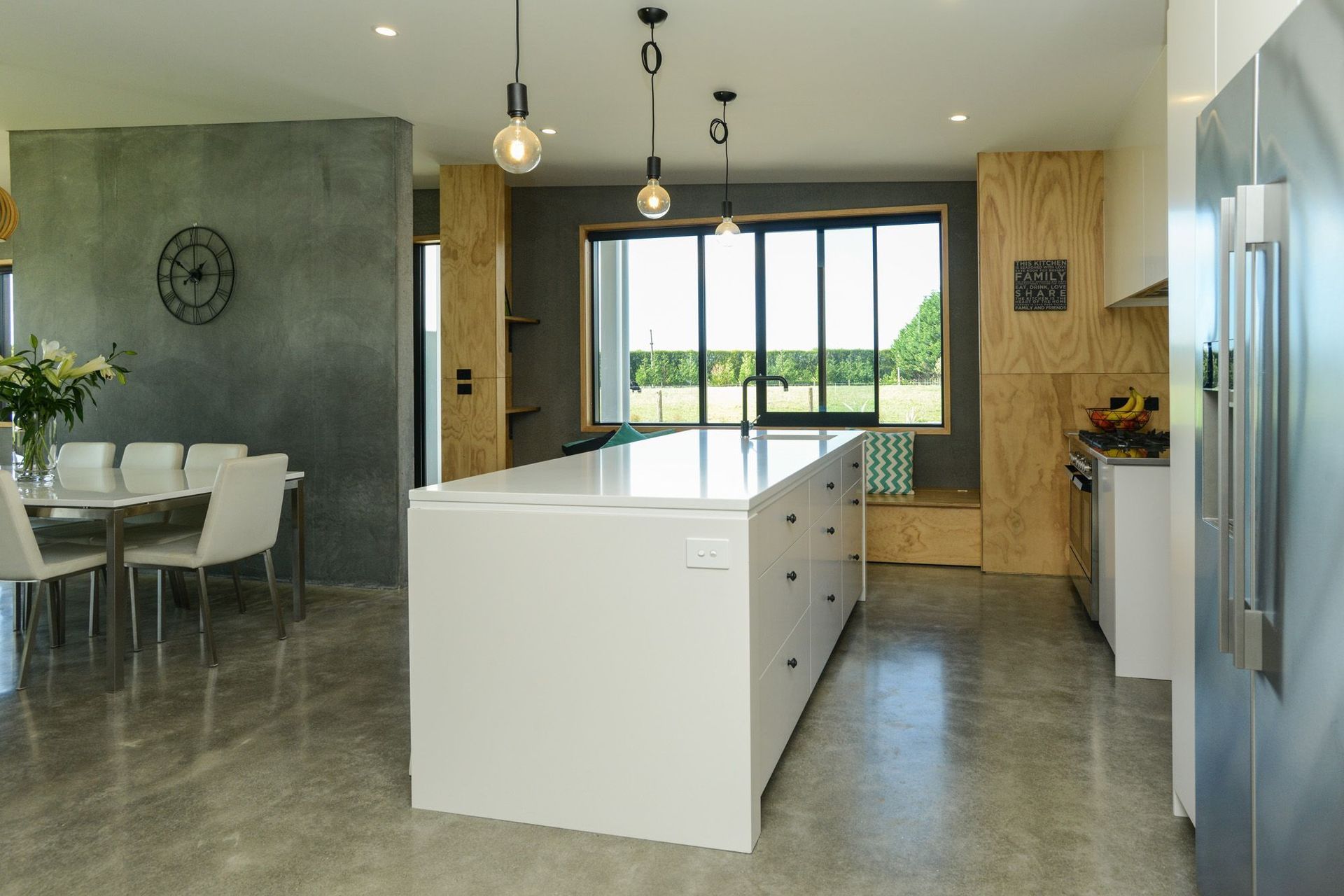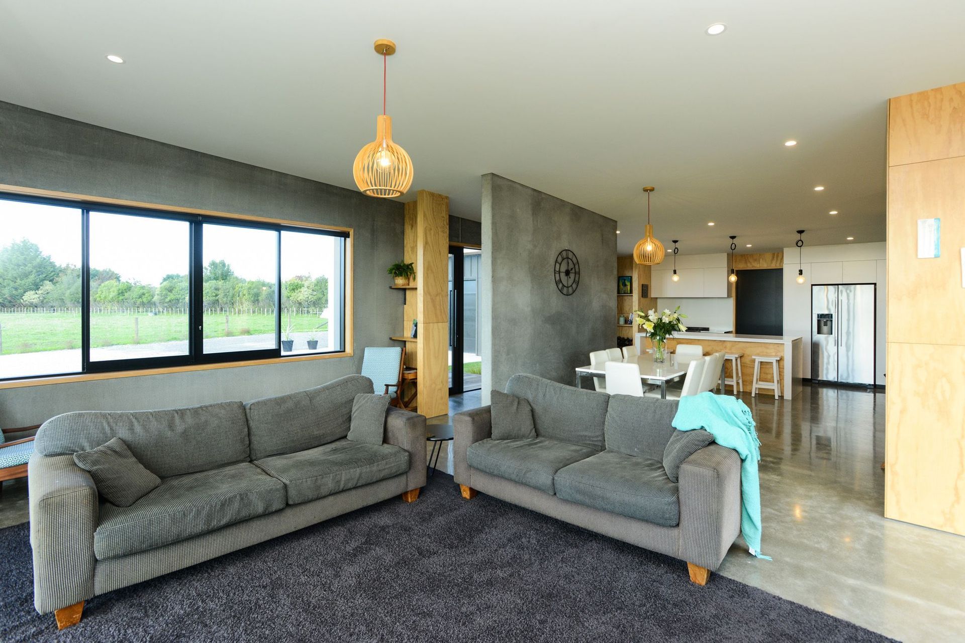 ArchiPro Project Summary - Contemporary home and office new build featuring durable concrete precast panels and a warm ply interior.