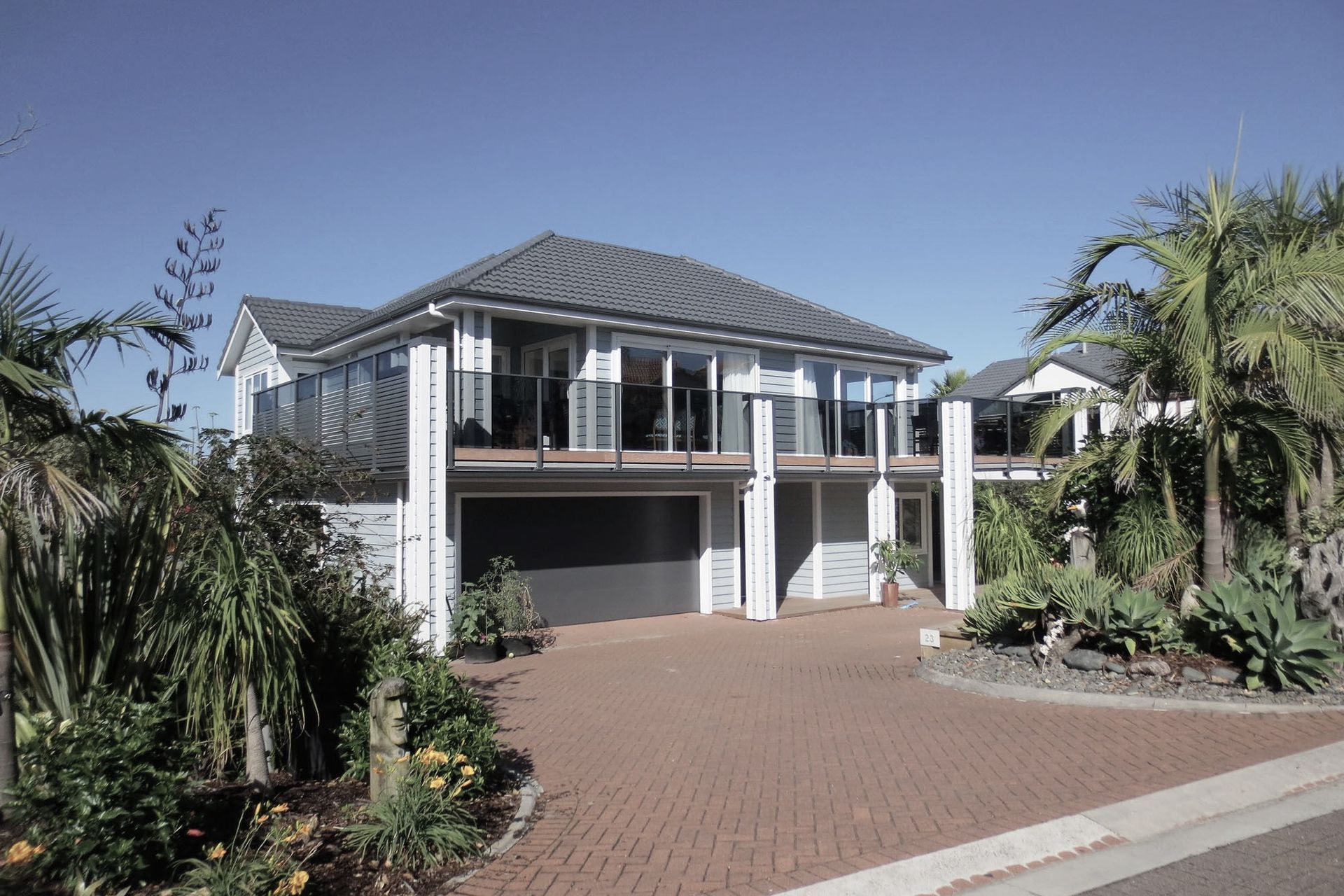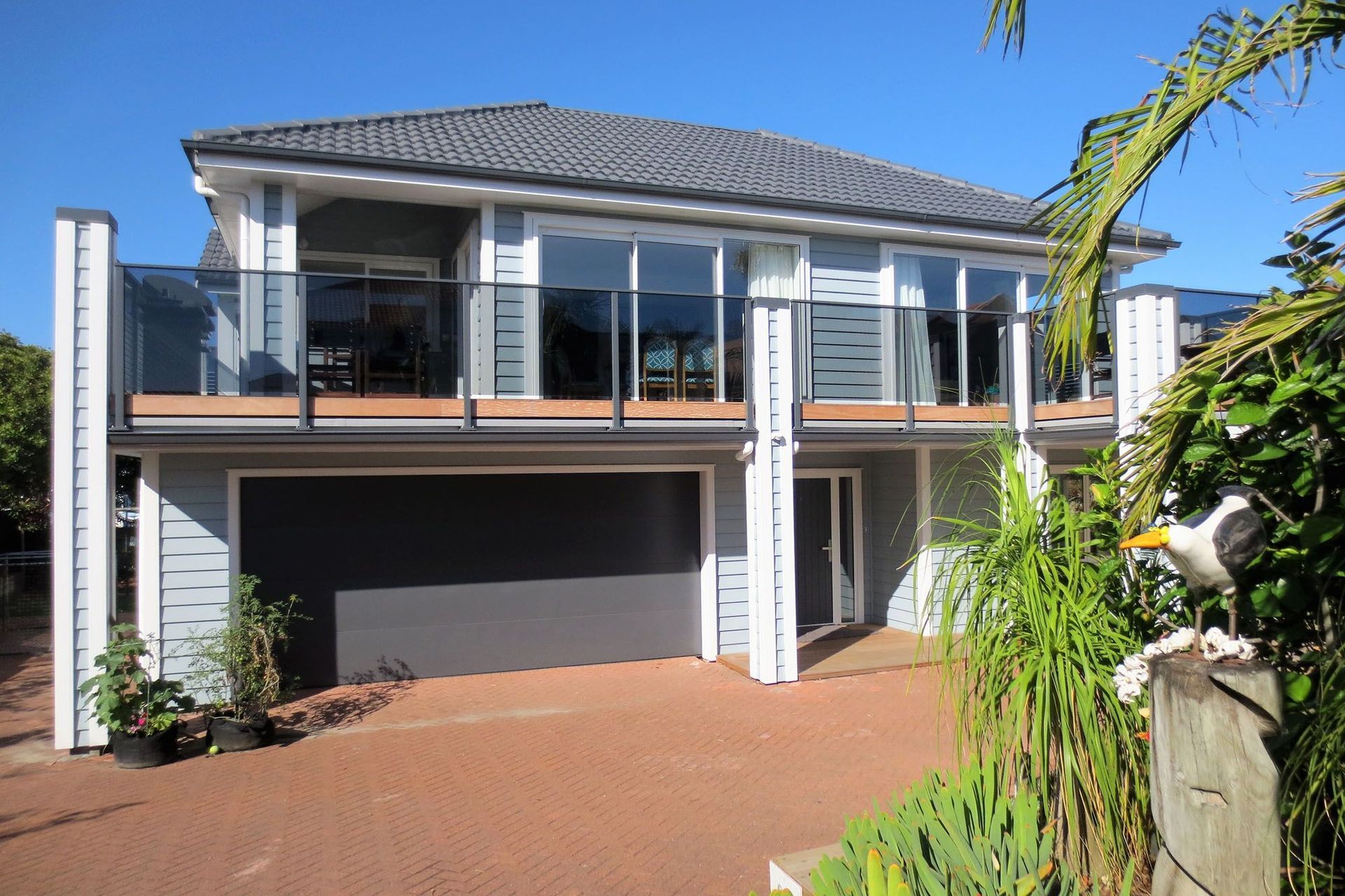 ArchiPro Project Summary - Comprehensive renovation of a Papamoa Beach Road residence, featuring complete recladding, rebuilt internal decks with modern balustrades, and updated kitchen and bathroom areas, including a self-contained flat on the lower level.