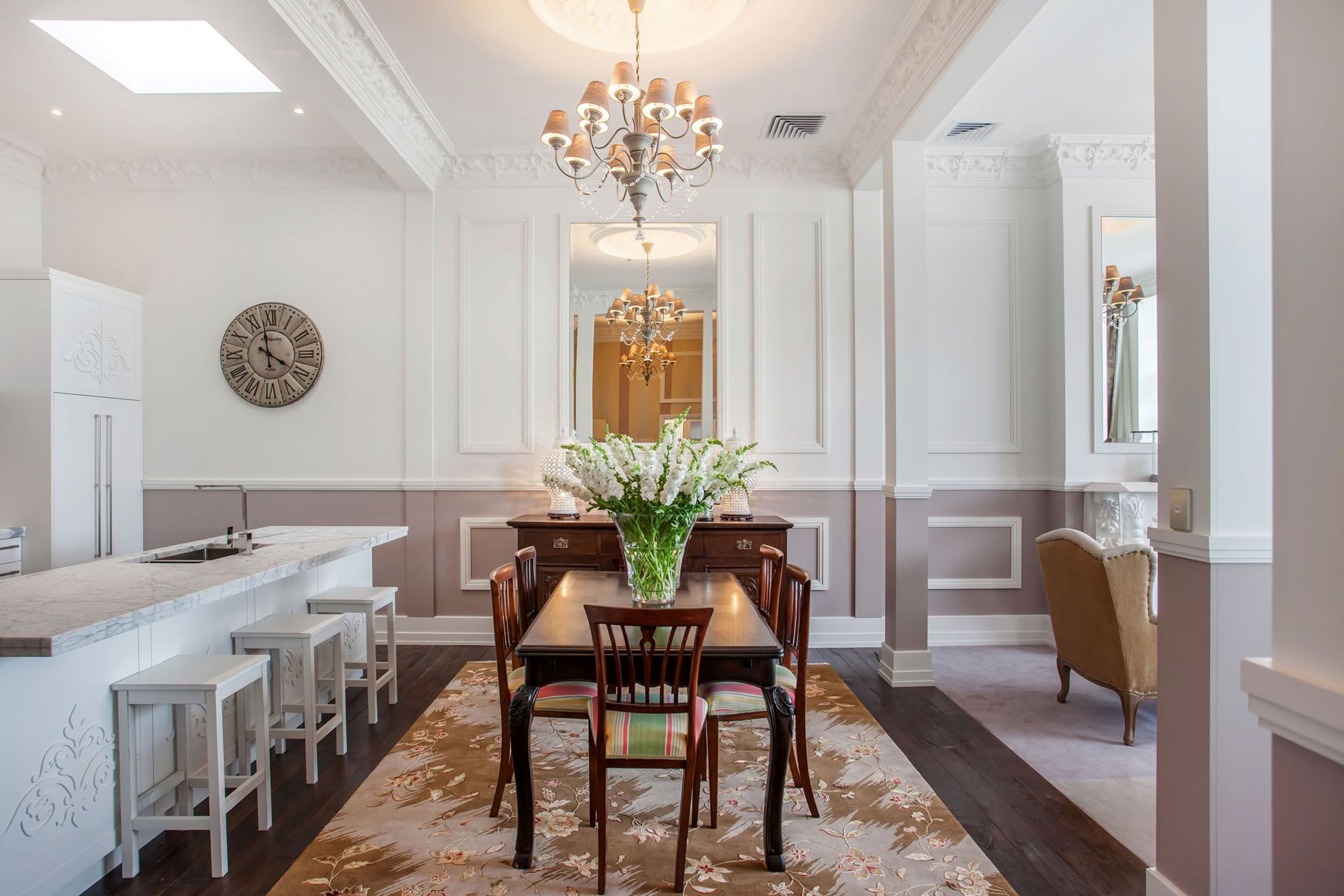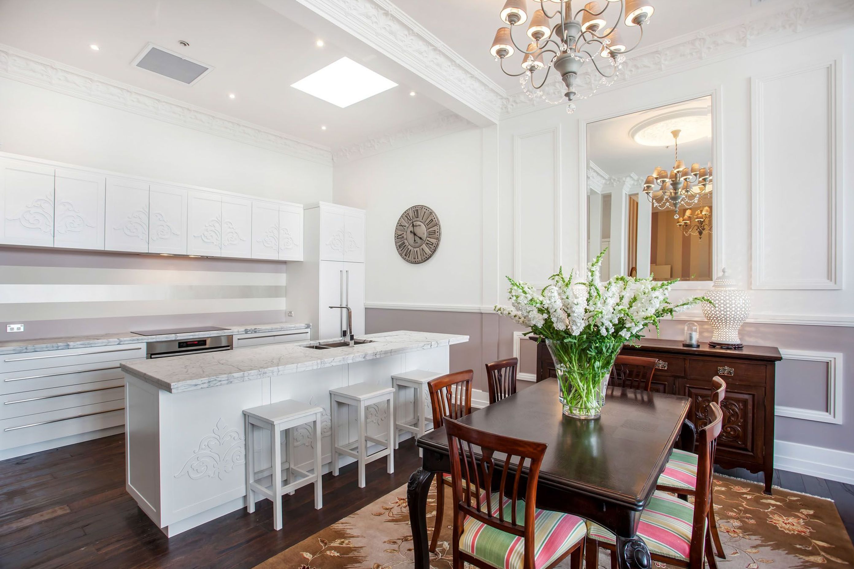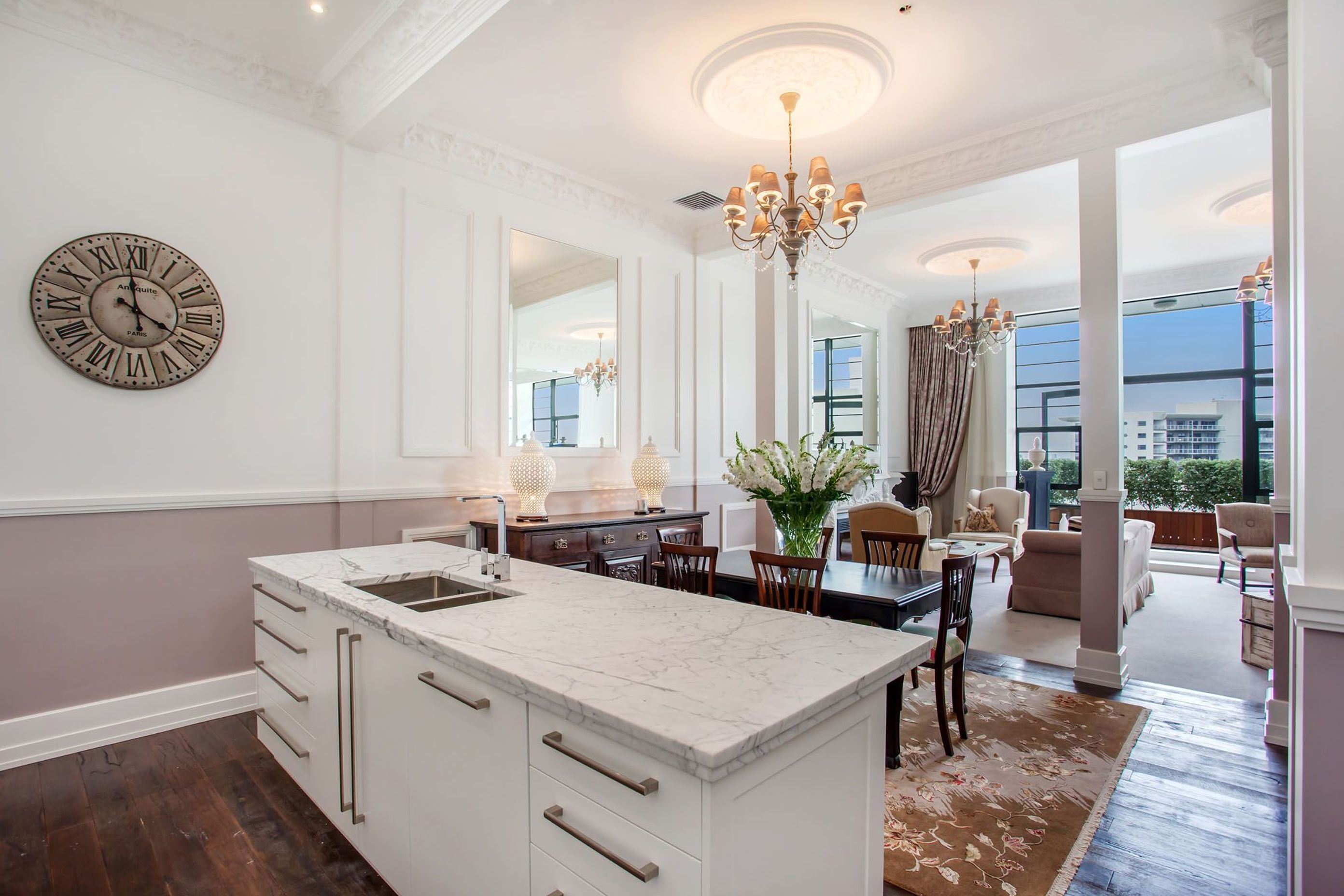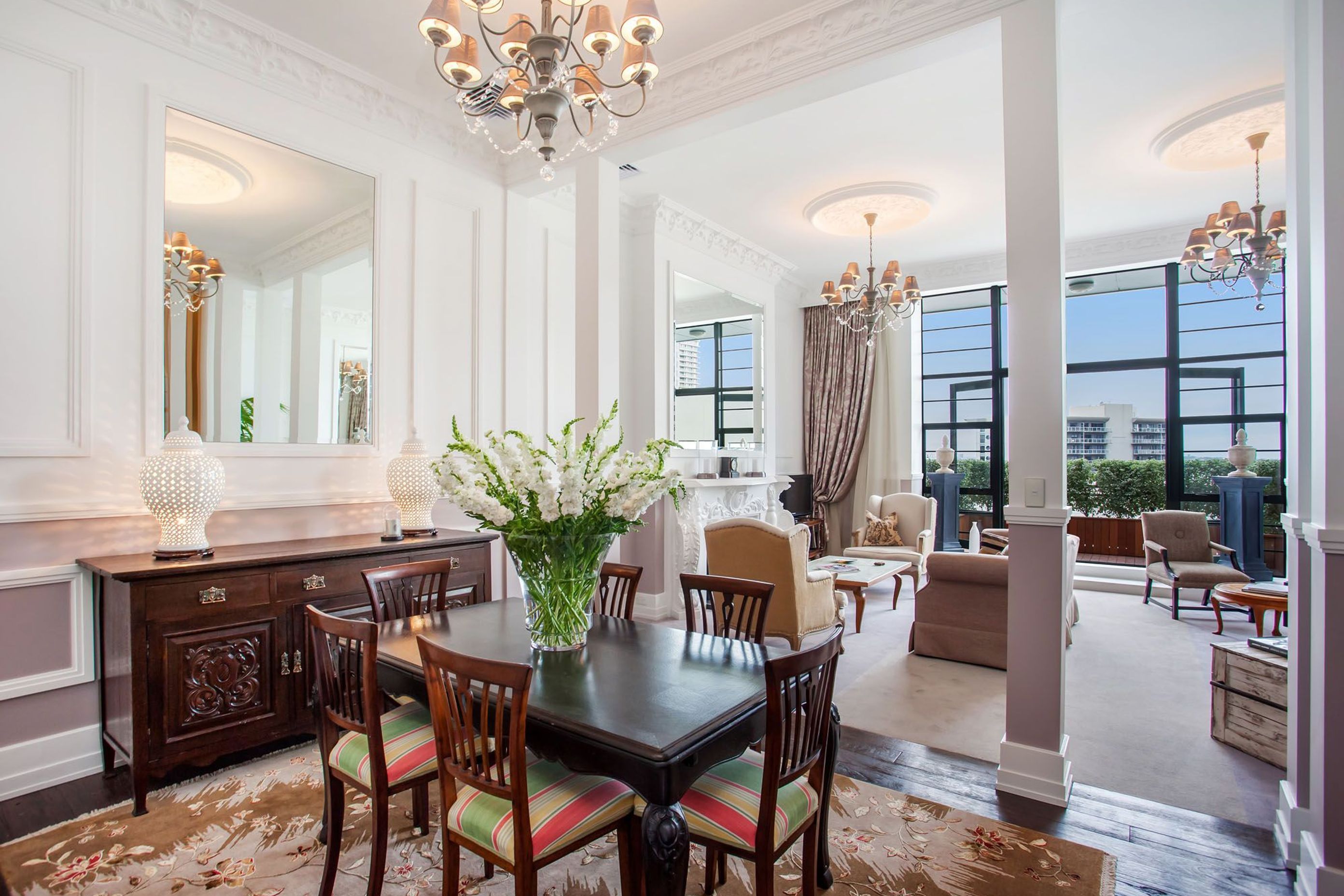 ArchiPro Project Summary - Transformation of a spacious penthouse into a Parisian style apartment featuring elegant moldings, paneling, and a soft color palette, complemented by custom damask-inspired kitchen cabinetry and a dignified entrance foyer.