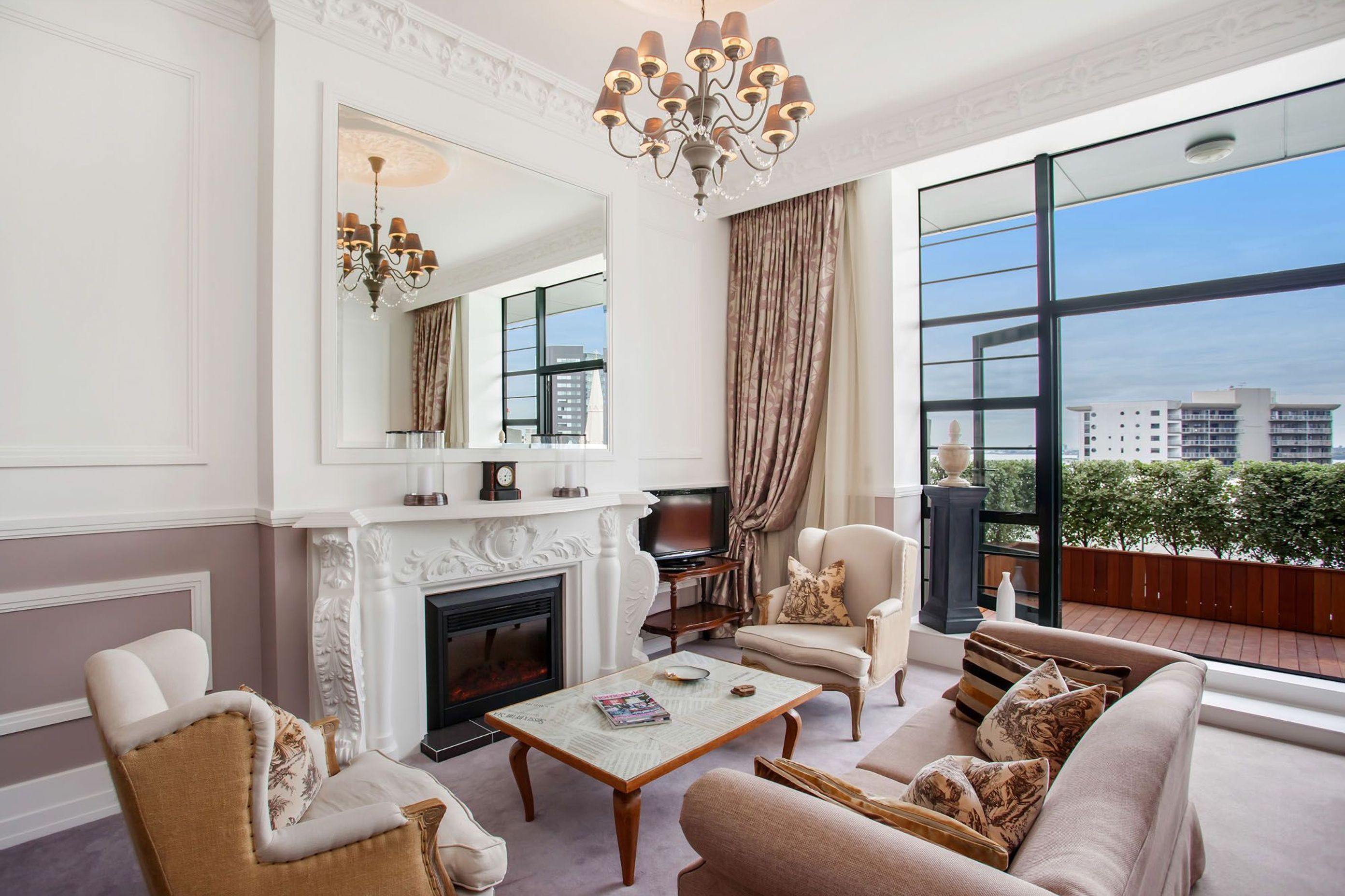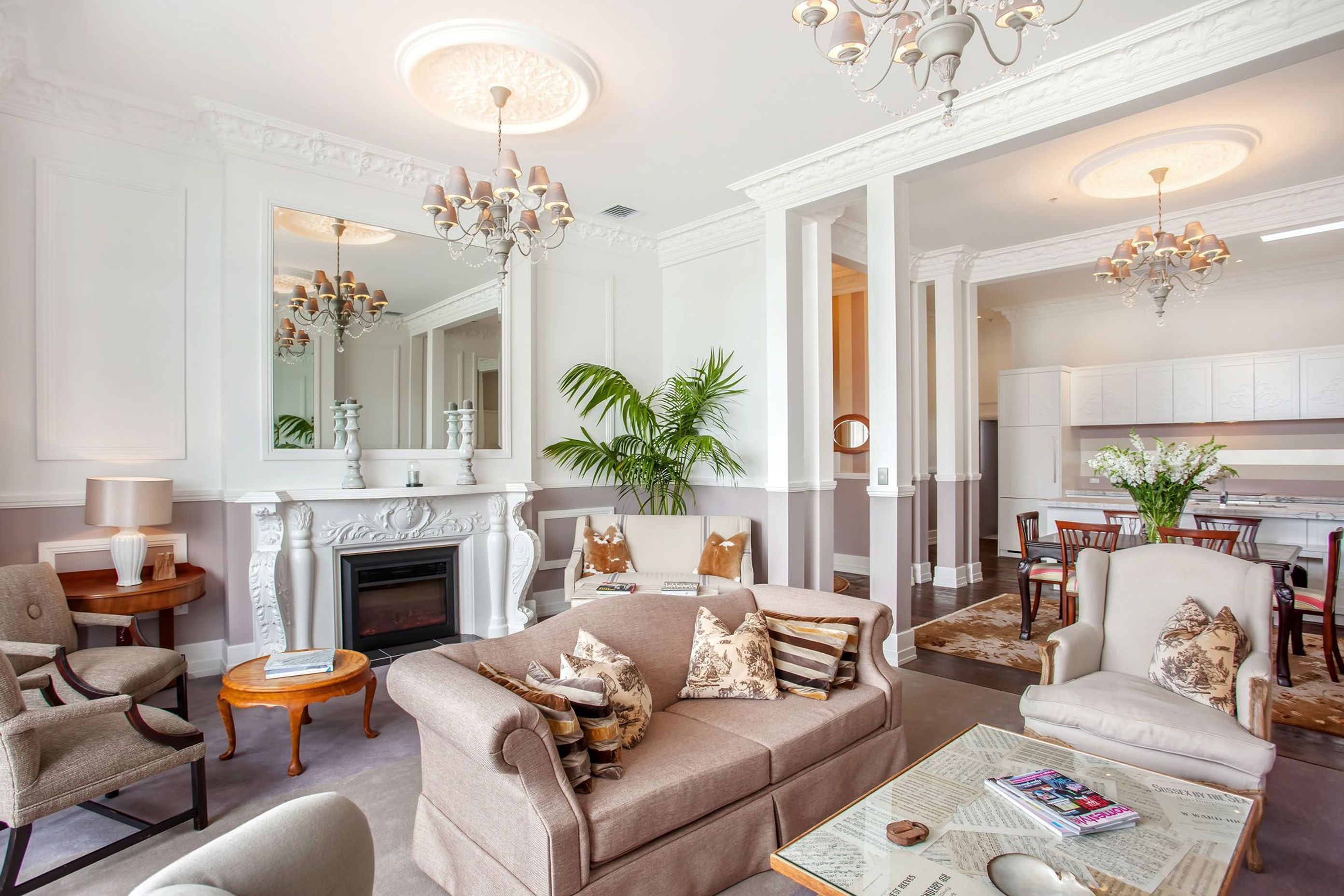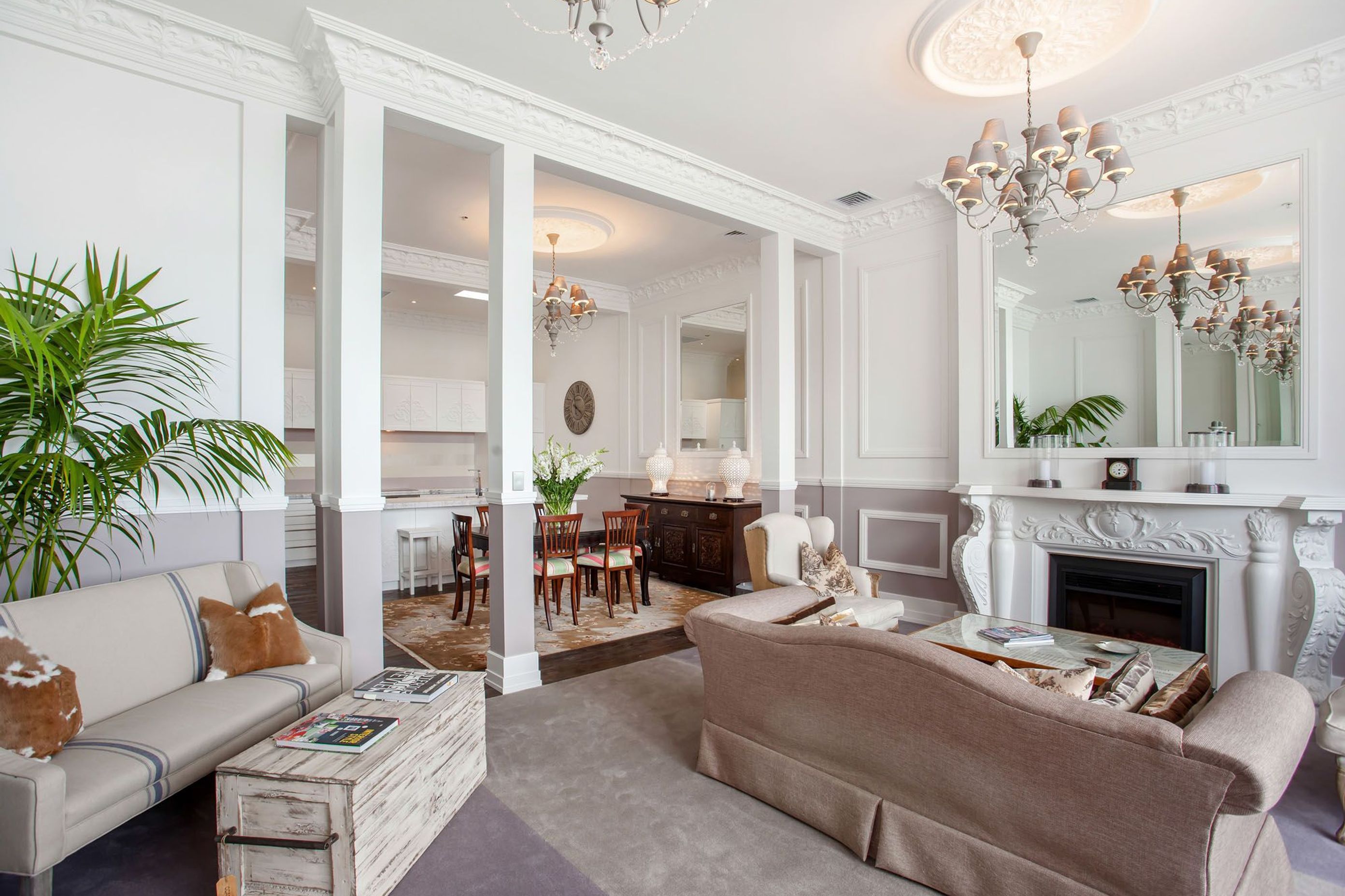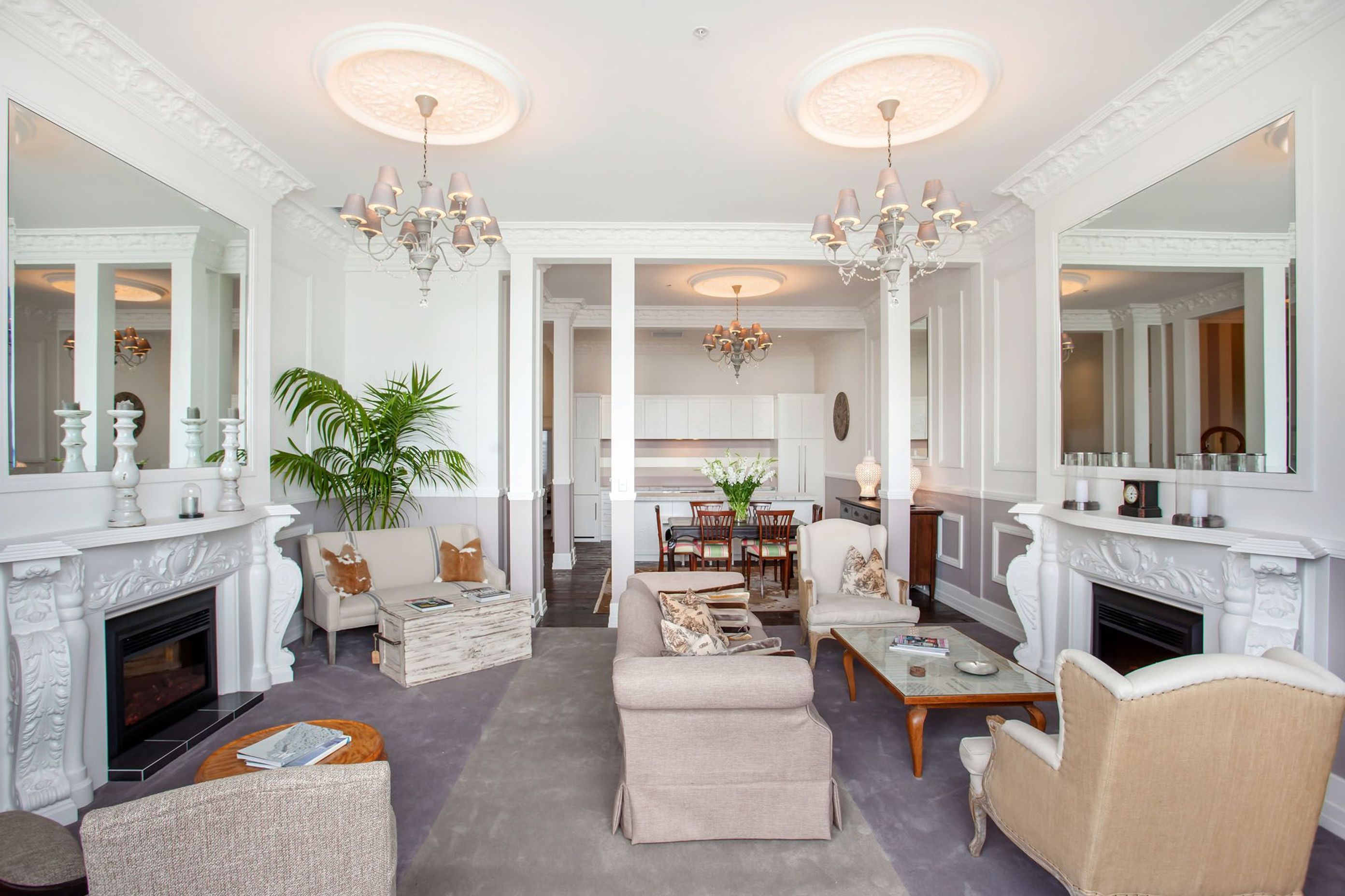 ArchiPro Project Summary - Transformation of a spacious penthouse into a Parisian style apartment featuring elegant moldings, paneling, and a soft color palette, complemented by custom damask-inspired kitchen cabinetry and a dignified entrance foyer.