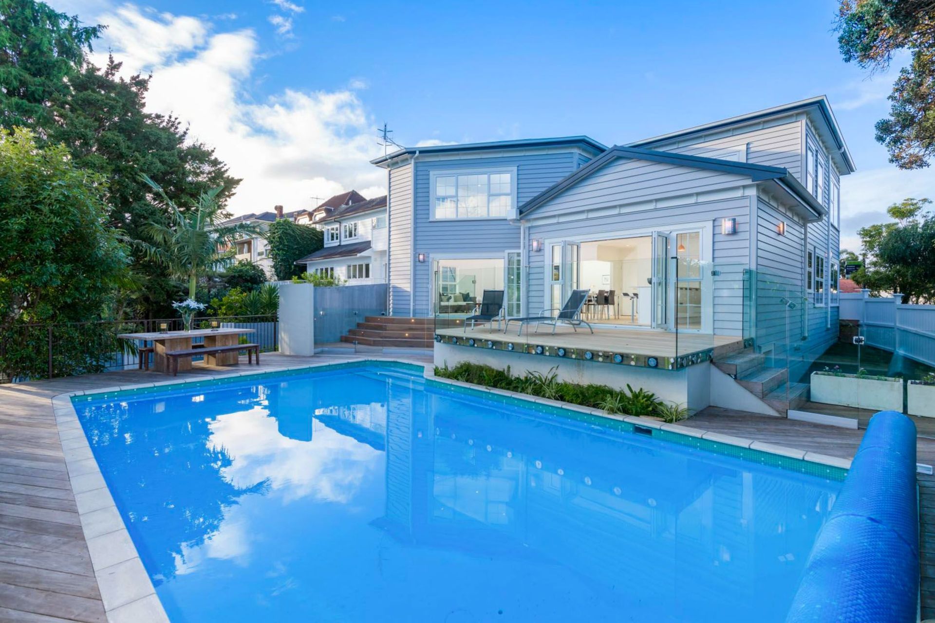 ArchiPro Project Summary - The Parnell Home is a luxurious villa featuring eco-friendly design, a stunning blue facade, and a magnificent swimming pool, all set within a serene estate.