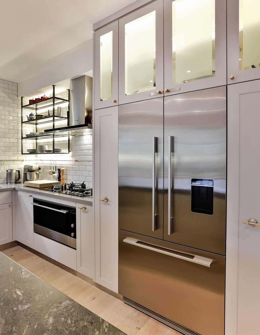 ArchiPro Project Summary - A sophisticated kitchen design that blends traditional London aesthetics with modern functionality, featuring elegant panelled doors, steel and brass finishes, and seamless integration with open-plan living spaces for entertaining and everyday use.