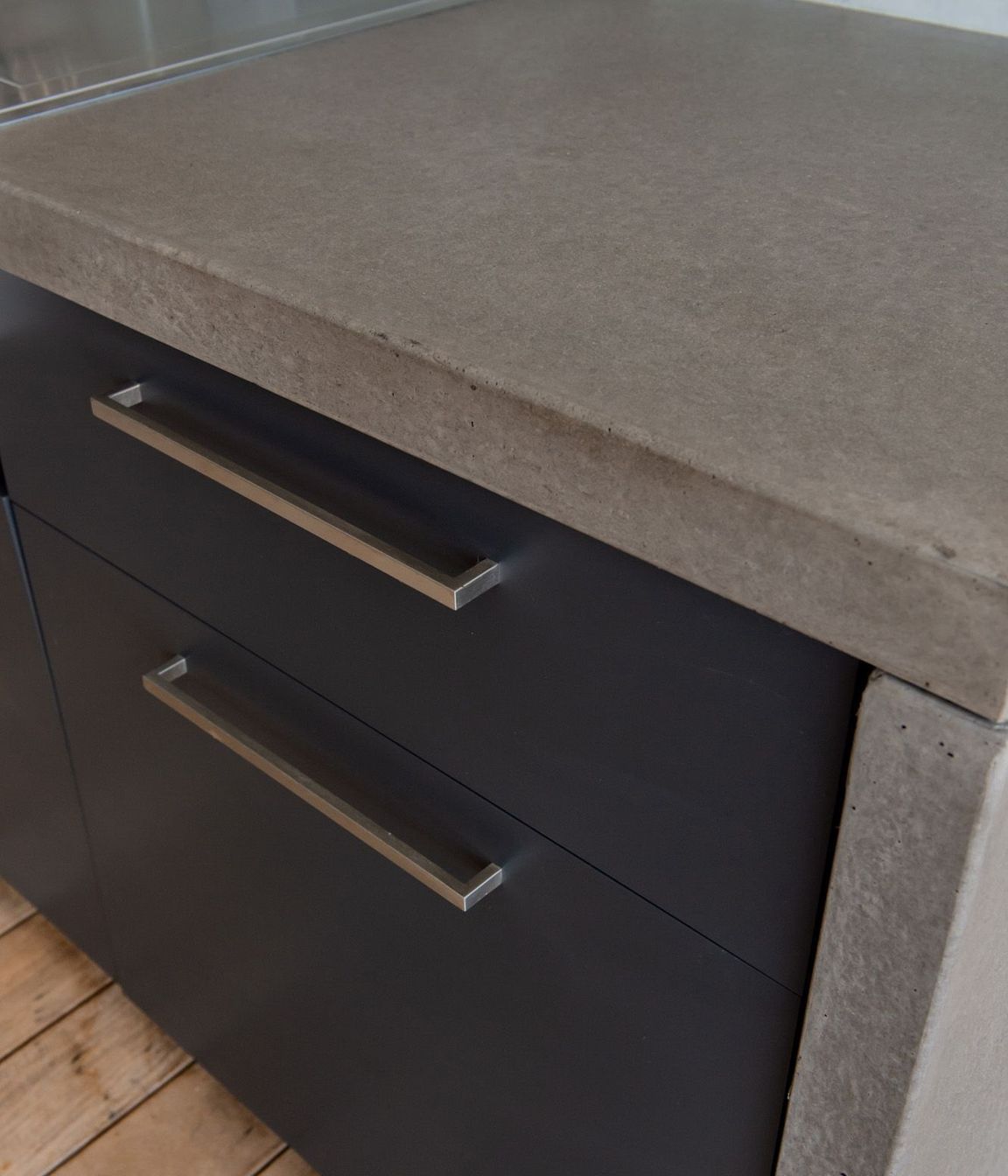 ArchiPro Project Summary - A beautifully designed outdoor cooking setup featuring a BBQ, organized cutlery drawers, gas bottle storage, and a wall-mounted vented rangehood, all complemented by a stunning solid colored concrete bench top for the ultimate Kiwi summer experience.