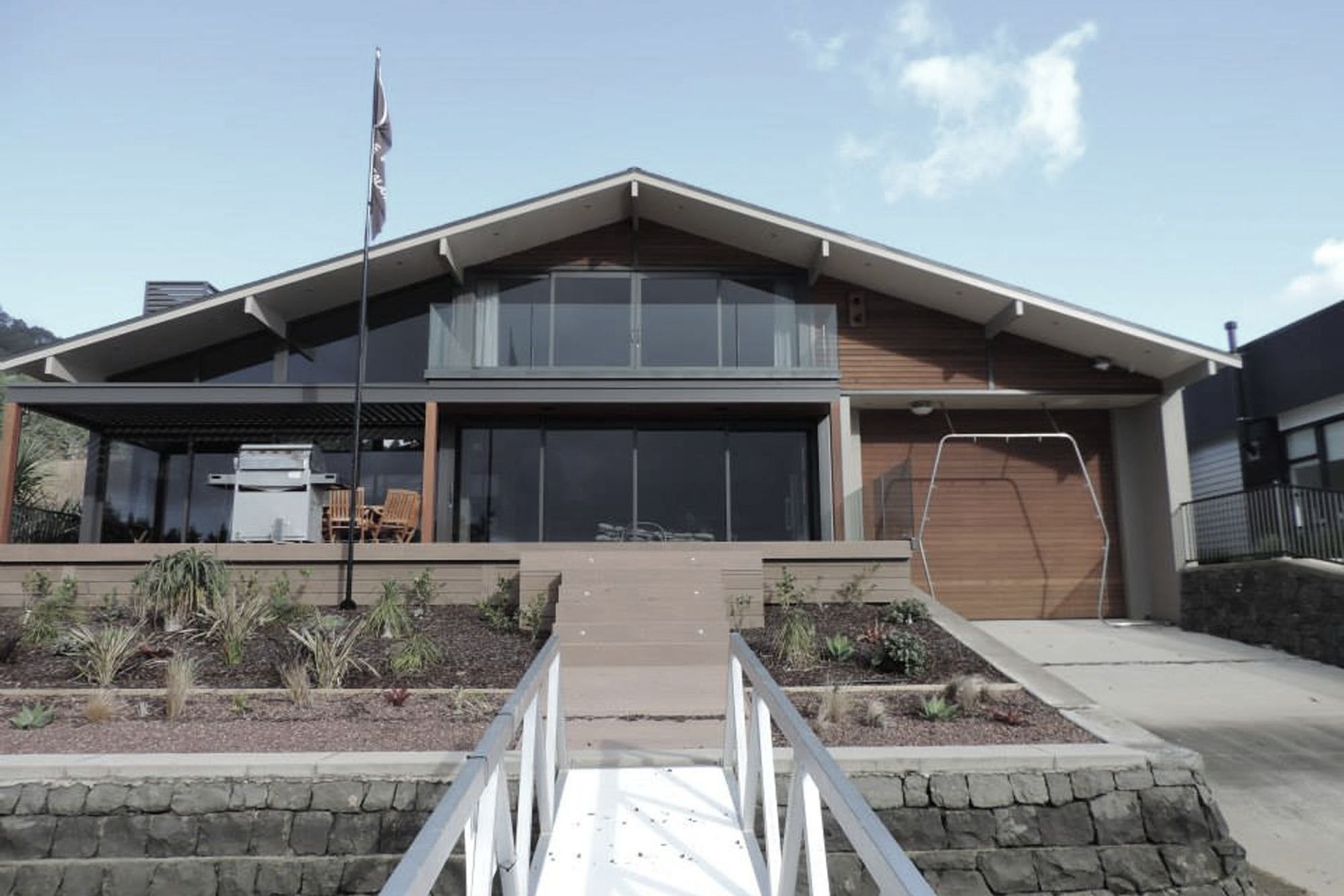 ArchiPro Project Summary - The Pauanui Home showcases modern design with natural elements, featuring a wood and concrete exterior and a beautifully crafted roof.