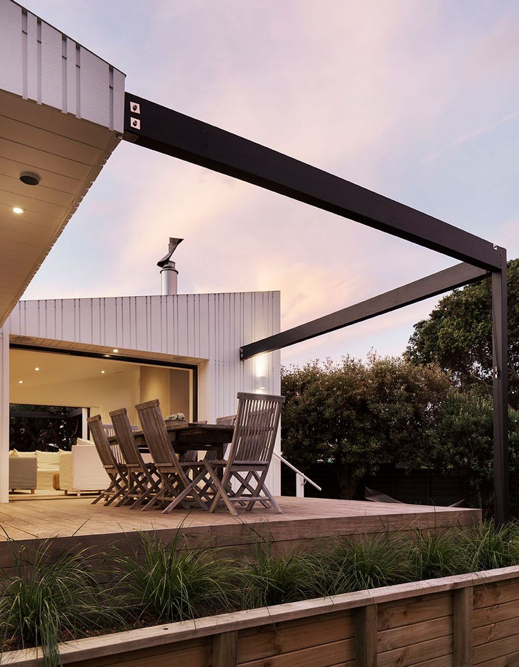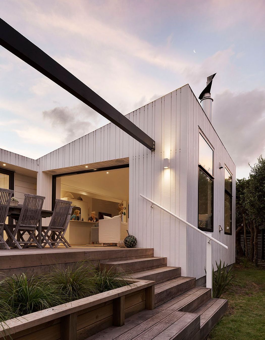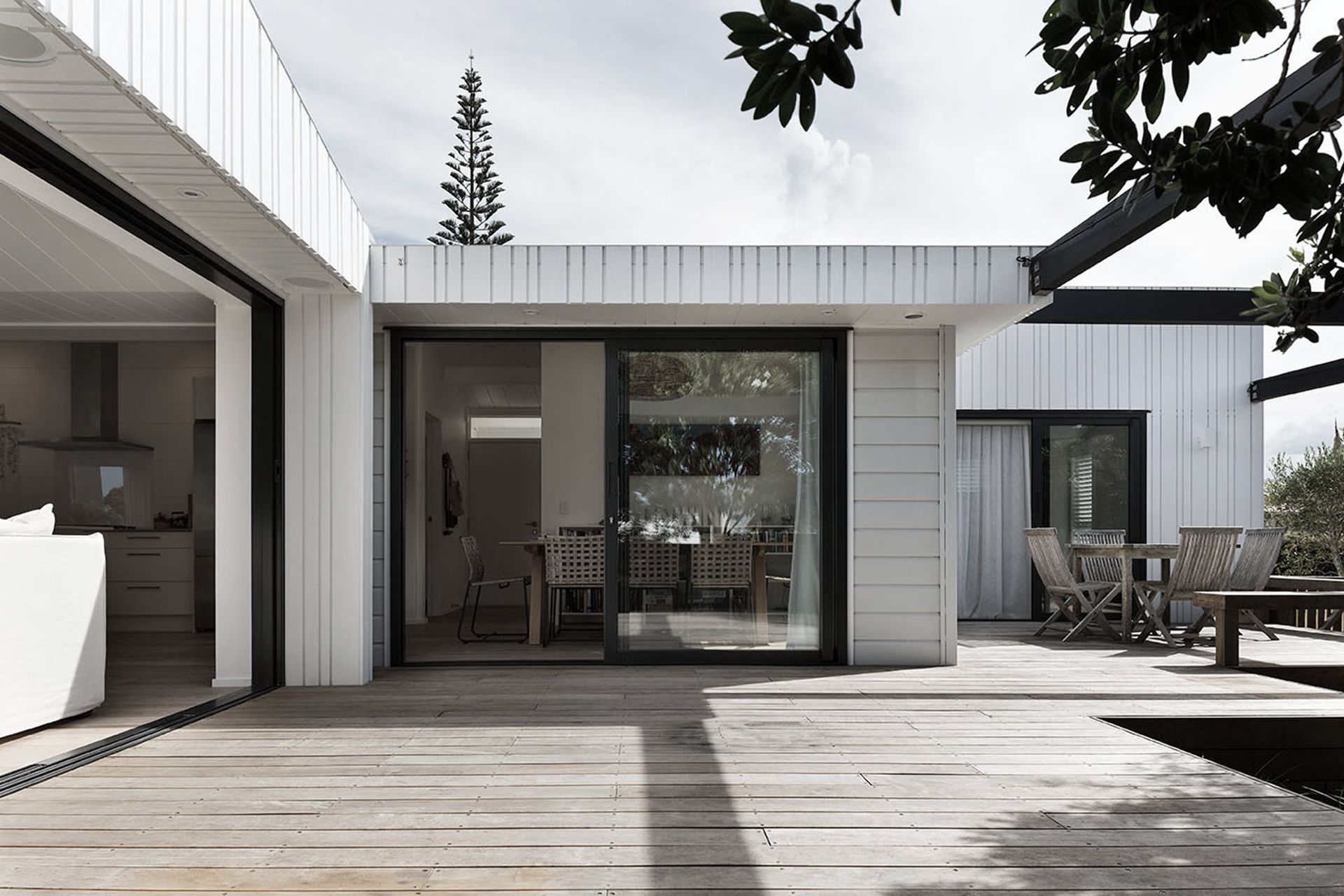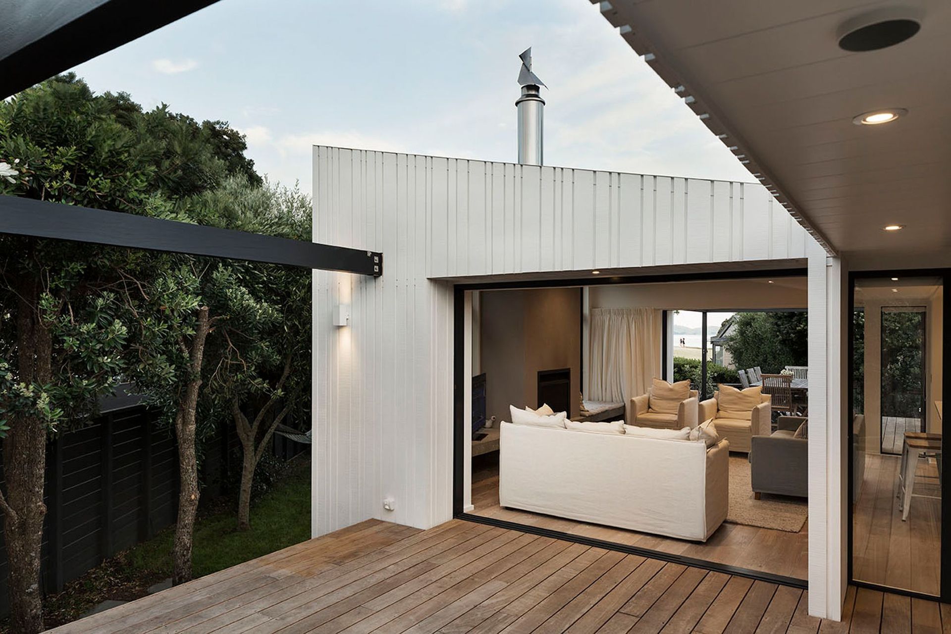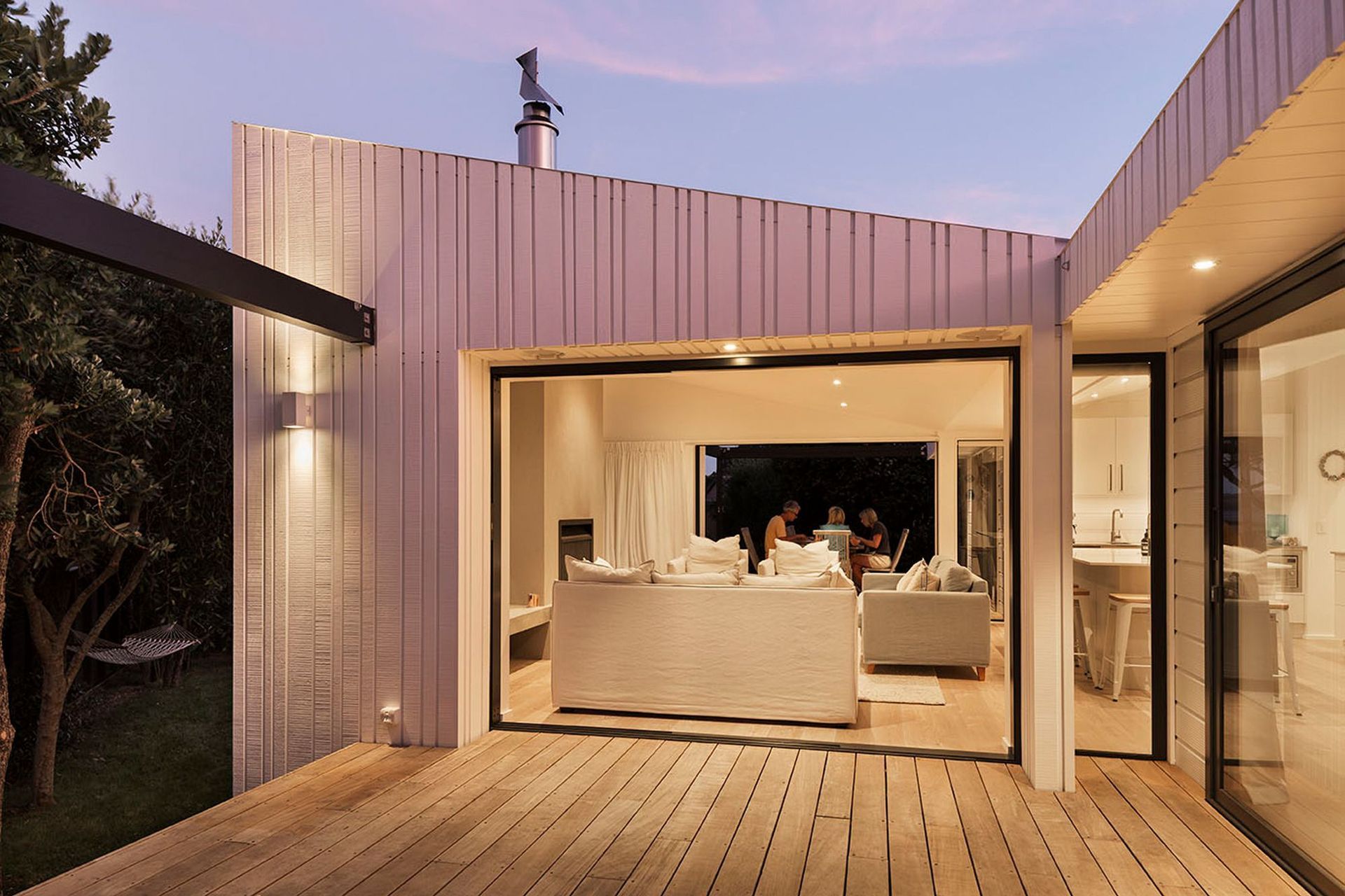 ArchiPro Project Summary - Transforming an existing lockwood bach into a spacious retreat with distinct outdoor entertainment areas and an inspiring roofline, featuring a new rainscreen that harmoniously blends the old with the new.