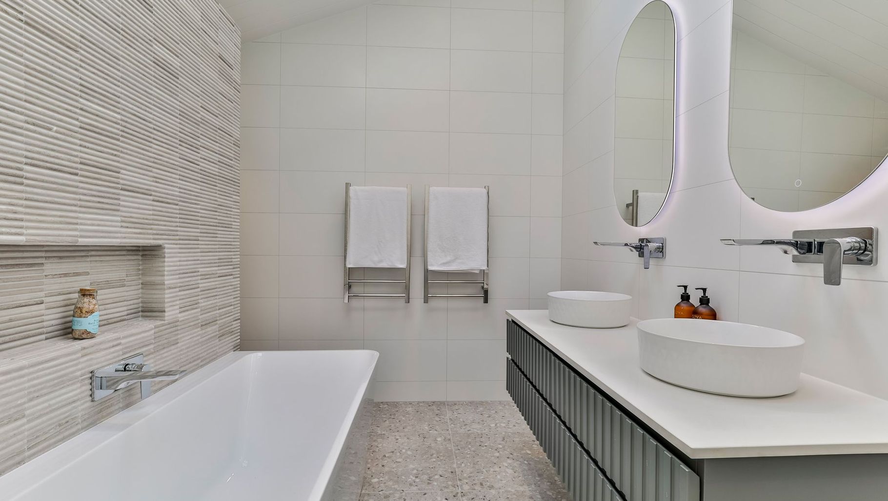 ArchiPro Project Summary - The Pauanui Project showcases four exquisite bathrooms designed by Emblazon Interior Design Studio, featuring ashy beige tones and reeded textures that embody coastal living, complemented by bespoke AP Vanities and expert craftsmanship from Arctiling NZ.