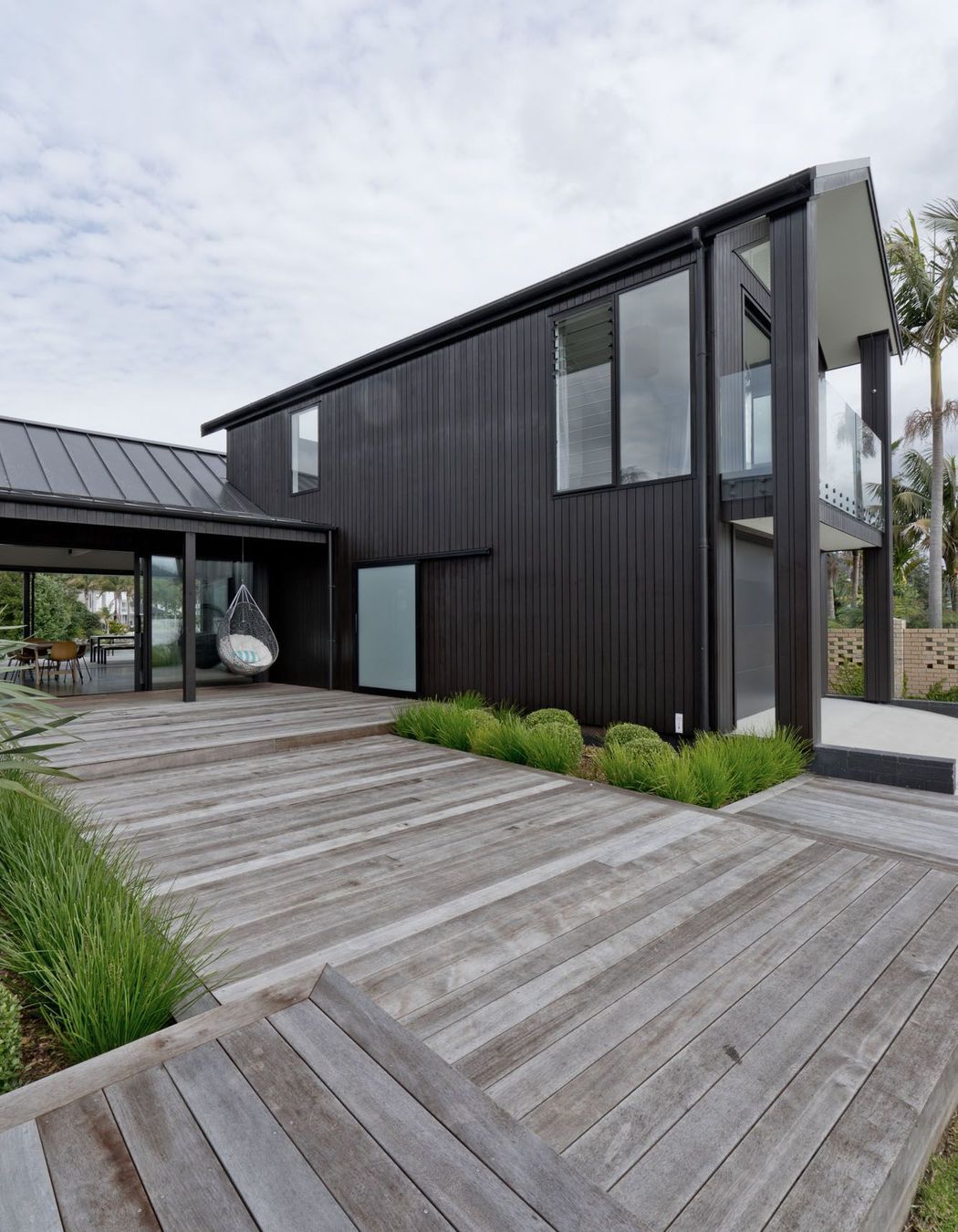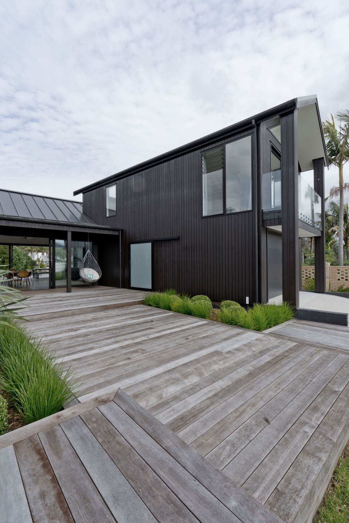 ArchiPro Project Summary - A timeless holiday home featuring black cedar vertical weatherboards and woodgrain precast concrete panels, designed for seamless indoor-outdoor living along the picturesque waterways and harbourside.
