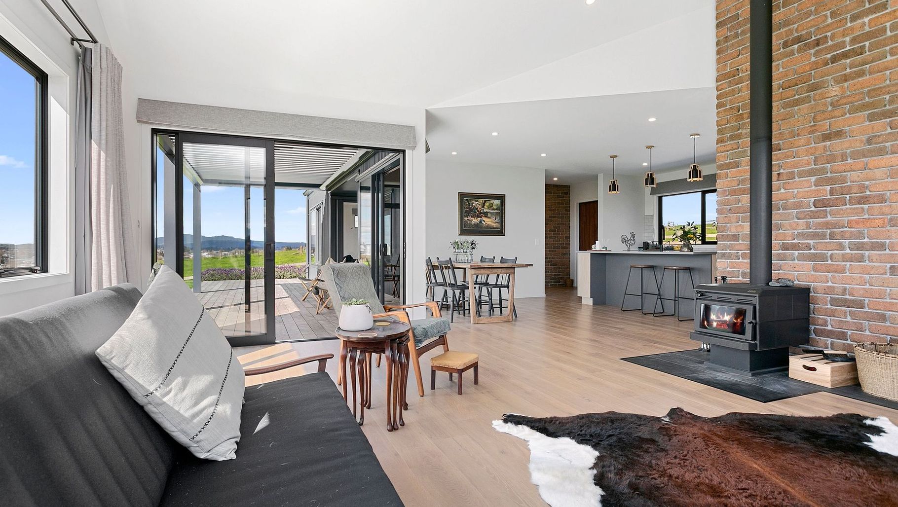 ArchiPro Project Summary - Tranquil three-bedroom home in Te Awamutu with stunning views of Mount Pirongia, featuring open-plan living, two outdoor decks, hardwood floors, high-stud ceilings, a cozy wood fire, and a beautifully tiled bathroom.