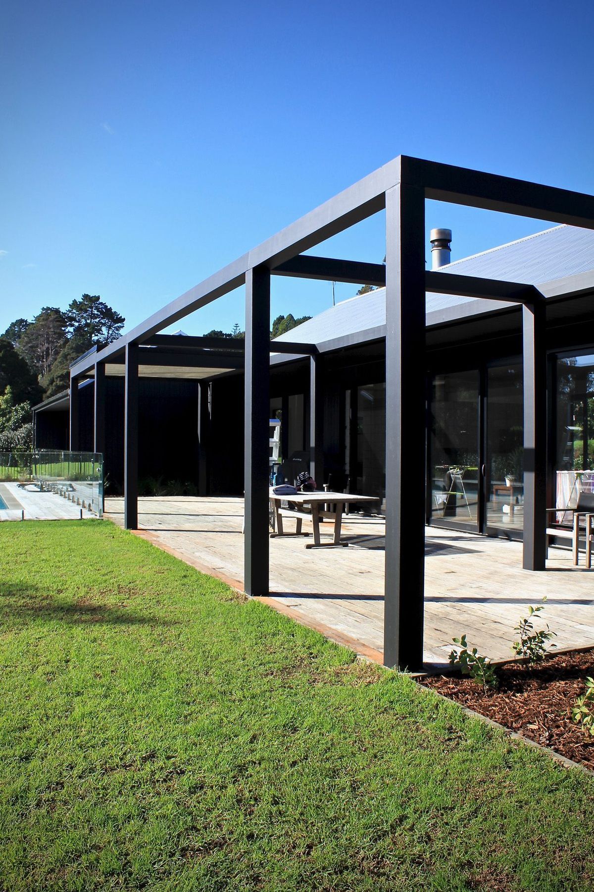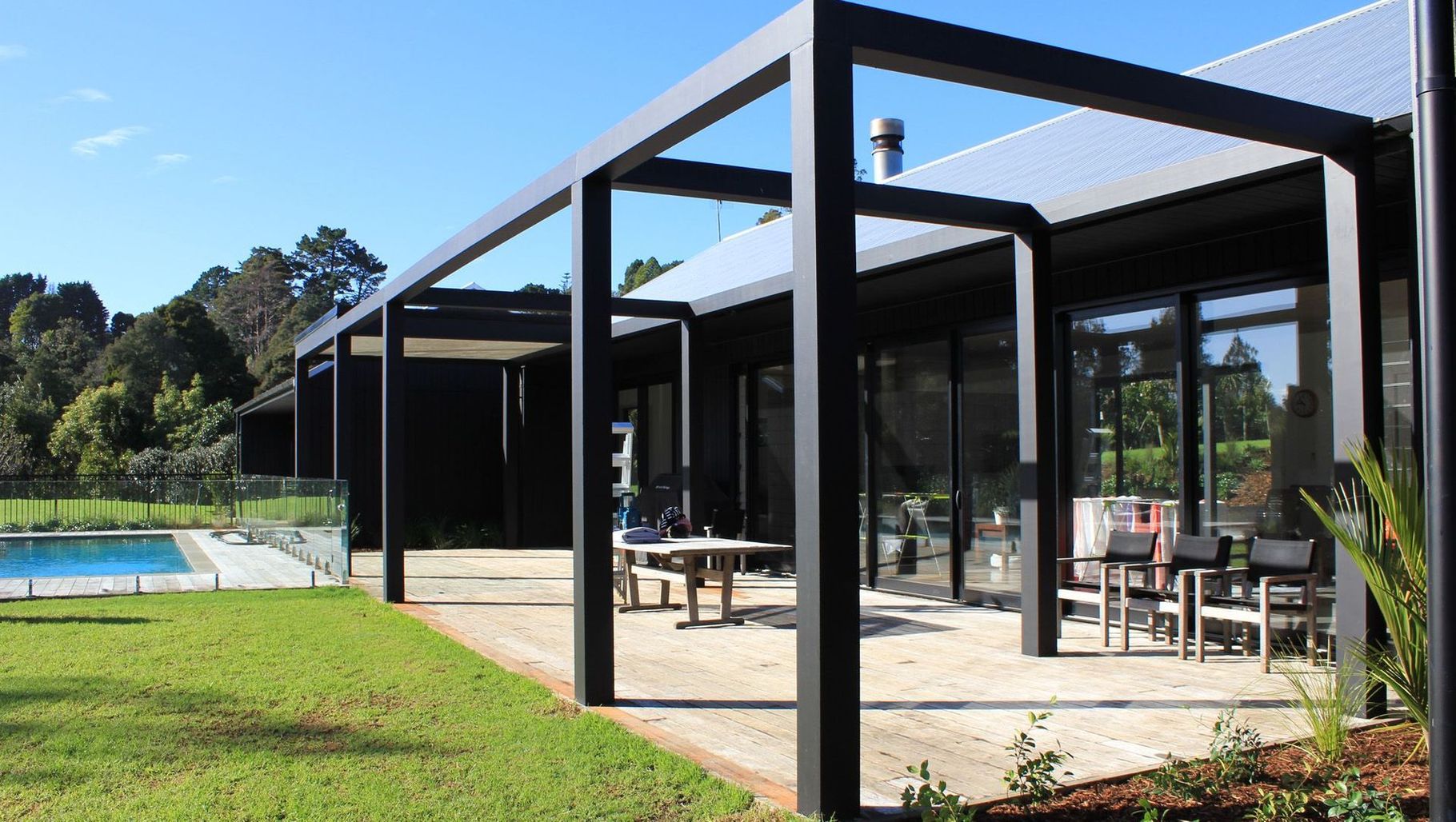 ArchiPro Project Summary - Elegant pergola design enhancing indoor-outdoor flow, featuring hidden connections and robust Glu Lam beams, seamlessly integrated with the existing home and deck, in collaboration with Humphrys Landscapes.