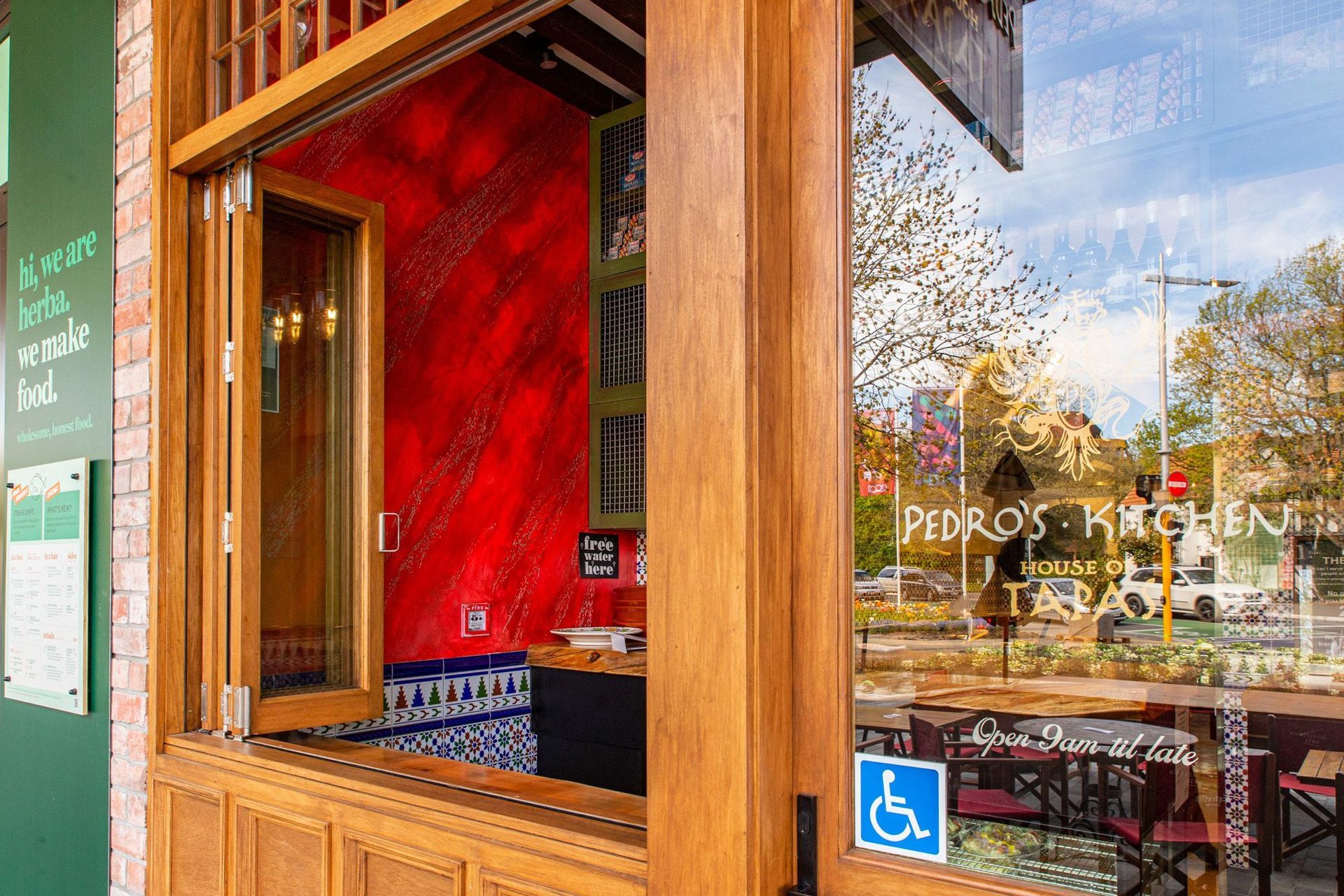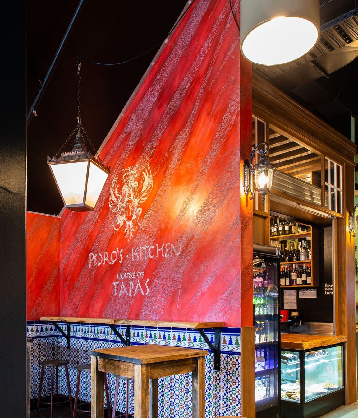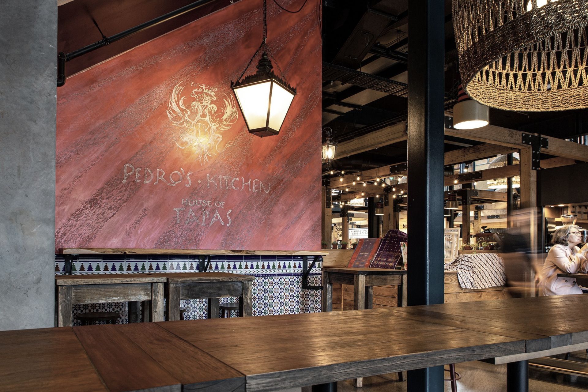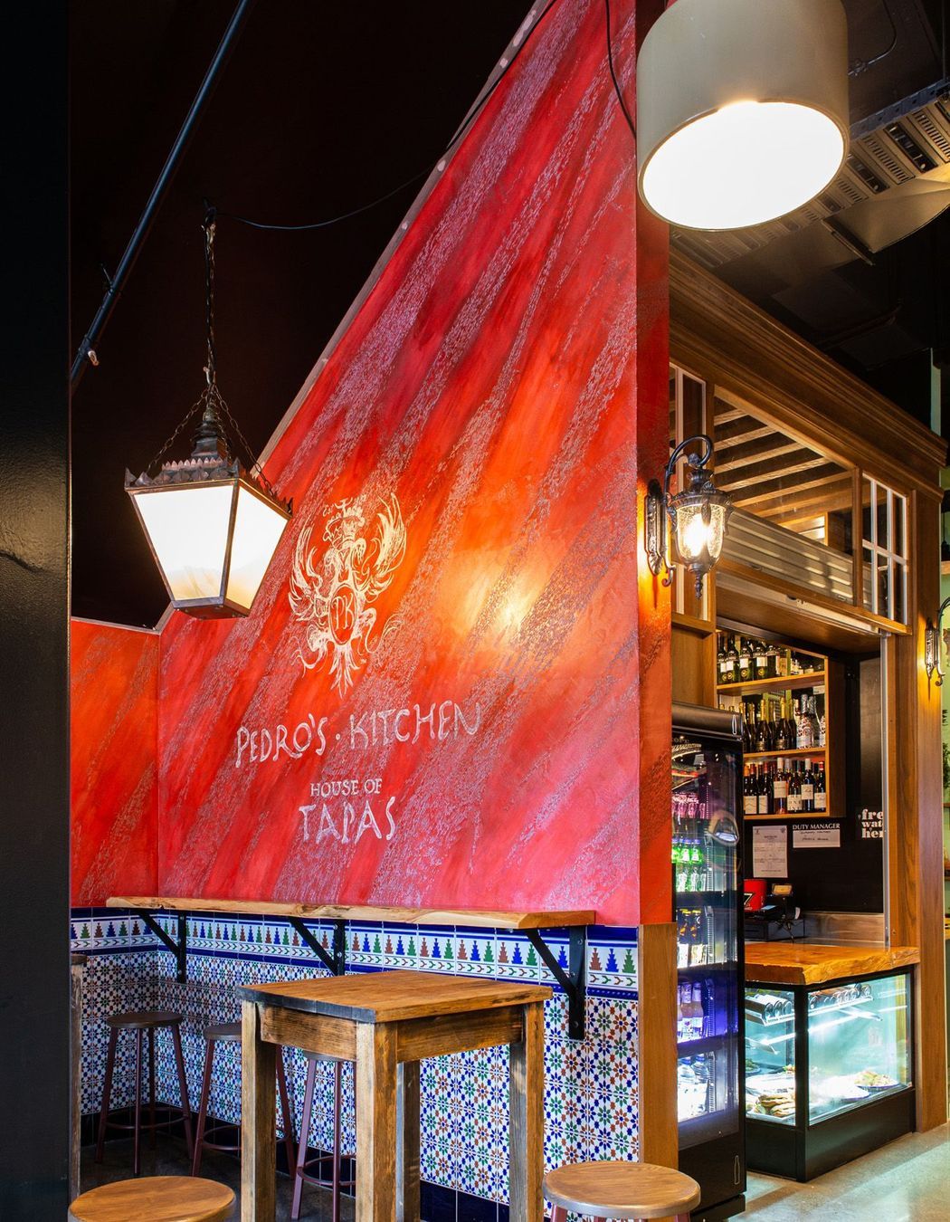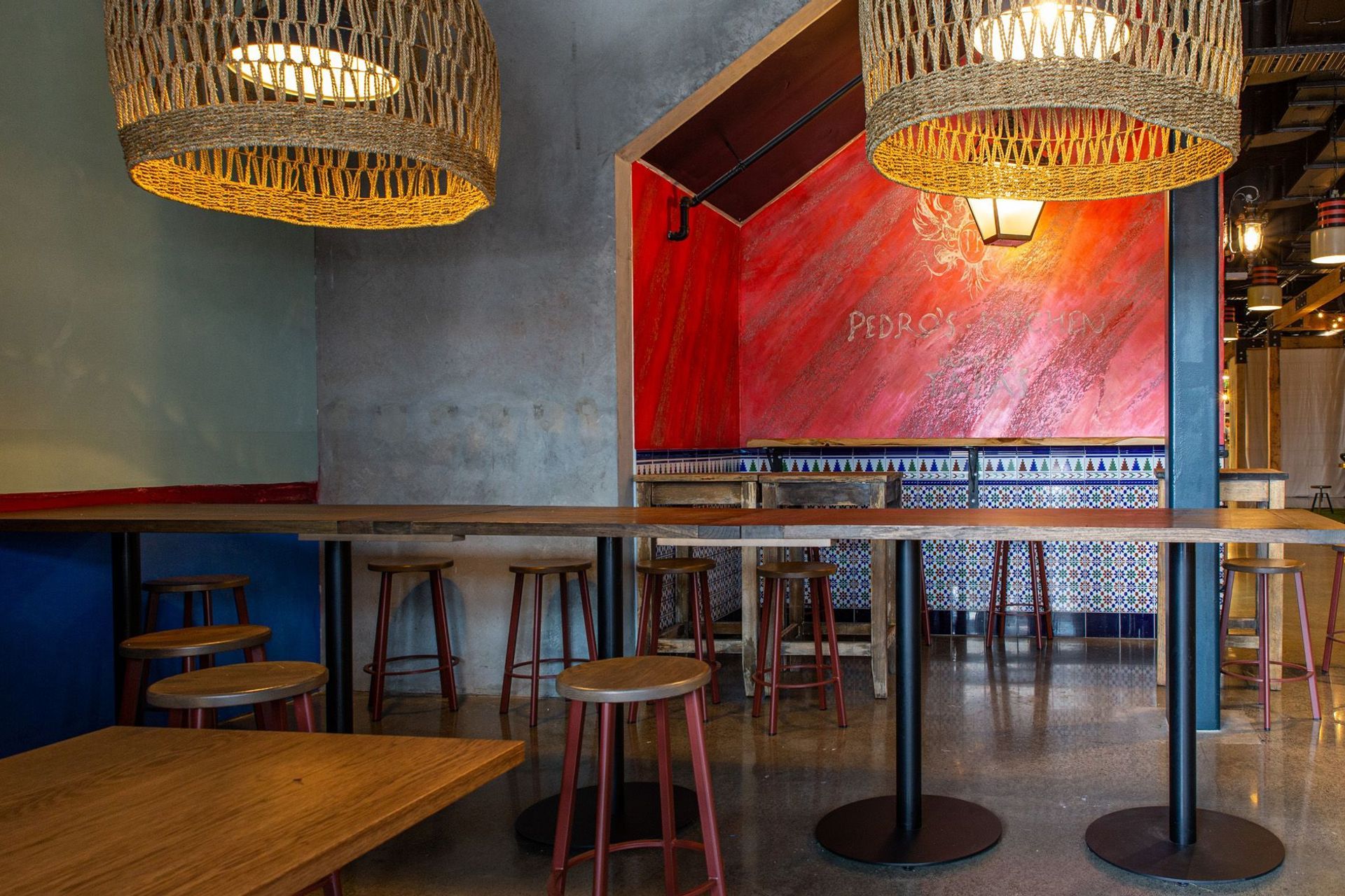 ArchiPro Project Summary - Unique polished plaster application in bold colors enhances the aesthetic of Pedros Kitchen, creating a distinctive atmosphere for this well-known eatery.