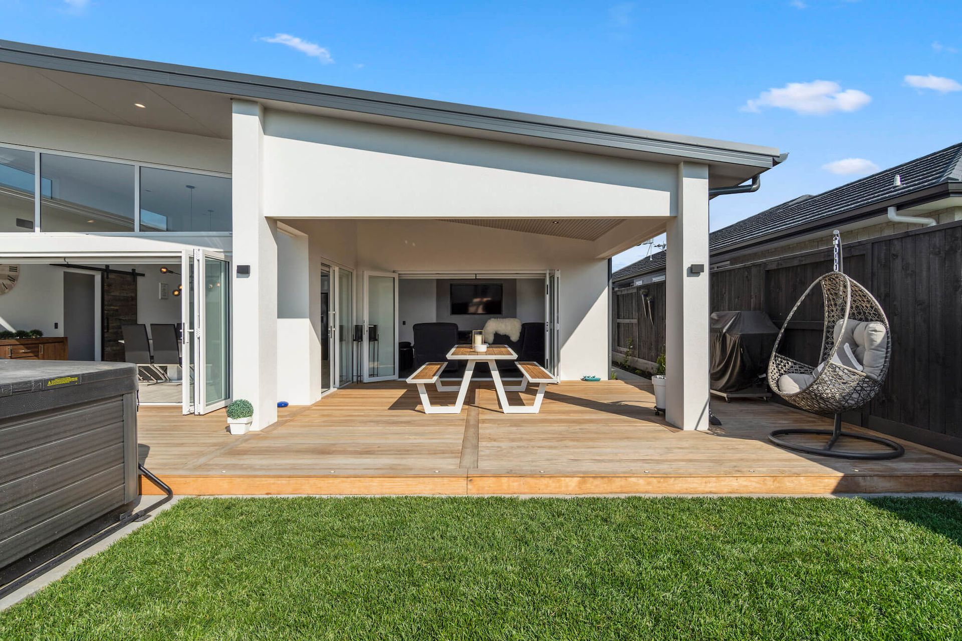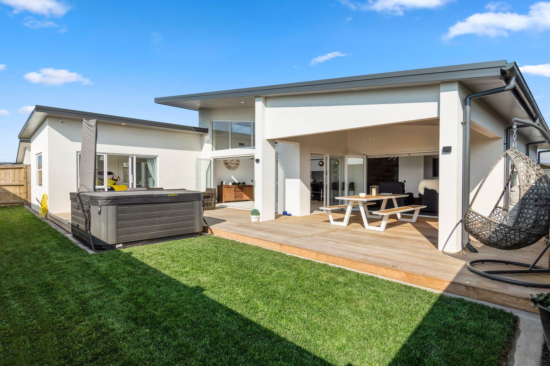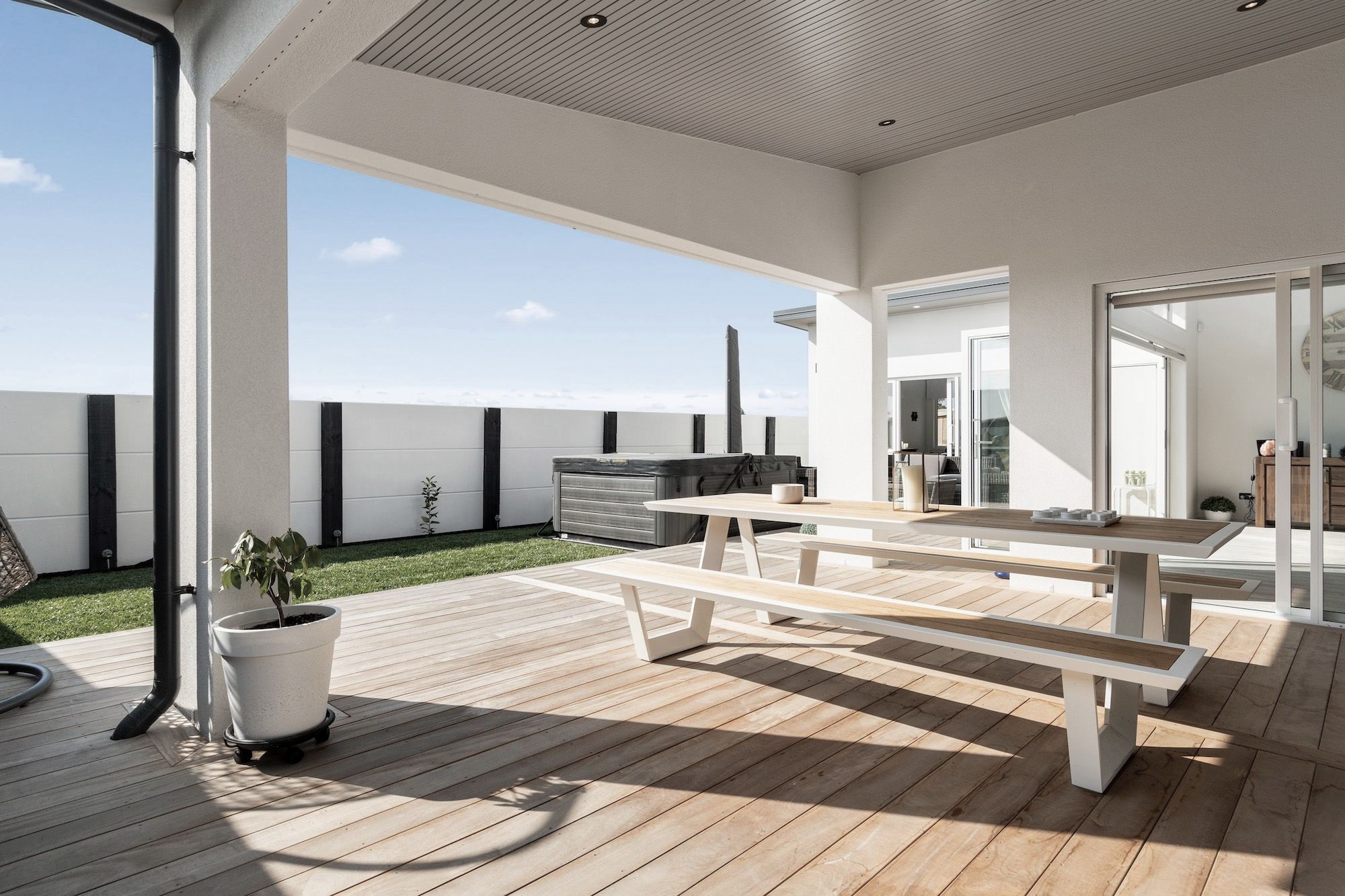 ArchiPro Project Summary - A modern monopitch design featuring functional living spaces and exceptional indoor-outdoor flow, complemented by a Sto Plaster System and Cedar Cladding for durability, alongside sleek Grapa Decking for a contemporary aesthetic.