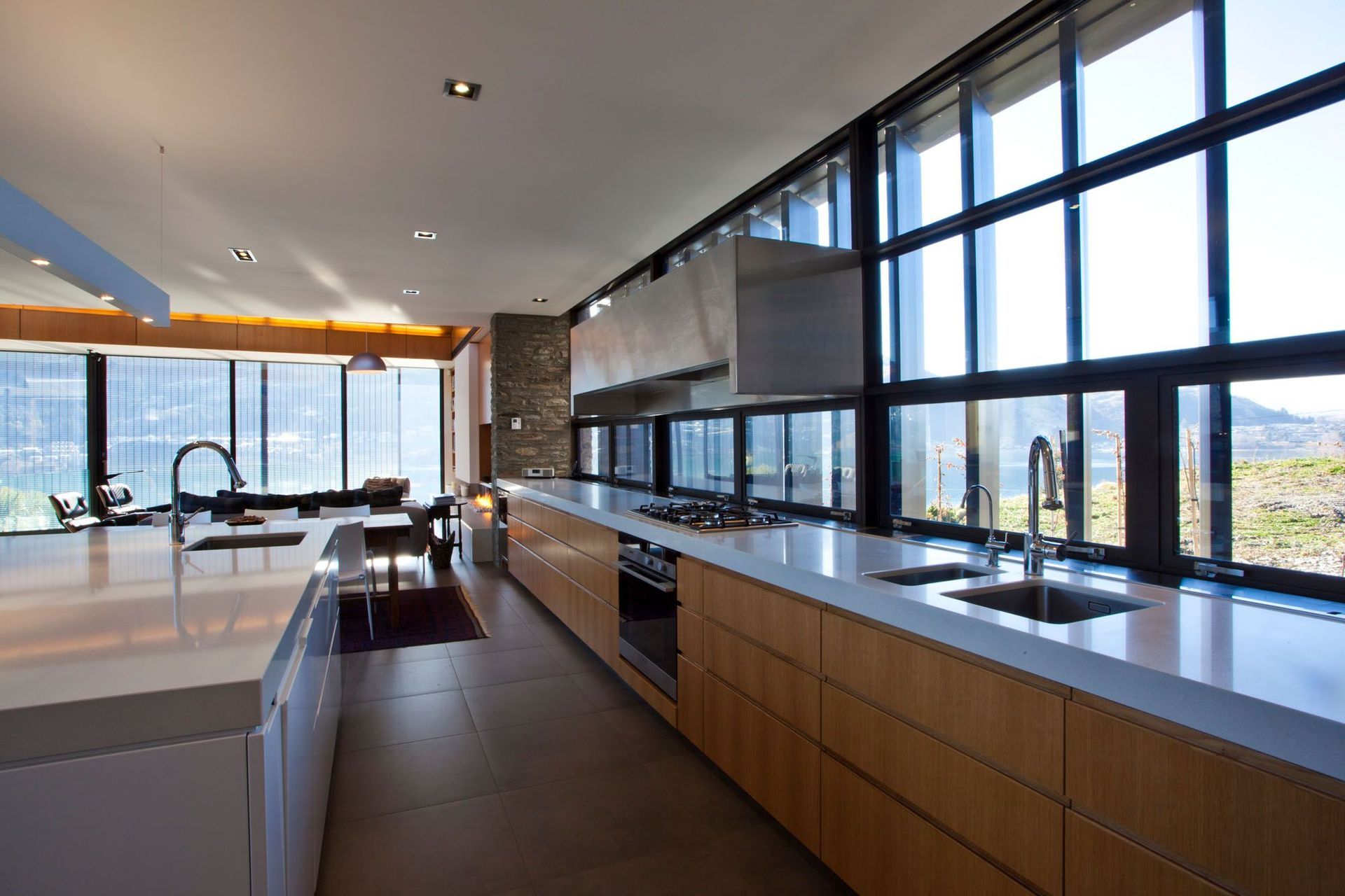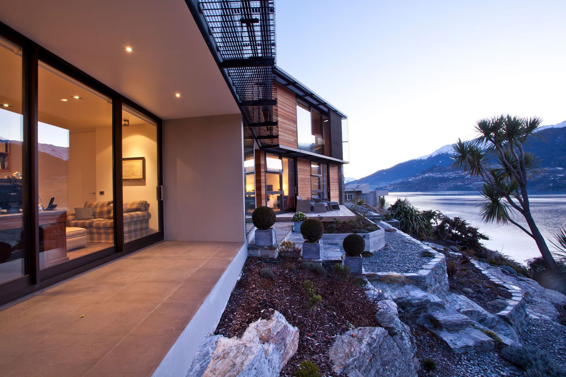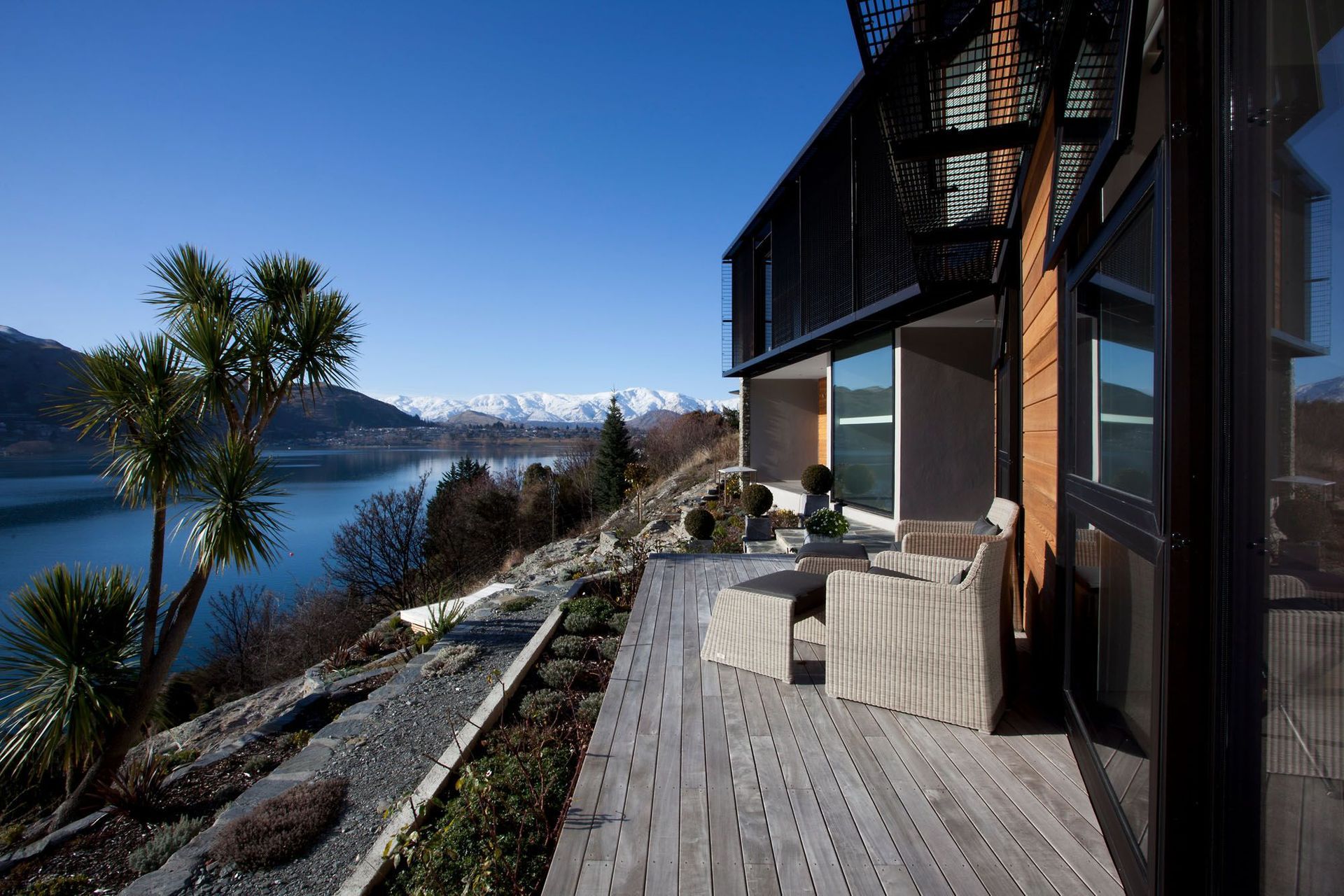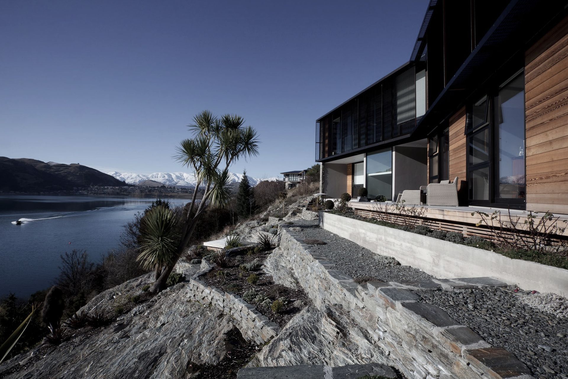 ArchiPro Project Summary - A masterfully designed residence by Warren & Mahoney Architects, seamlessly integrating with a challenging site while maximizing views of Lake Wakatipu through a fluid connection of indoor and outdoor spaces.